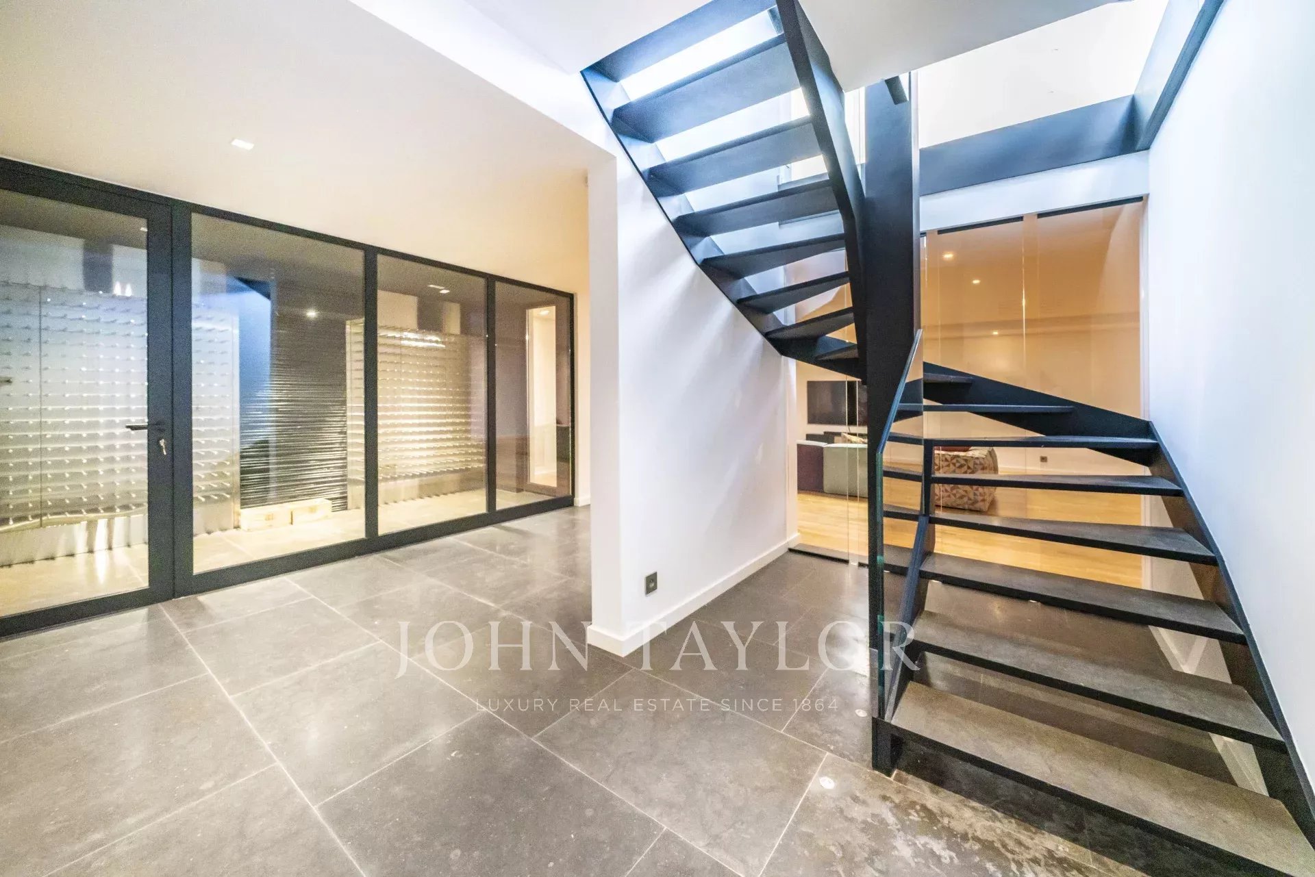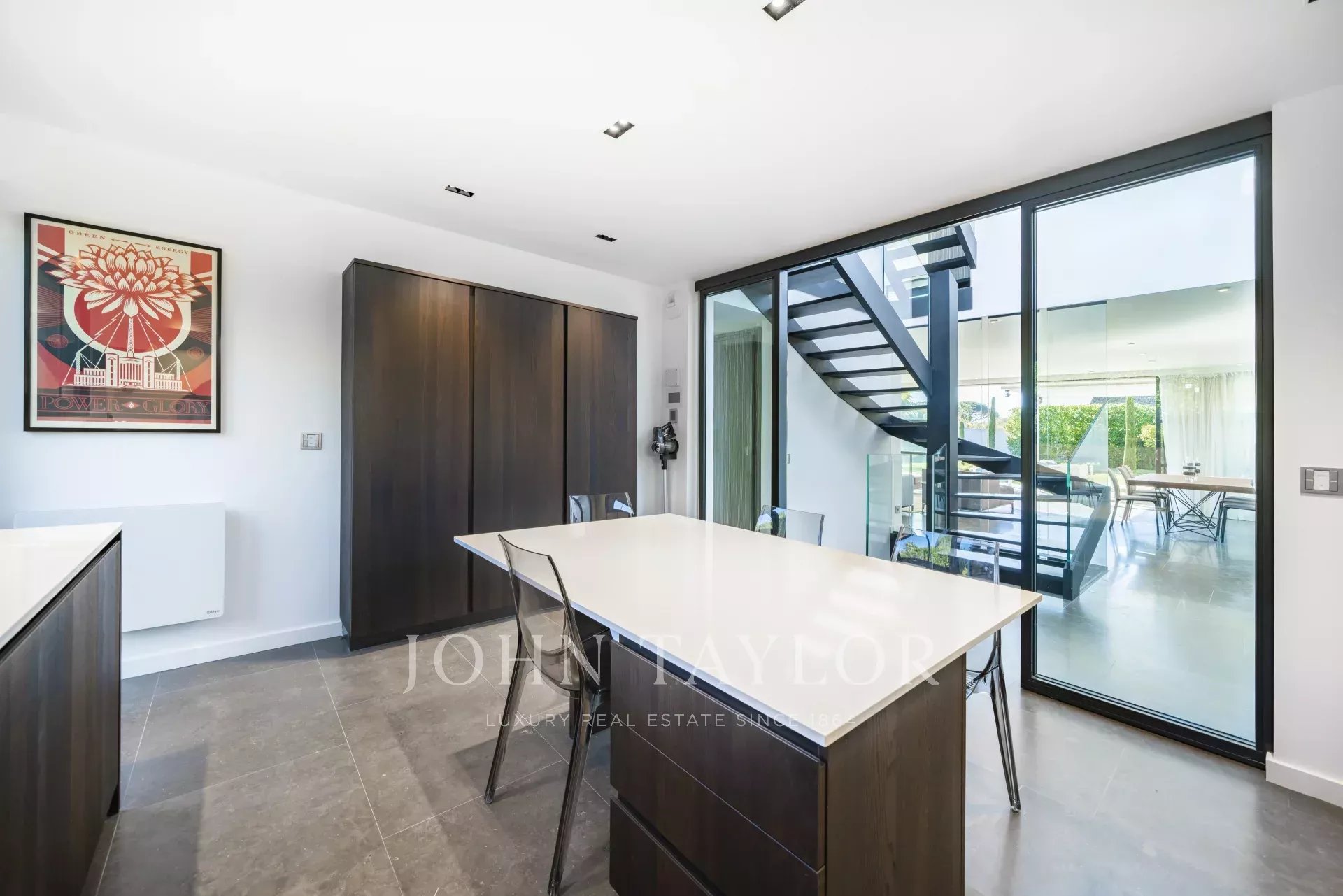 La entrada principal da acceso a un vestíbulo con la cocina a la izquierda; enfrente una escalera que conduce a la primera planta; un pasillo con un aseo de invitados y a la izquierda un dormitorio de invitados; a la derecha un gran espacio abierto que comprende el comedor y la sala de estar. El techo de cristal y los ventanales se abren totalmente al jardín, creando un maravilloso flujo interior-exterior.
