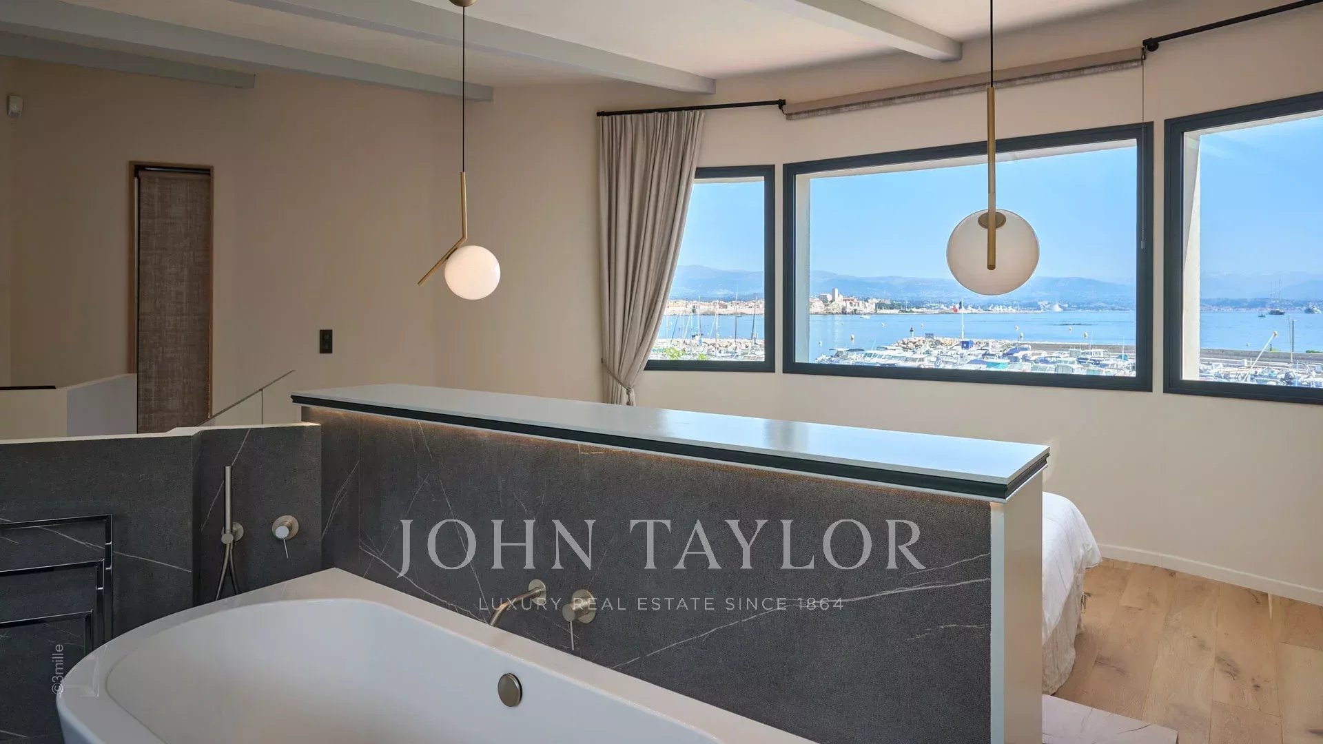 Habitación principal (cama doble), vista a la playa de Salis y al casco antiguo de Antibes - Cuarto de baño/WC abierto