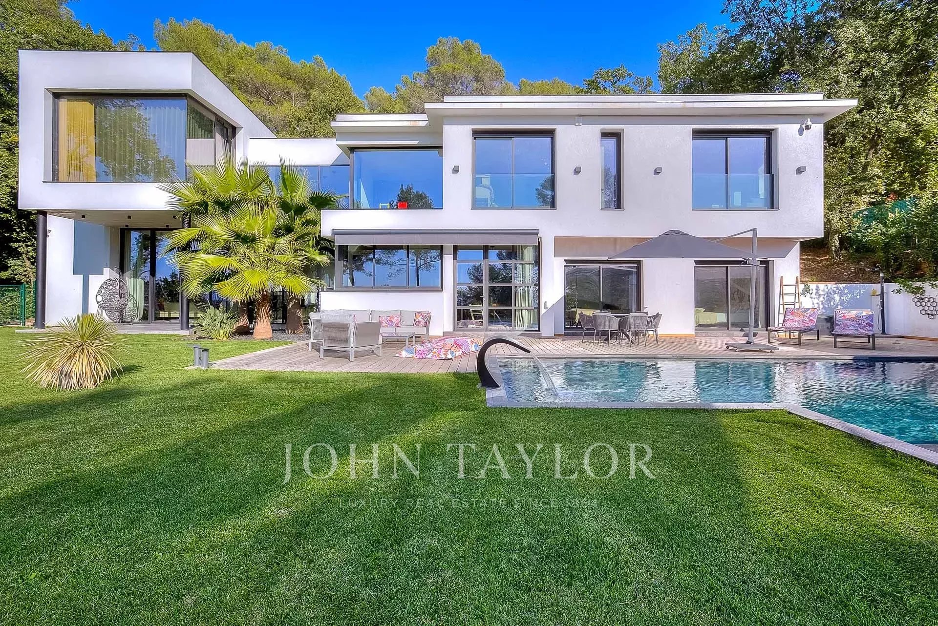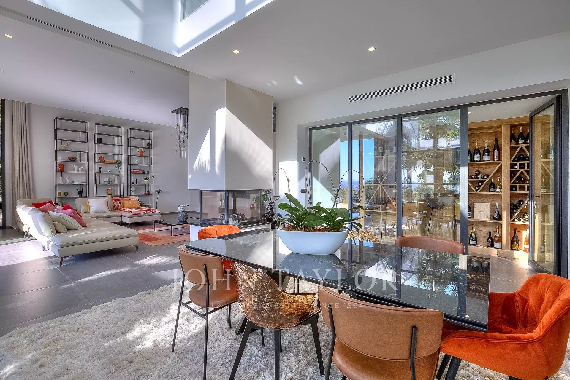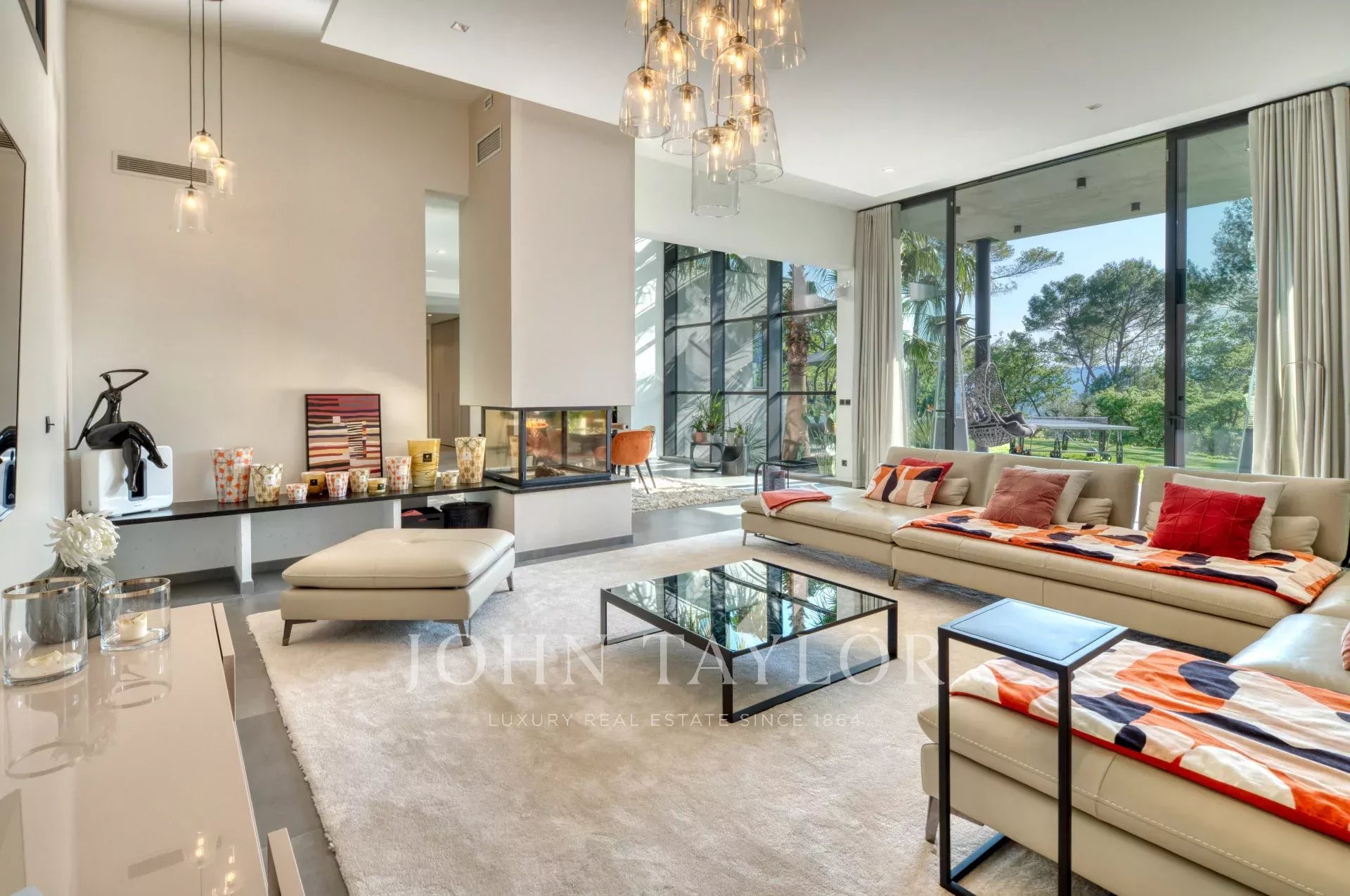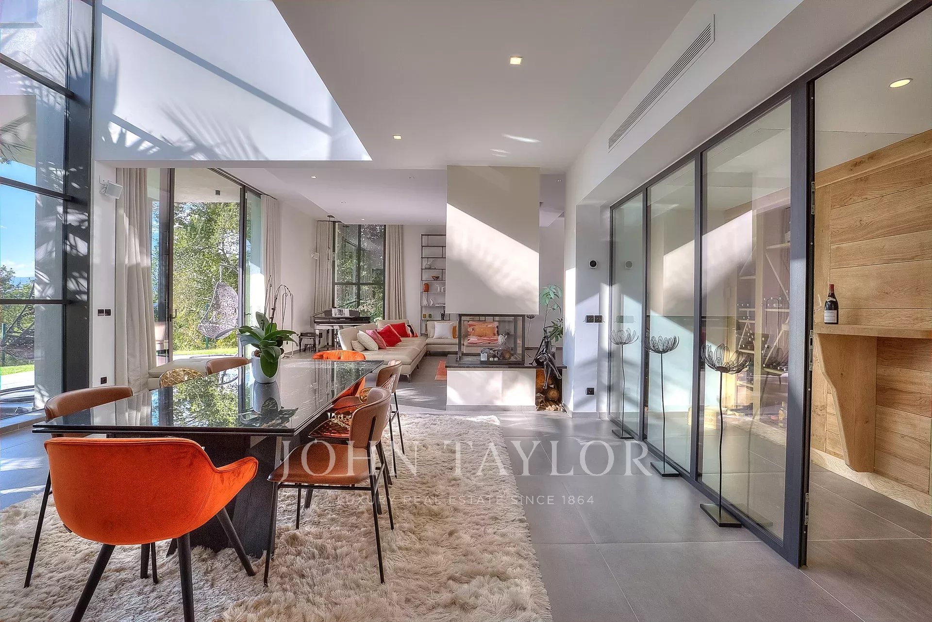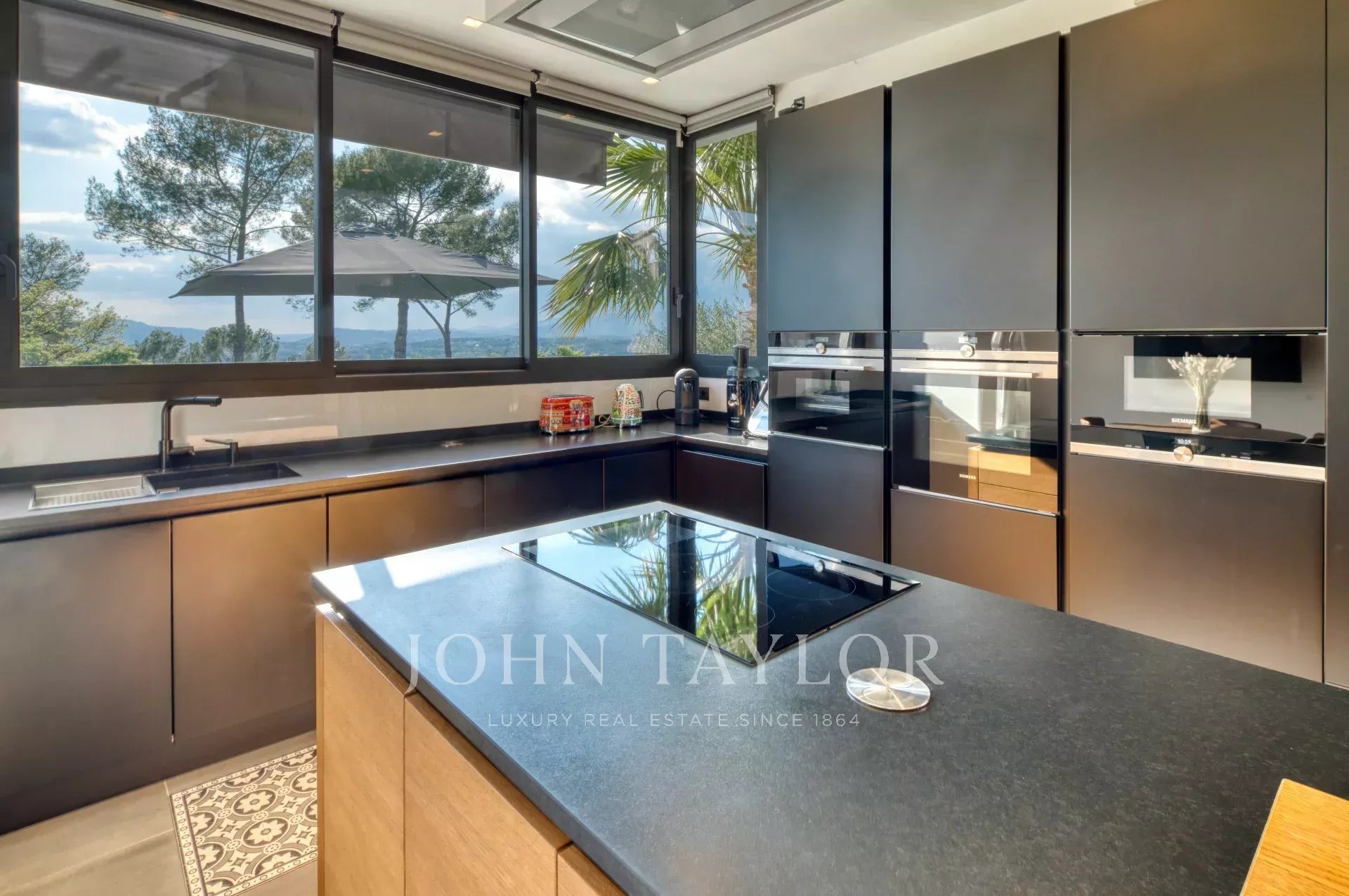 Esta hermosa villa contemporánea de 430 m² cerca de Mougins y Valbonne goza de una luminosidad excepcional gracias a sus enormes ventanales y a sus impresionantes vistas panorámicas.