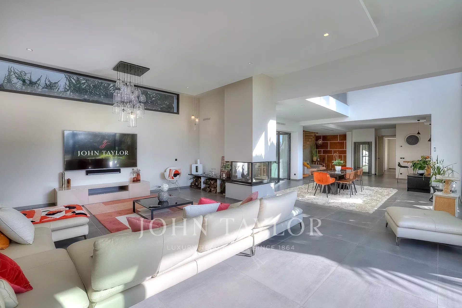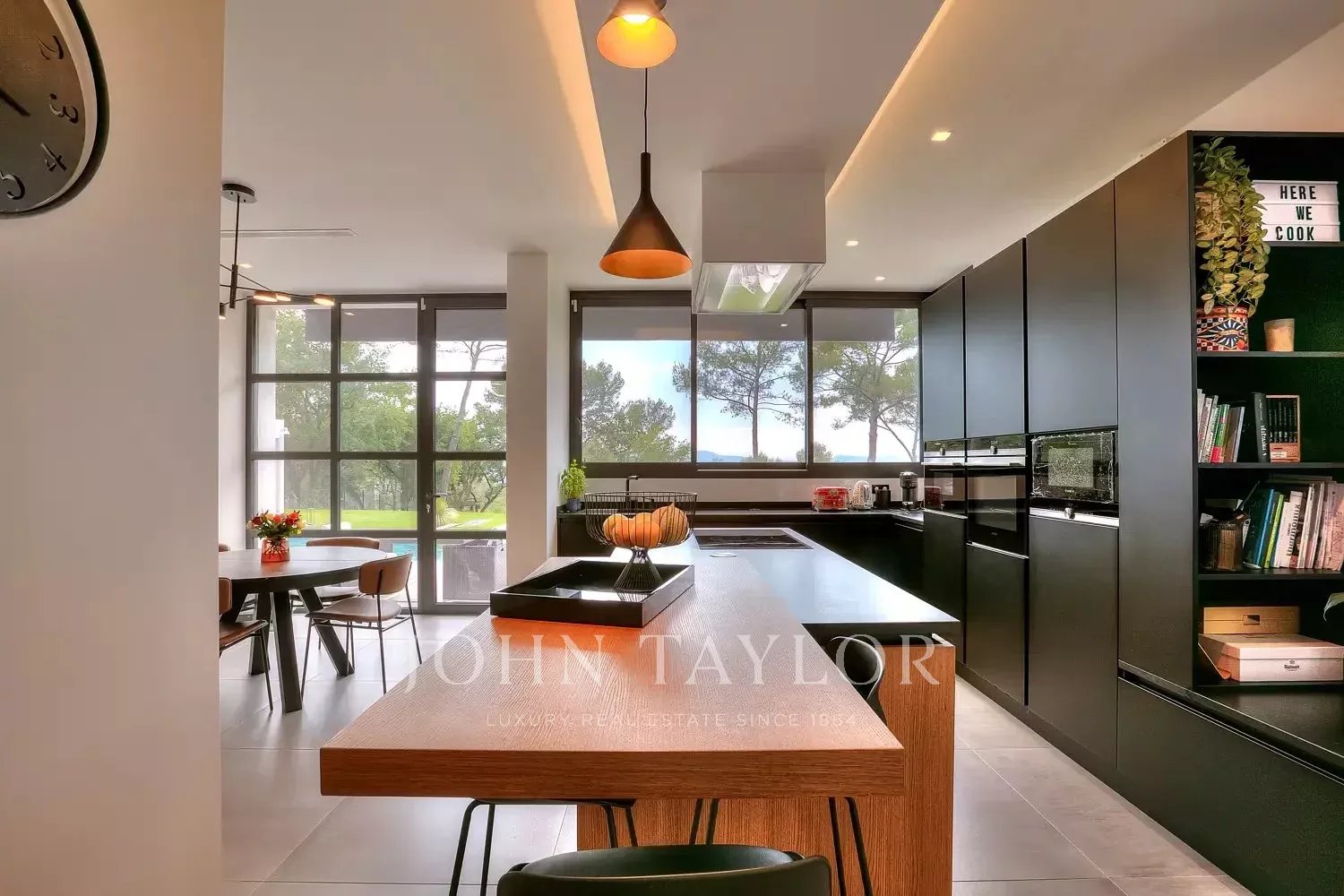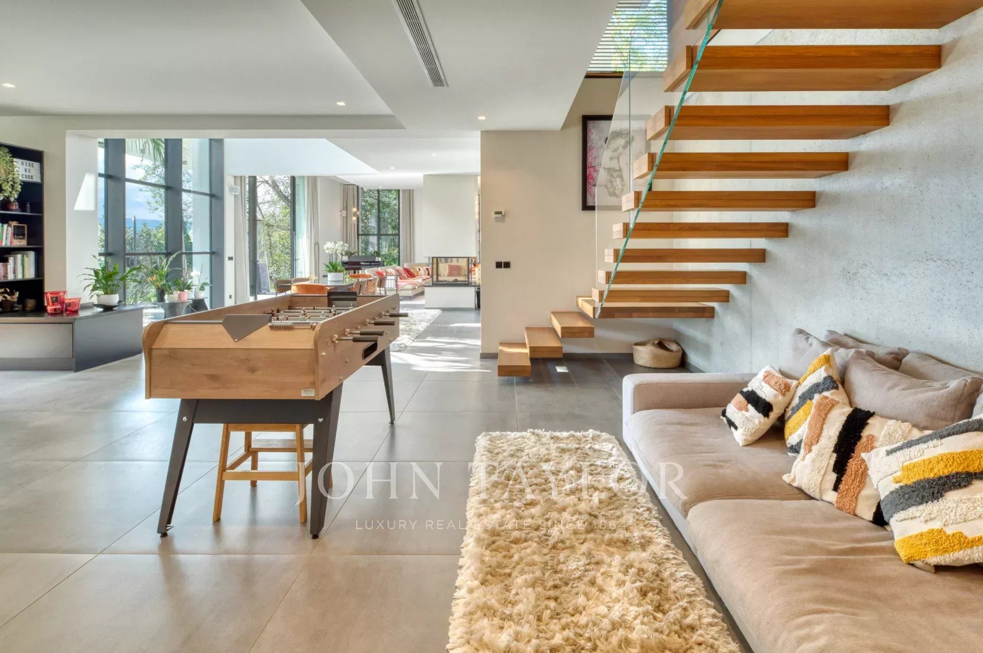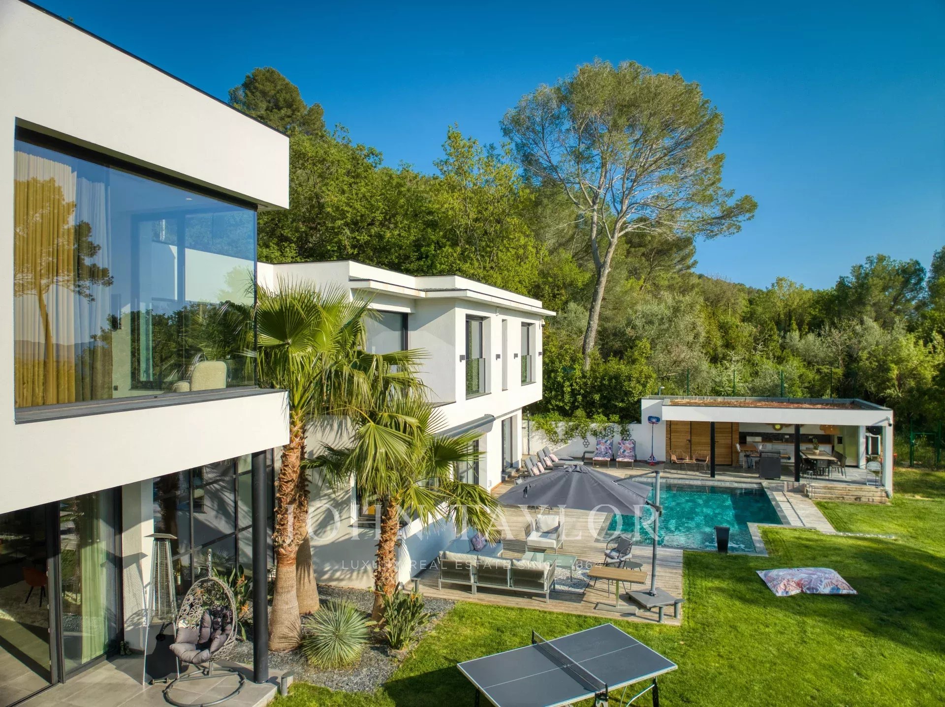 Esta hermosa villa contemporánea de 430 m² cerca de Mougins y Valbonne goza de una luminosidad excepcional gracias a sus enormes ventanales y a sus impresionantes vistas panorámicas.