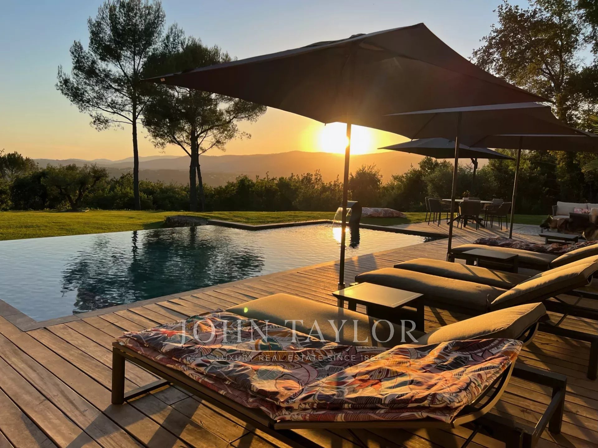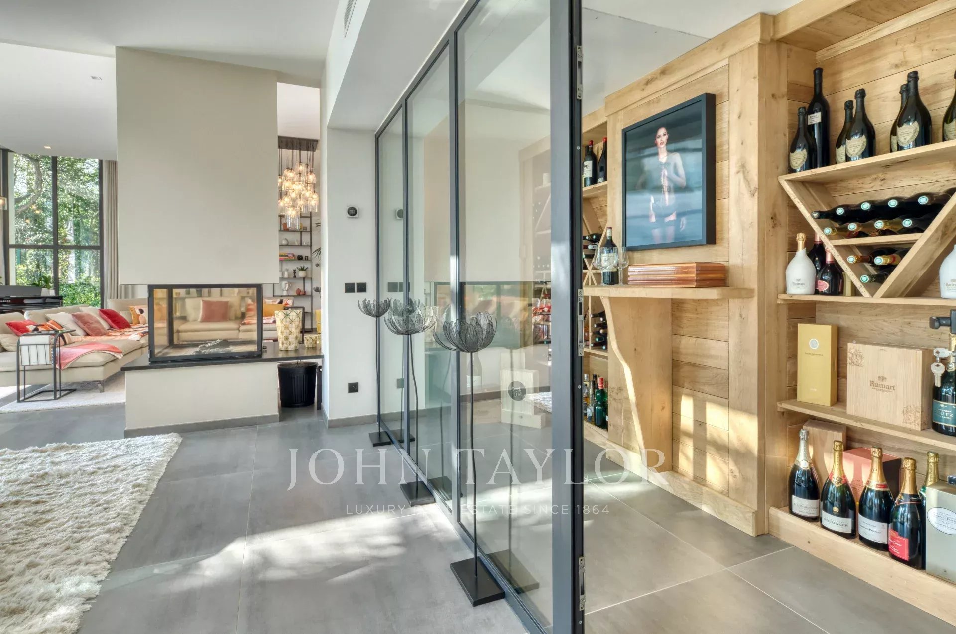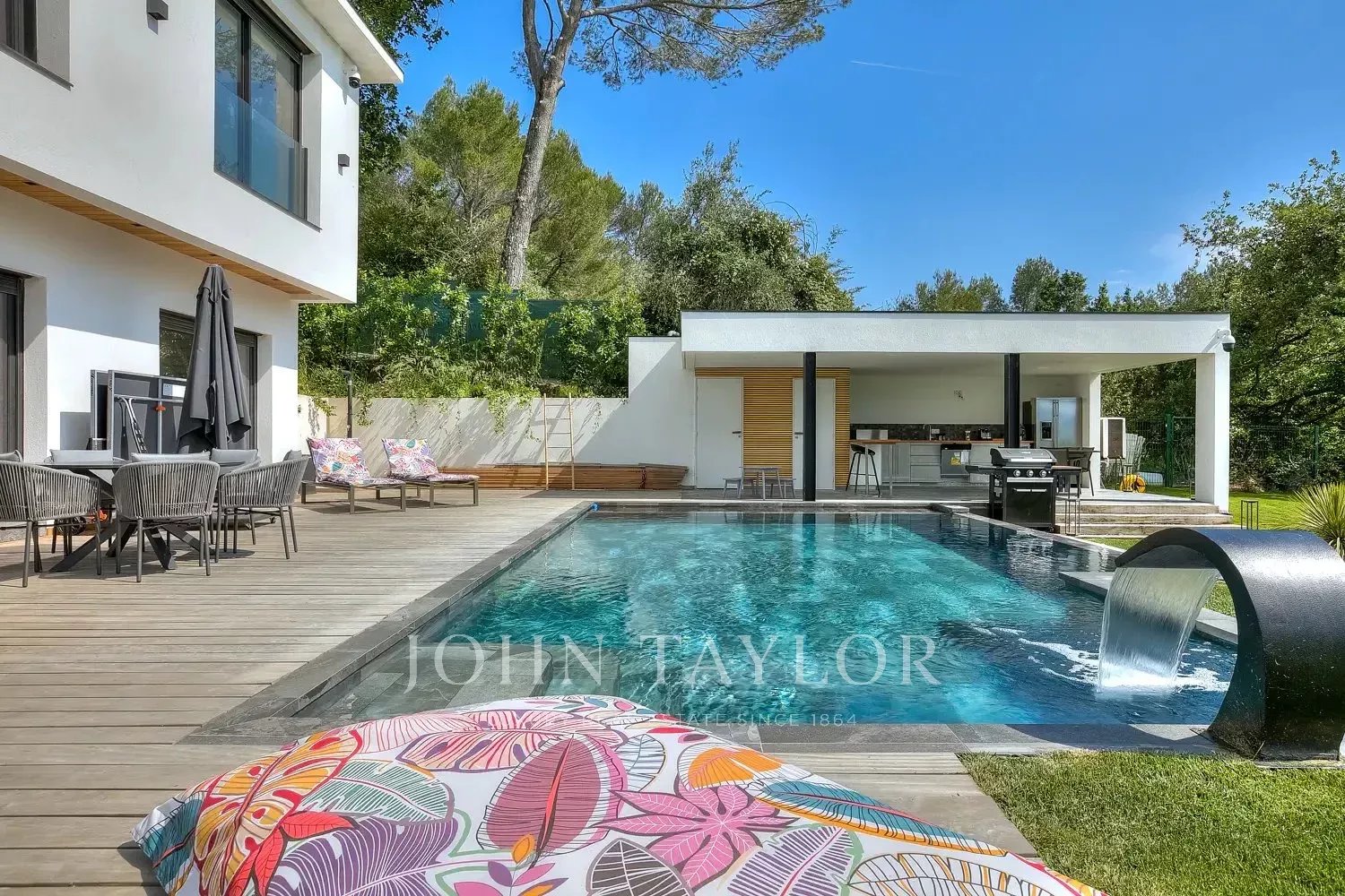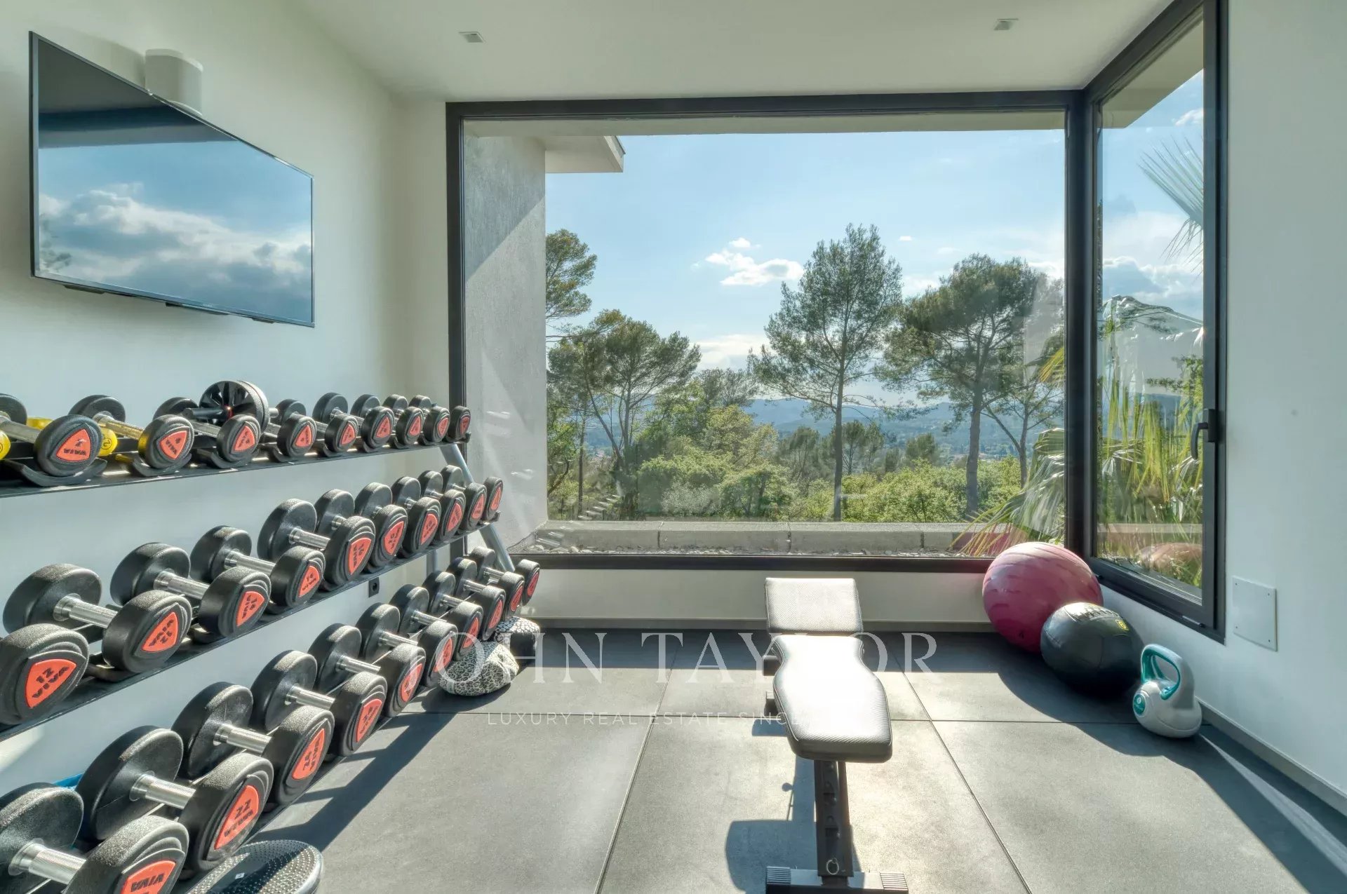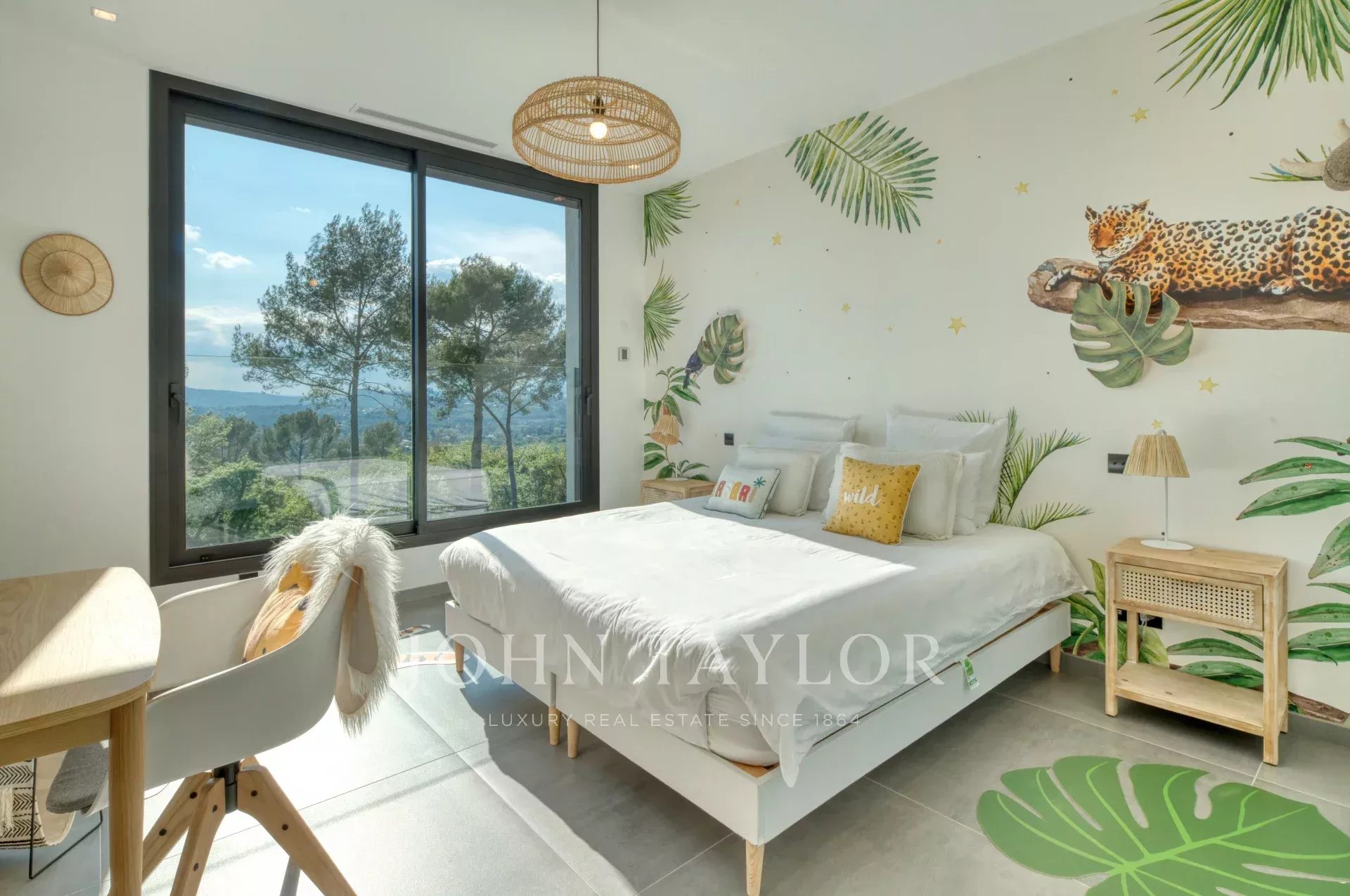 Esta hermosa villa contemporánea de 430 m² cerca de Mougins y Valbonne goza de una luminosidad excepcional gracias a sus enormes ventanales y a sus impresionantes vistas panorámicas.