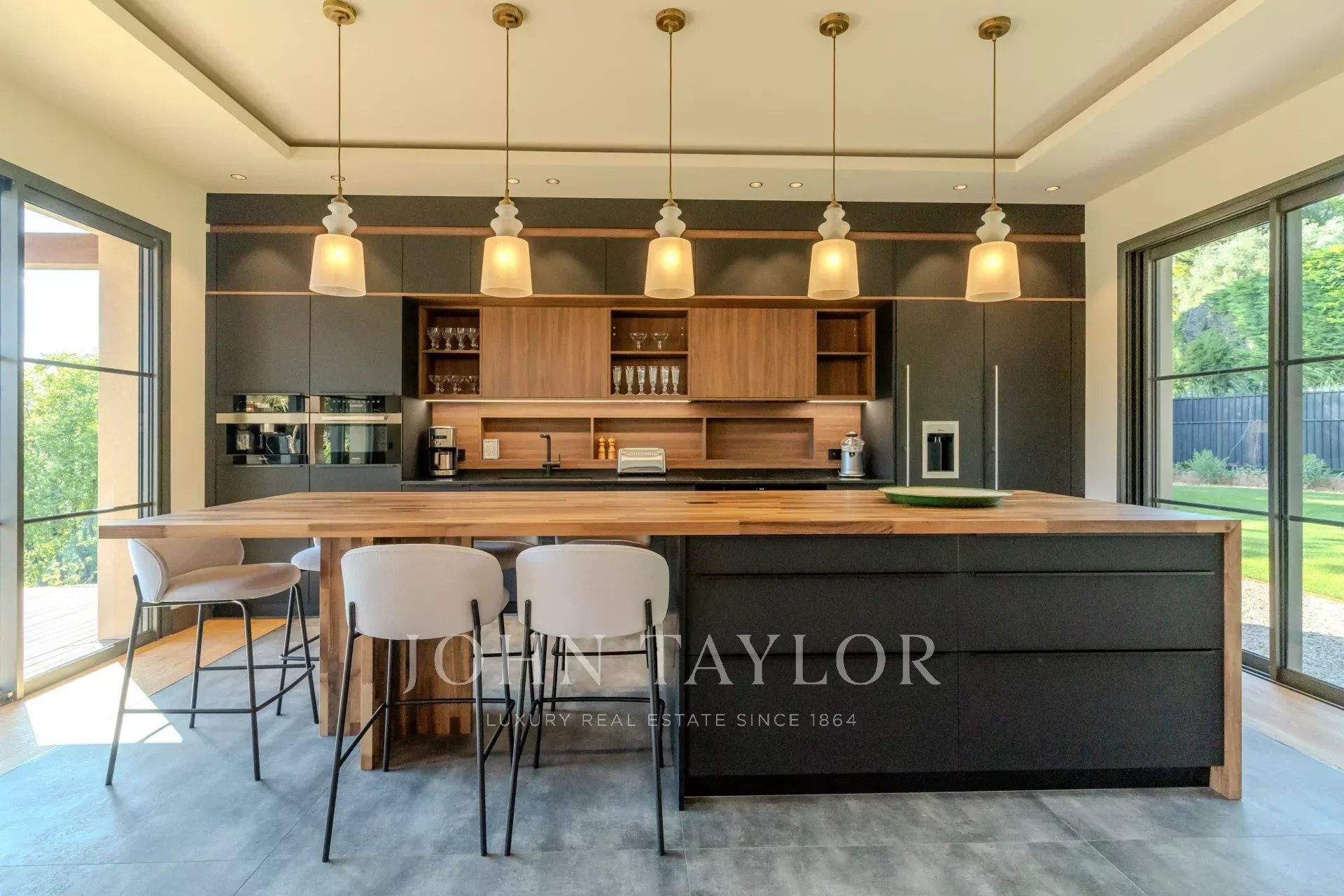 Cocina abierta de alta tecnología totalmente equipada con isla central y zona de desayuno.