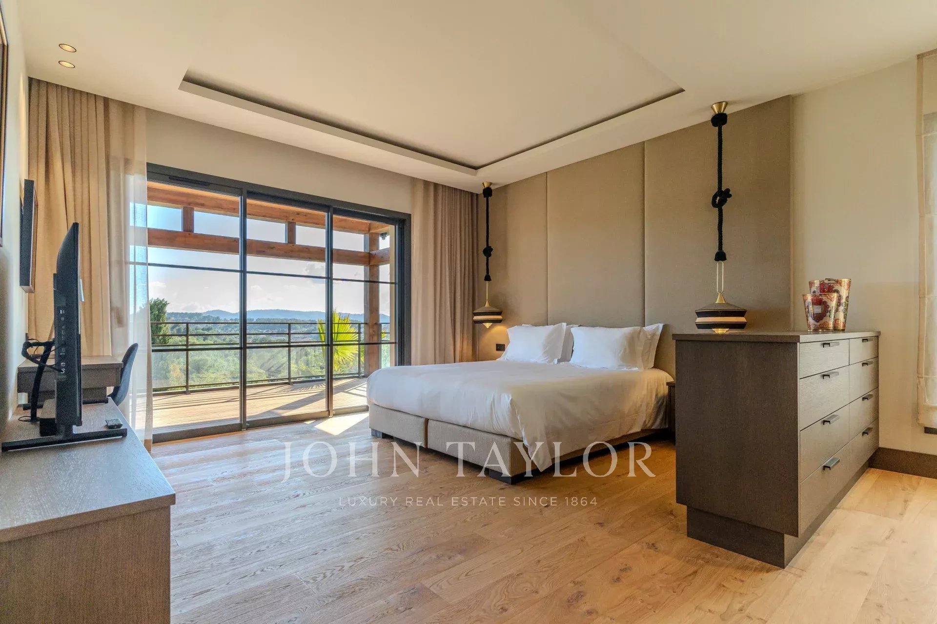 Lujoso dormitorio principal (nº 1): cama de matrimonio (180x200), amplio vestidor con espacio de almacenamiento adicional, TV, cuarto de baño en suite (lavabo doble, bañera, ducha a ras de suelo y aseo independiente). Terraza con vistas ininterrumpidas, perfecta para disfrutar de un café o relajarse al atardecer.