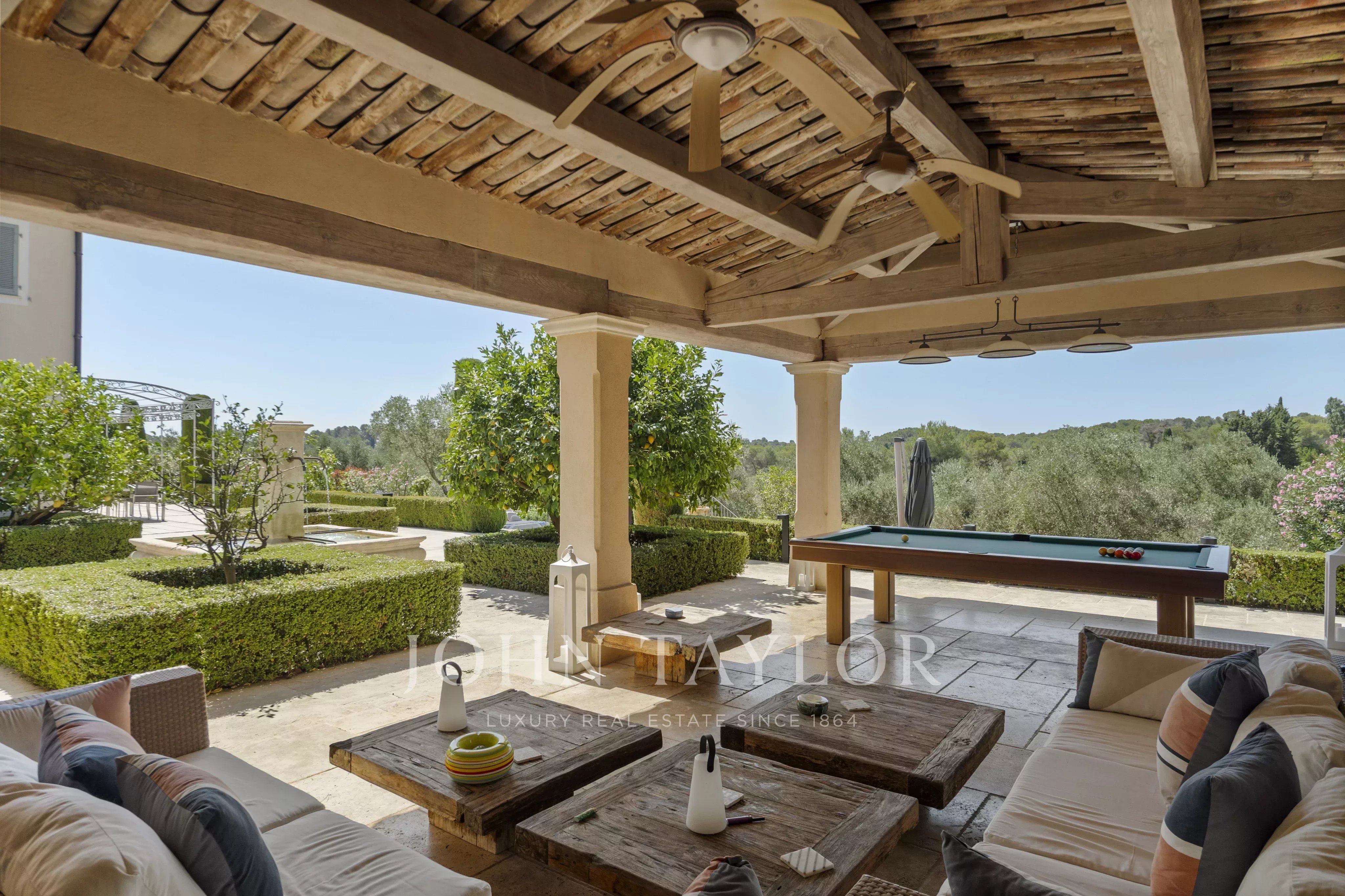 Bañada por el sol gracias a su orientación sur, la propiedad goza de un entorno tranquilo, frondoso y discreto, con magníficas vistas despejadas sobre la campiña provenzal.