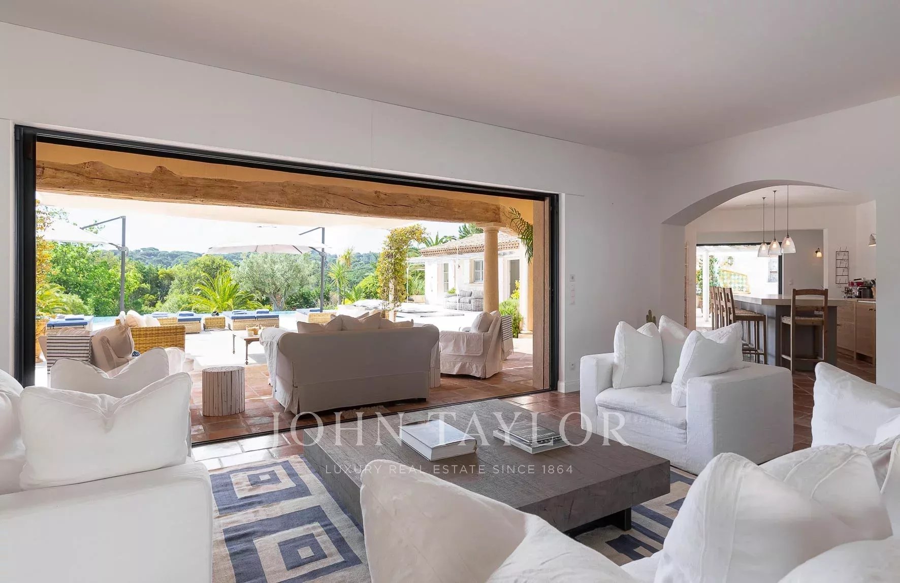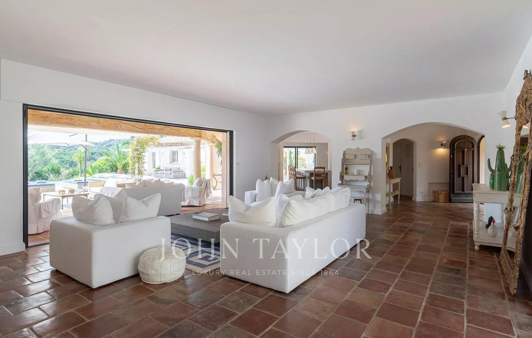 Un gran salón con puertas dobles que dan a un patio y a la piscina.