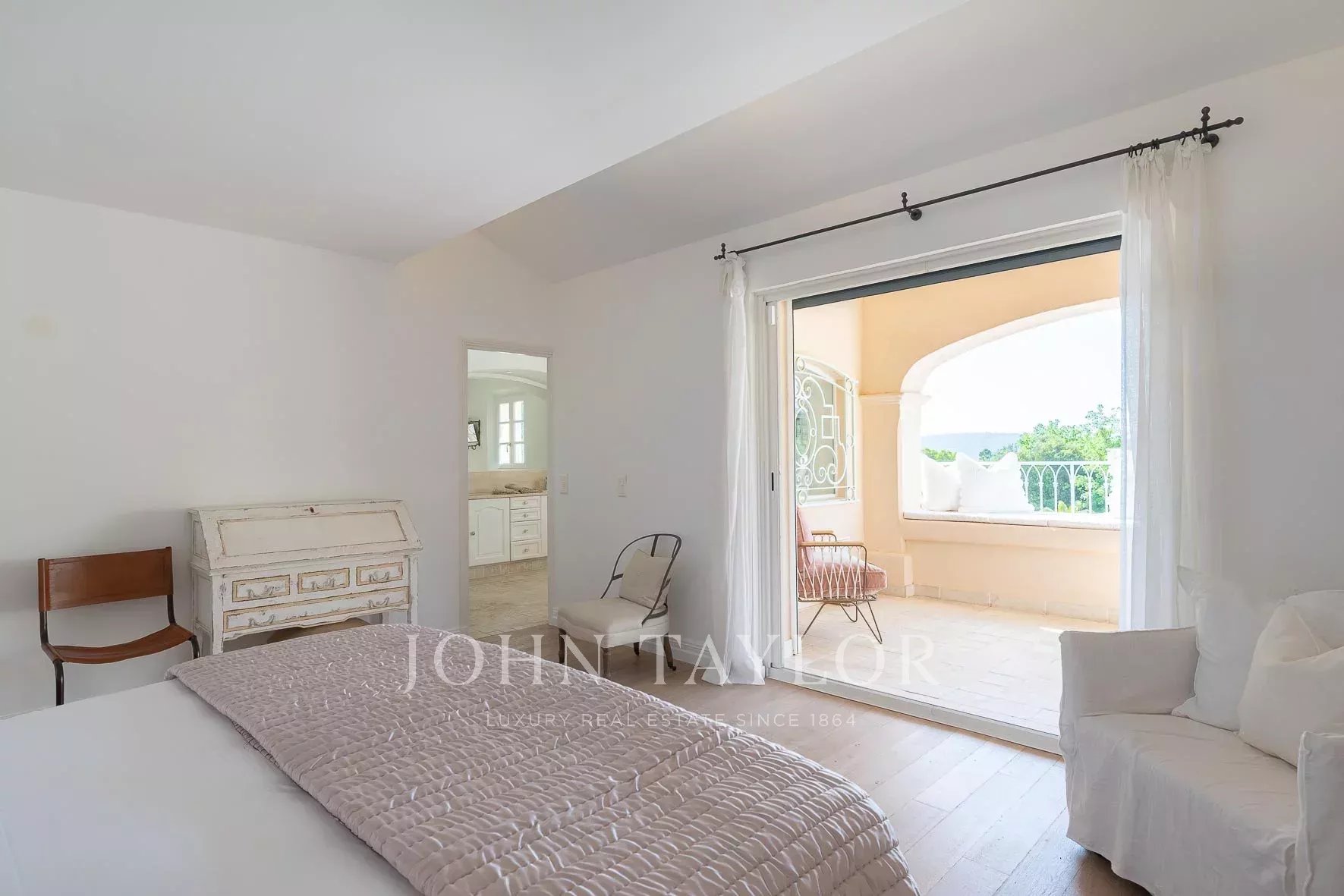 Un lujoso dormitorio principal con balcón propio, baño en suite y vestidor.