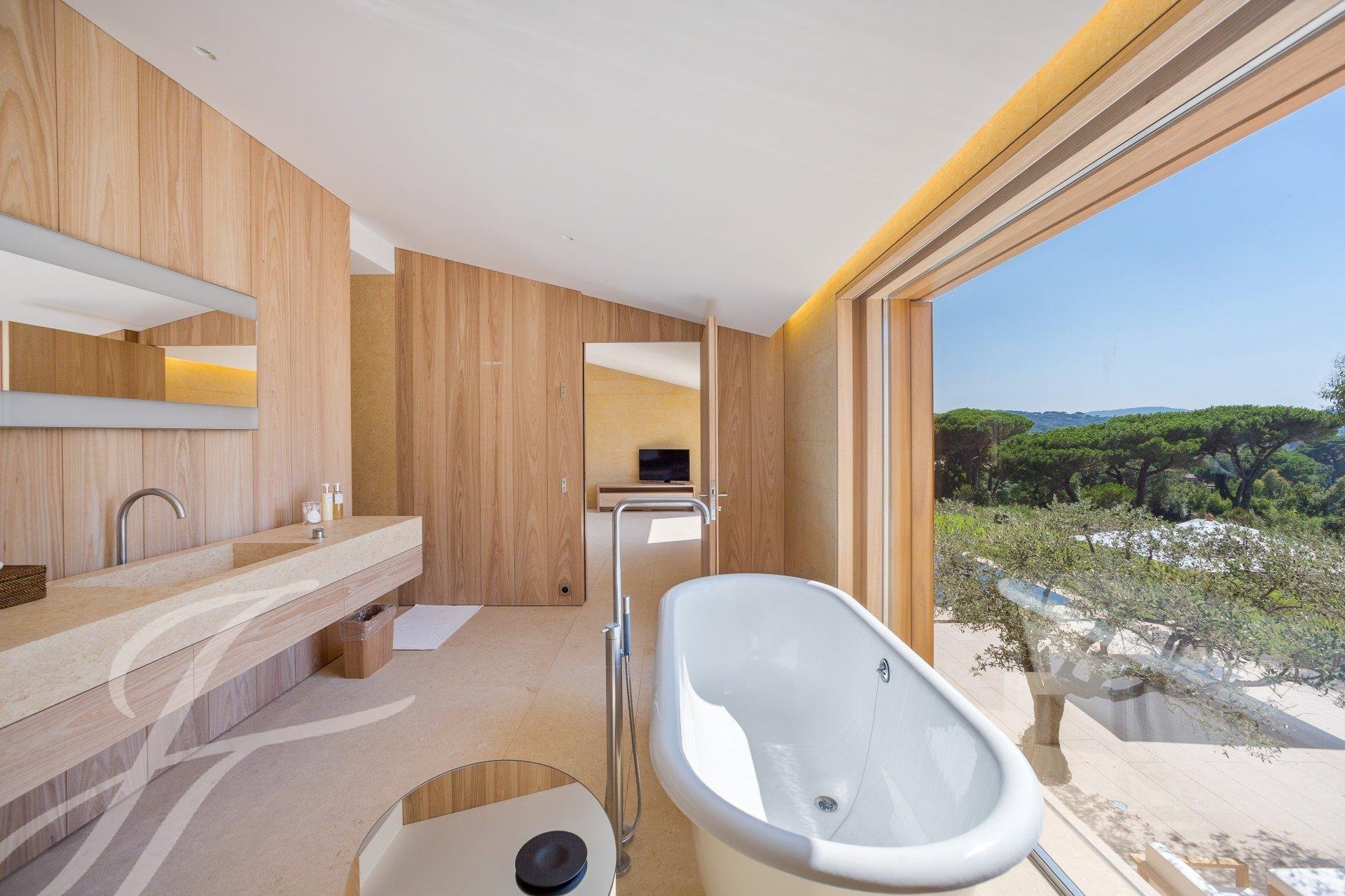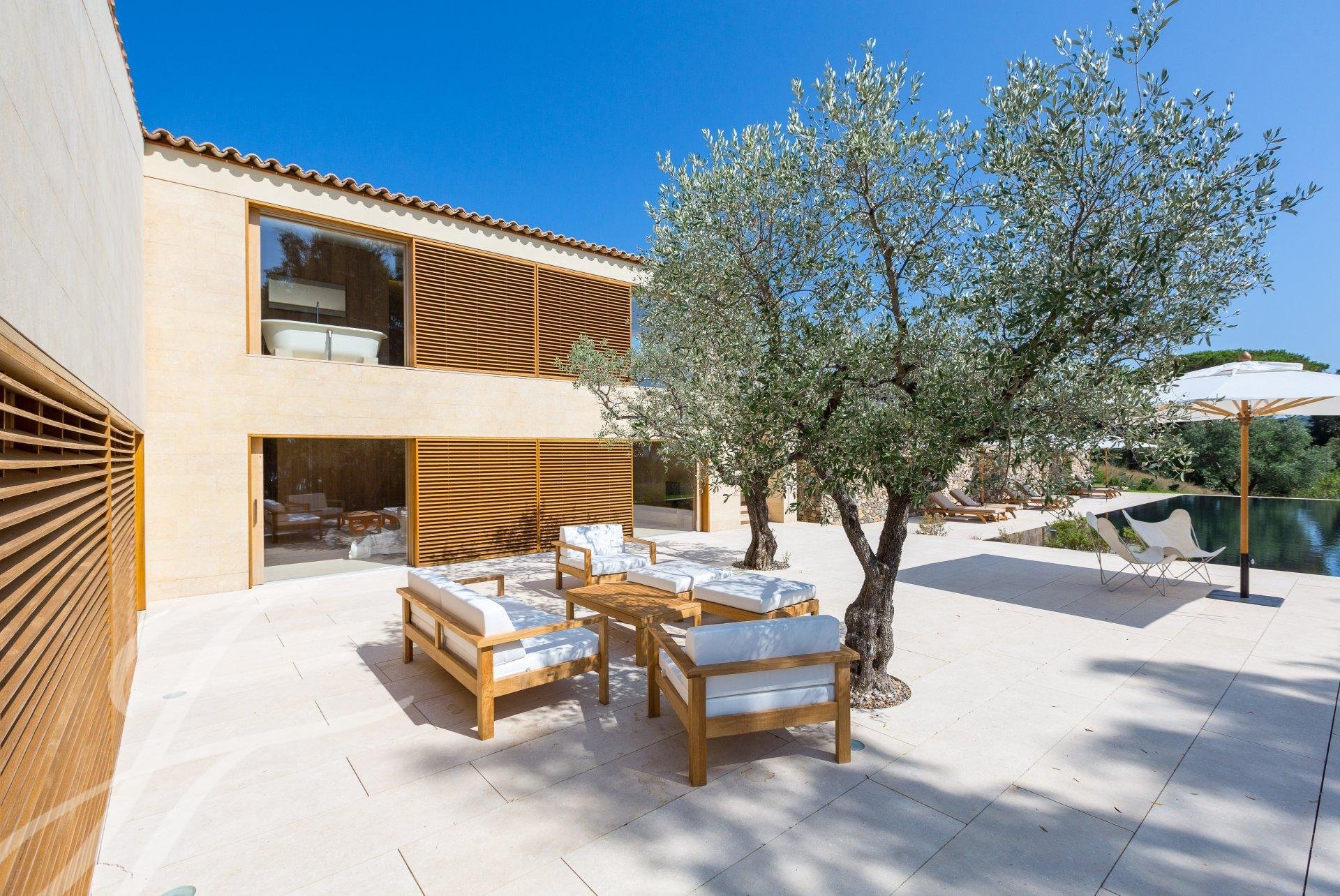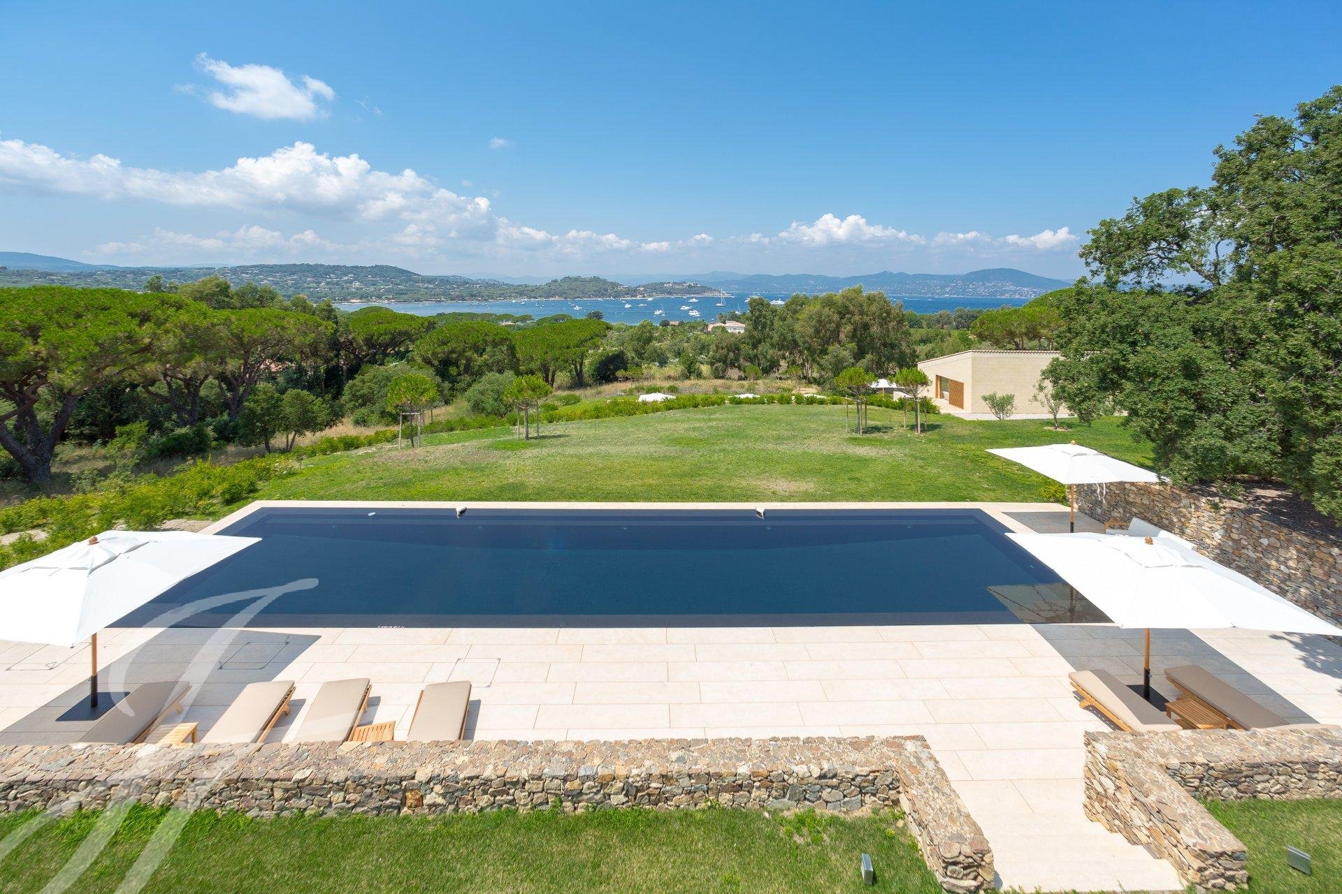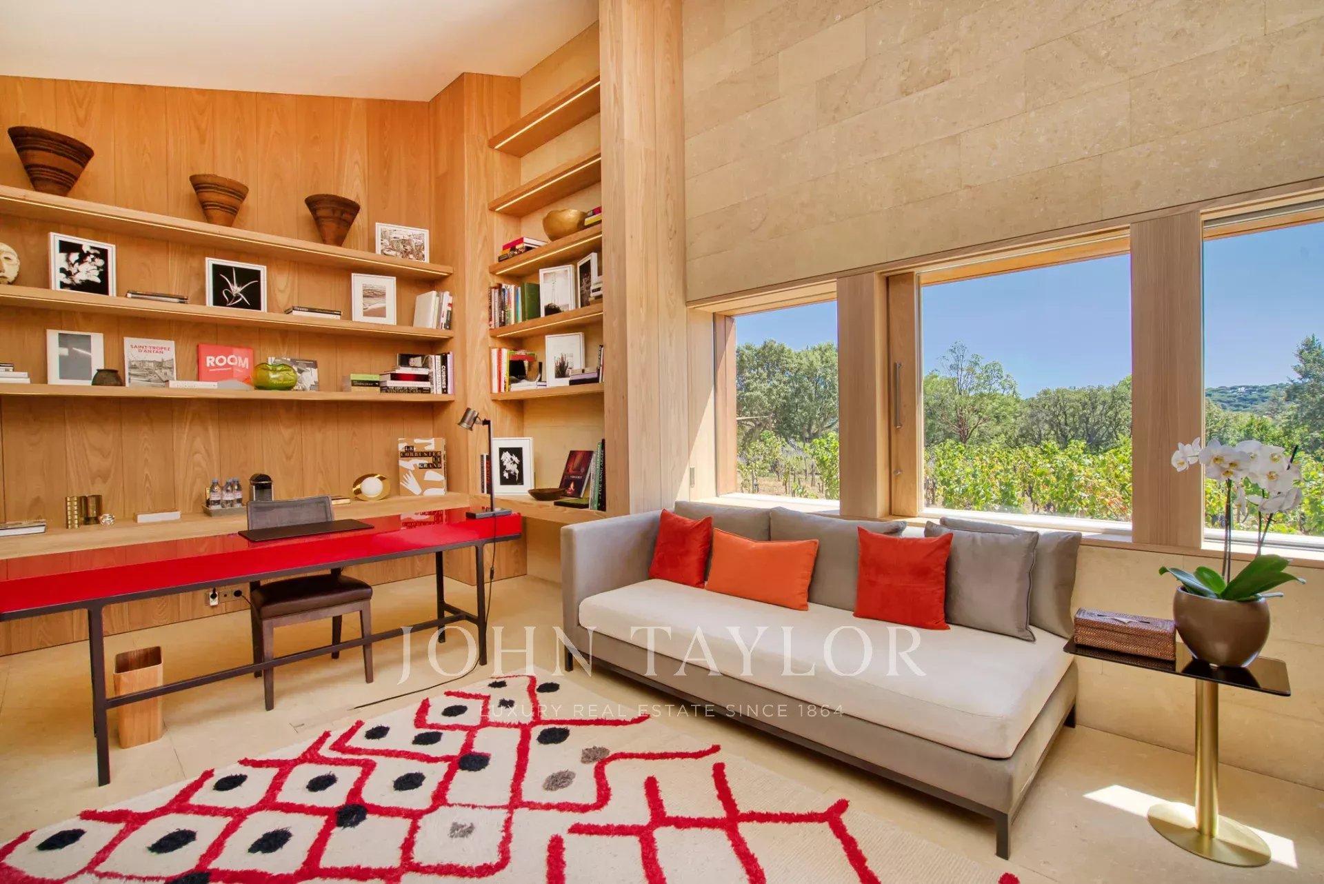 Exclusiva finca situada en los Parcs de Saint-Tropez, que puede alquilarse en su totalidad (8 habitaciones), diseñada por el arquitecto británico John Pawson y que consta de las siguientes estancias