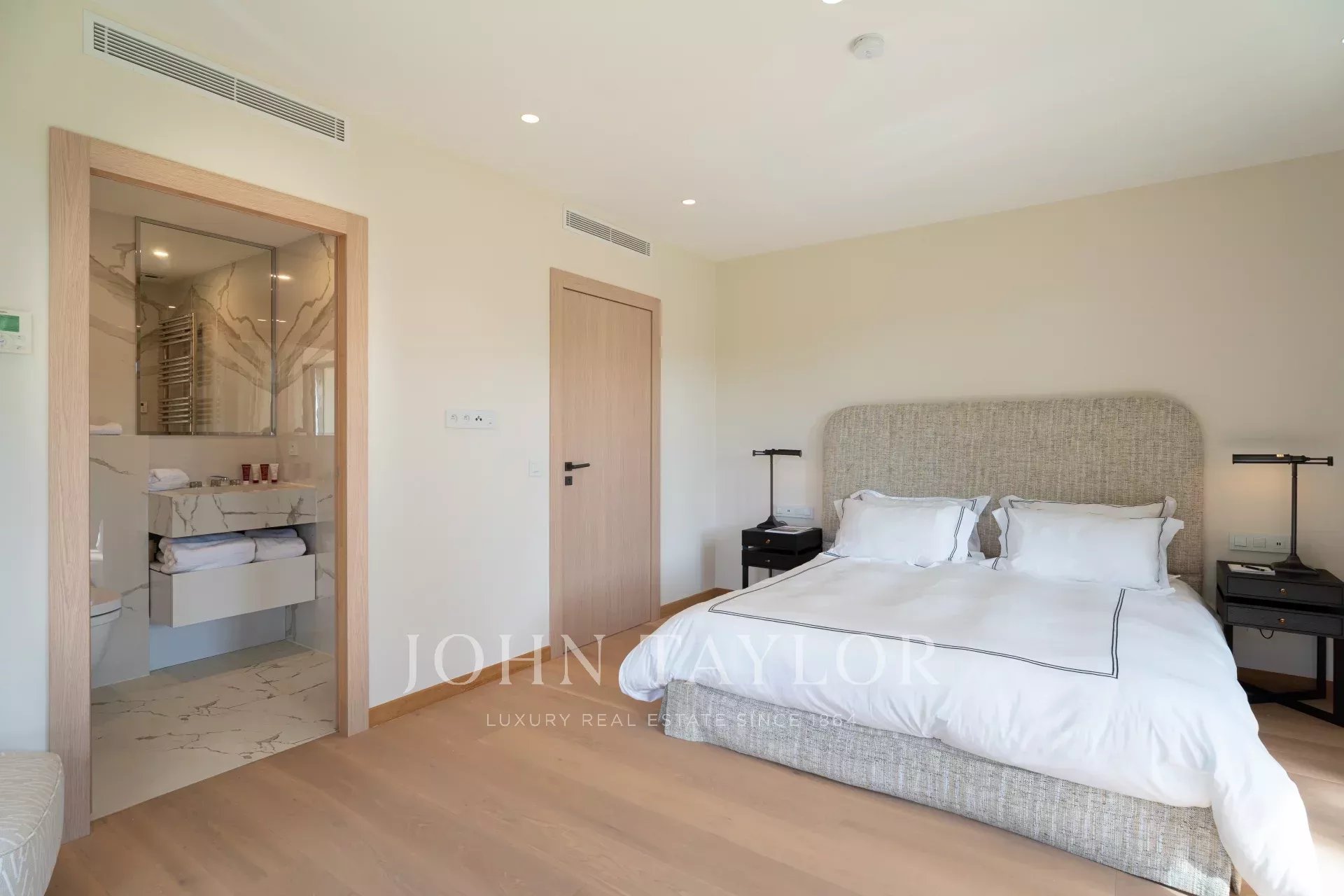 Una espaciosa suite principal (cama/200), estudio, cuarto de baño/ducha/WC y vestidor, con salida a terrazas privadas con vistas al jardín y sus pinos paraguas.