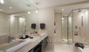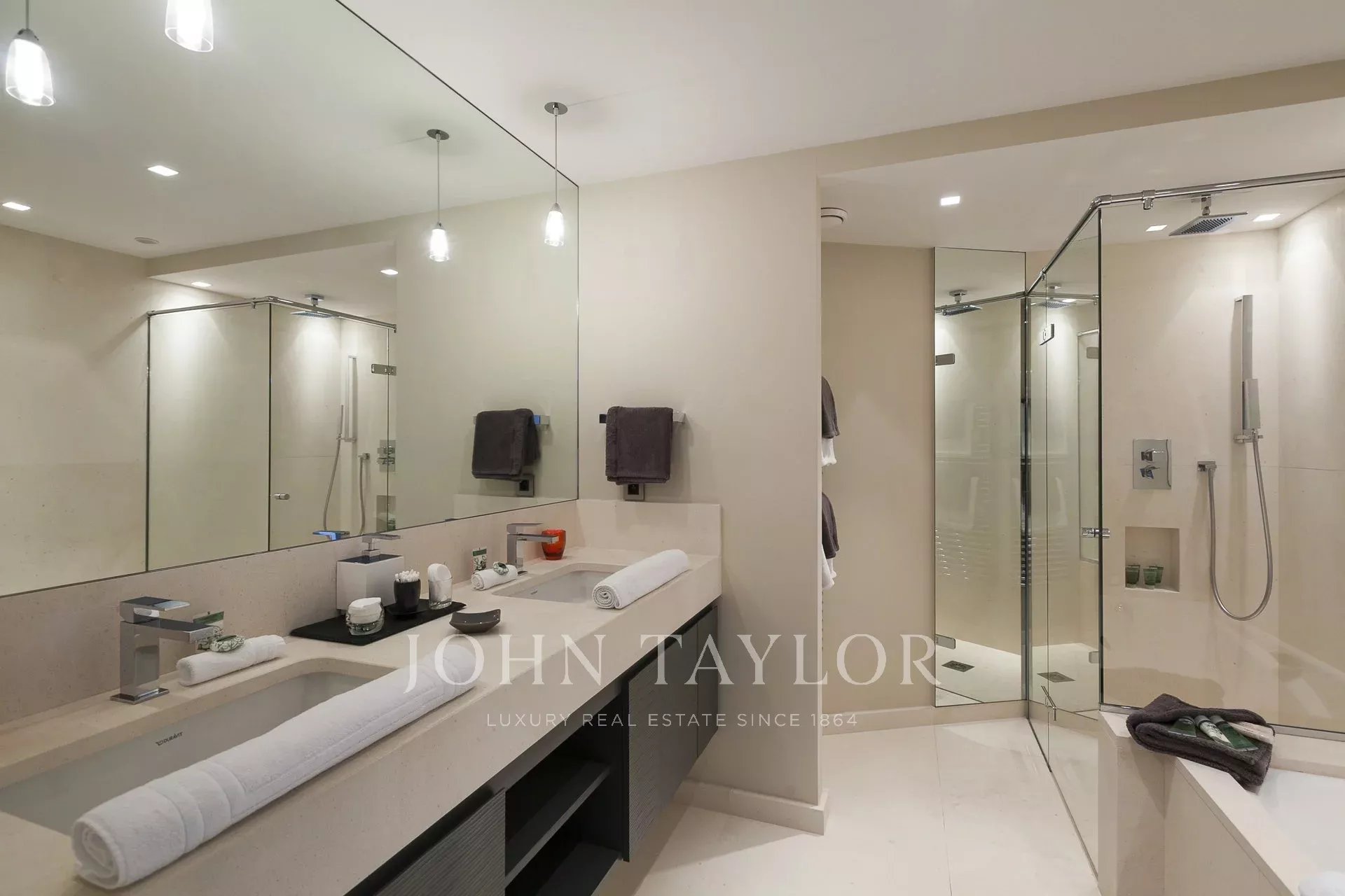 Un gran dormitorio principal con 2 baños en suite con vistas al puerto de St Jean Cap Ferrat y a la piscina exterior. Zona de TV con sistema de audio/vídeo.