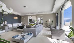 Salón muy luminoso con vistas al puerto de Saint Jean Cap Ferrat, gran terraza con vistas al mar de 180°, zona de estar.