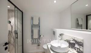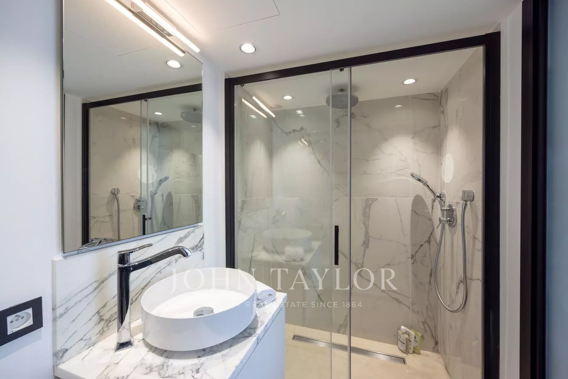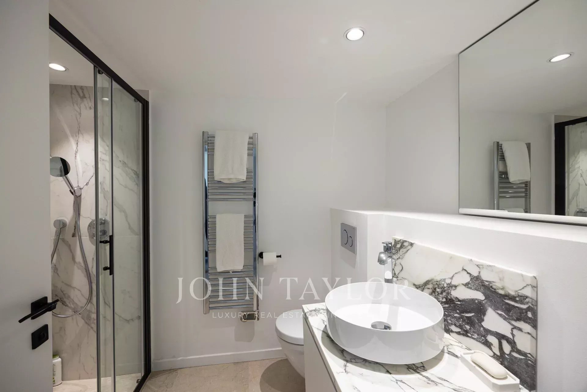 Nivel de la piscina: acceso por ascensor o escaleras exteriores: vestíbulo, cuarto de ducha, cocina americana, sala de estar, dormitorio con cuarto de ducha propio, dormitorio adicional con sofá cama convertible, todo ello con acceso a la terraza y a la piscina.