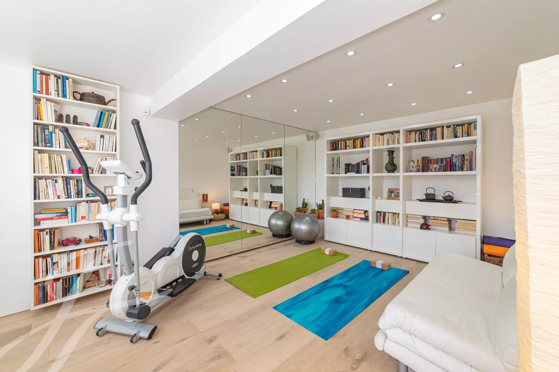 - Sala de yoga con pared de espejos, esterillas y bloques de yoga, bicicleta elíptica o stepper, etc.