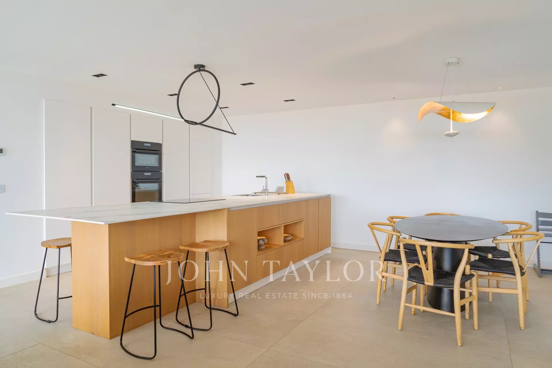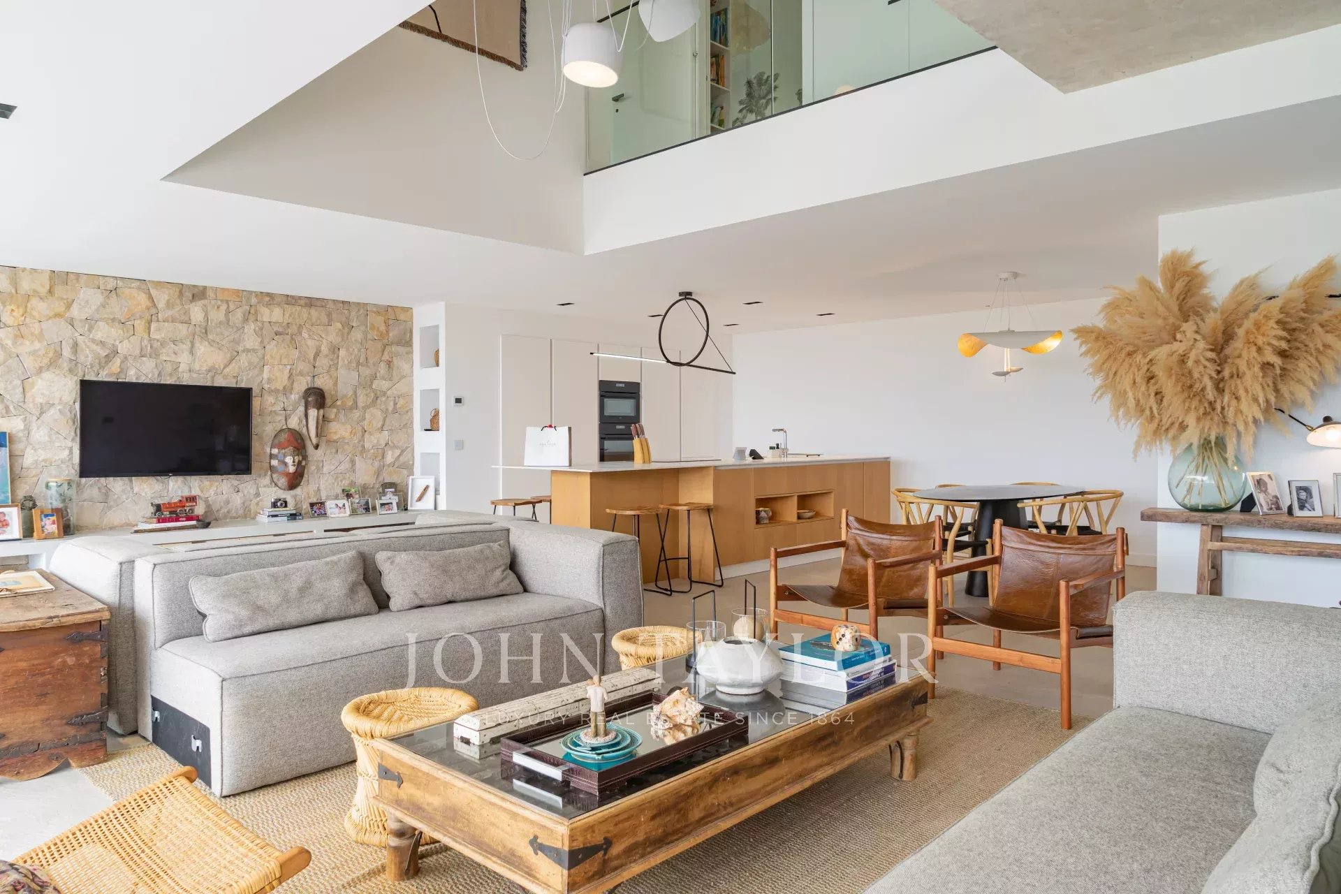 La villa cuenta con una elegante sala de estar de hormigón encerado, compuesta por un amplio salón, un comedor y una cocina totalmente equipada. Este espacio está completamente abierto al exterior gracias a grandes ventanales correderos de cristal de 3 metros, que ofrecen una luz excepcional y una conexión armoniosa con la naturaleza circundante.