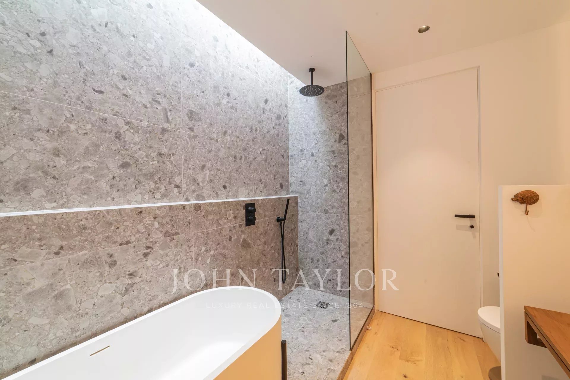 Una suite principal con un gran vestidor y cuarto de baño en suite.