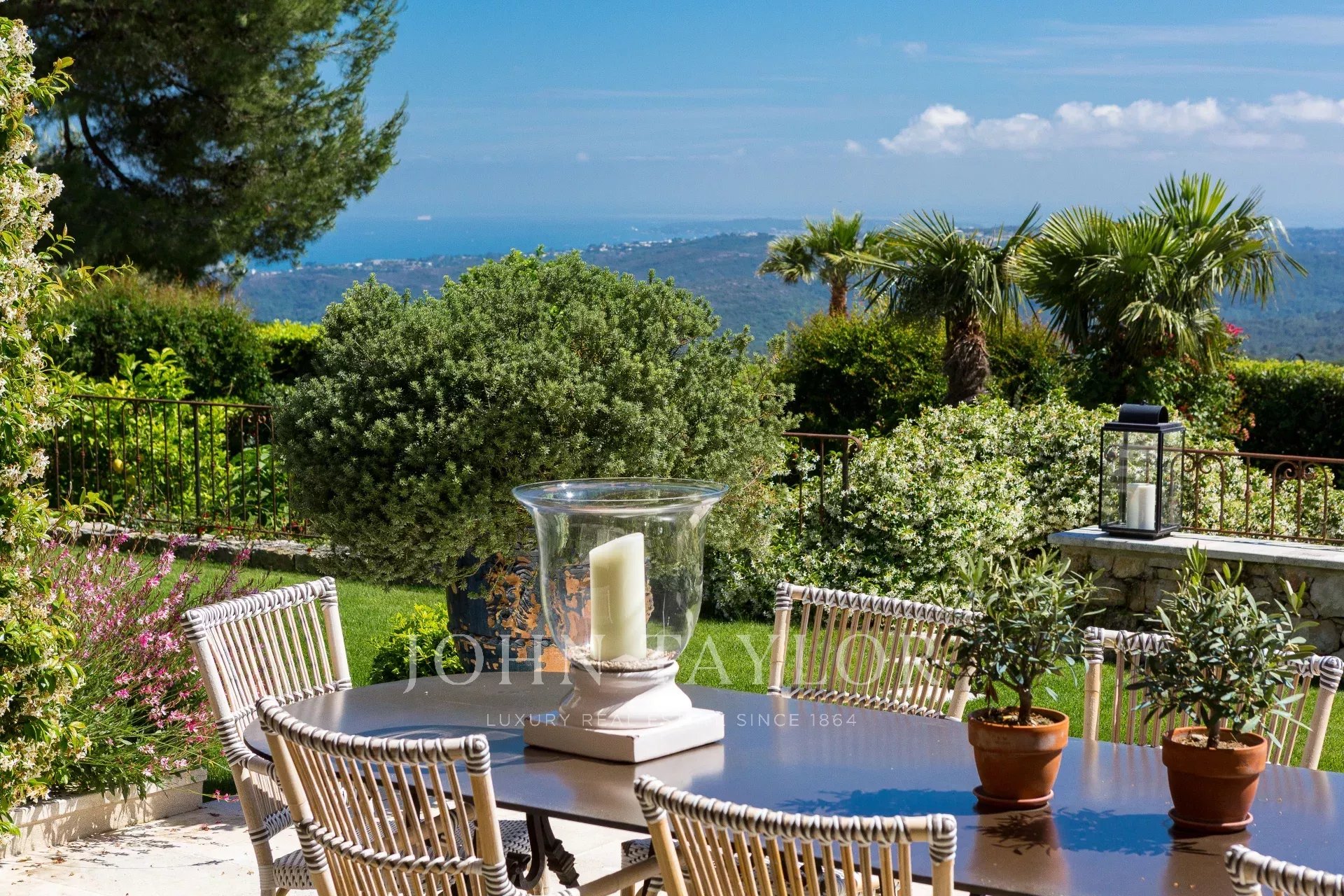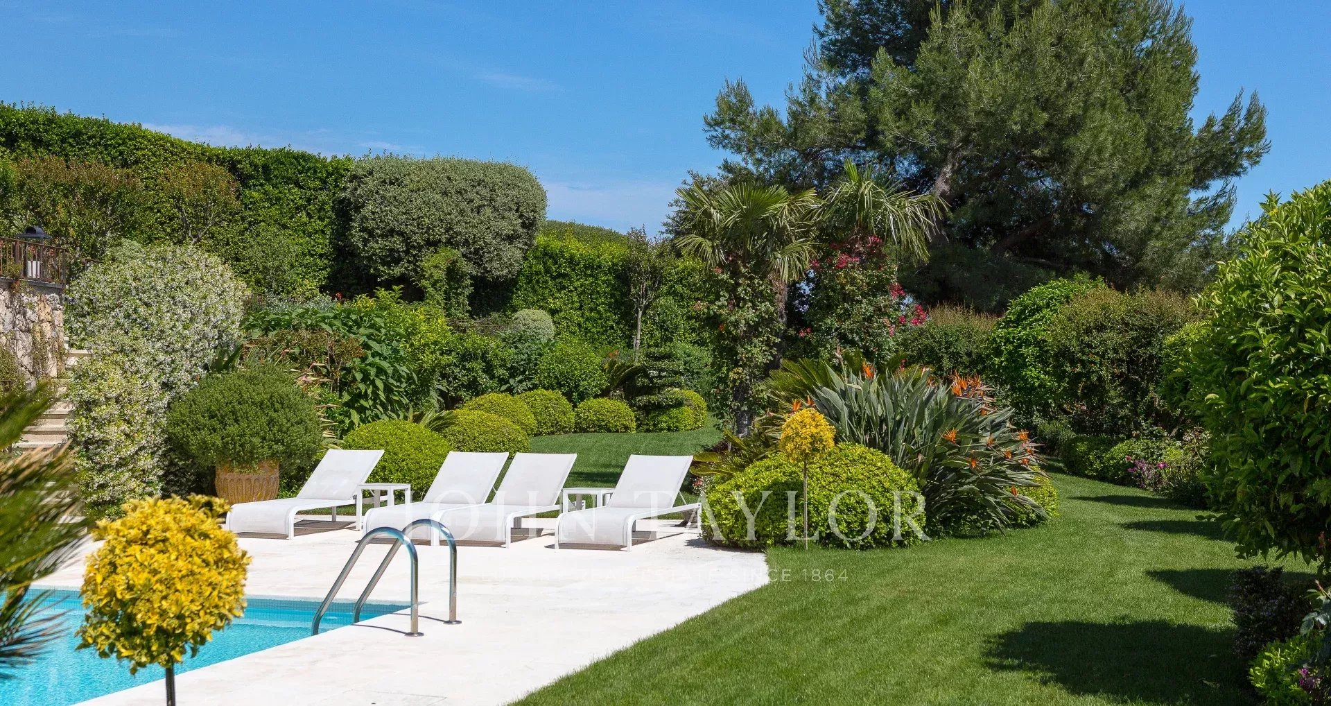Enclavada en un cuidado jardín, la villa está rodeada de árboles mediterráneos y exuberante vegetación.