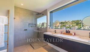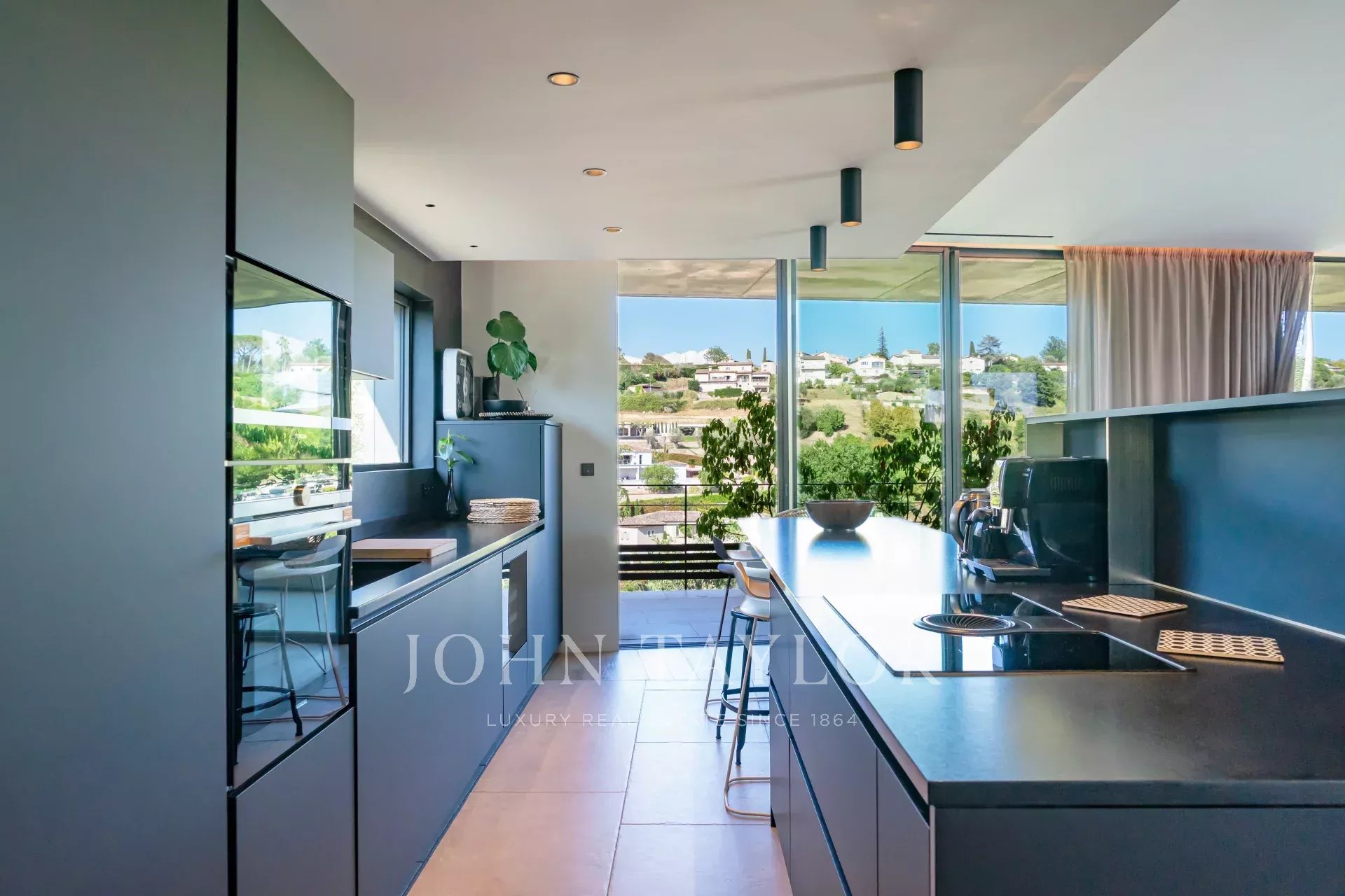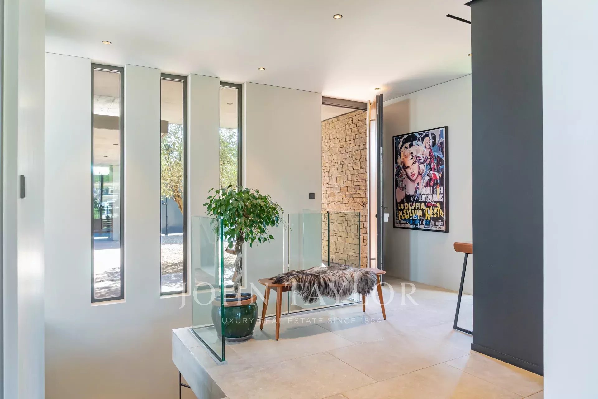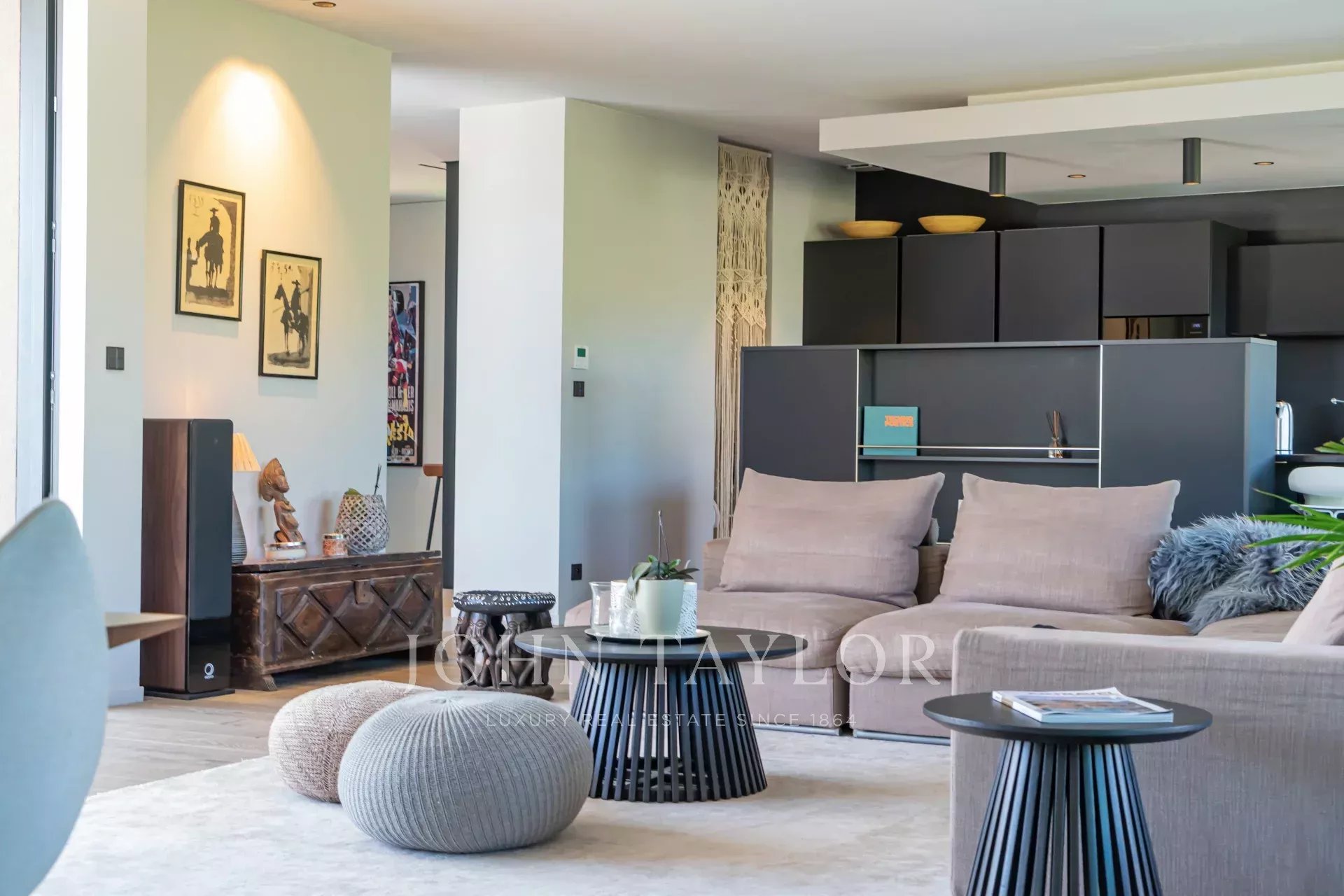 En la planta baja, una espaciosa y luminosa sala de estar con salón, comedor y cocina americana invita a relajarse y disfrutar de la compañía de los amigos. Las vistas sobre Saint-Paul de Vence, por un lado, y la agradable terraza con piscina rodeada de un jardín tropical, por el otro, proporcionan un entorno idílico. La suite principal incluye un estudio con vistas, un vestidor, un cuarto de baño con ducha y bañera y acceso directo a una de las terrazas.