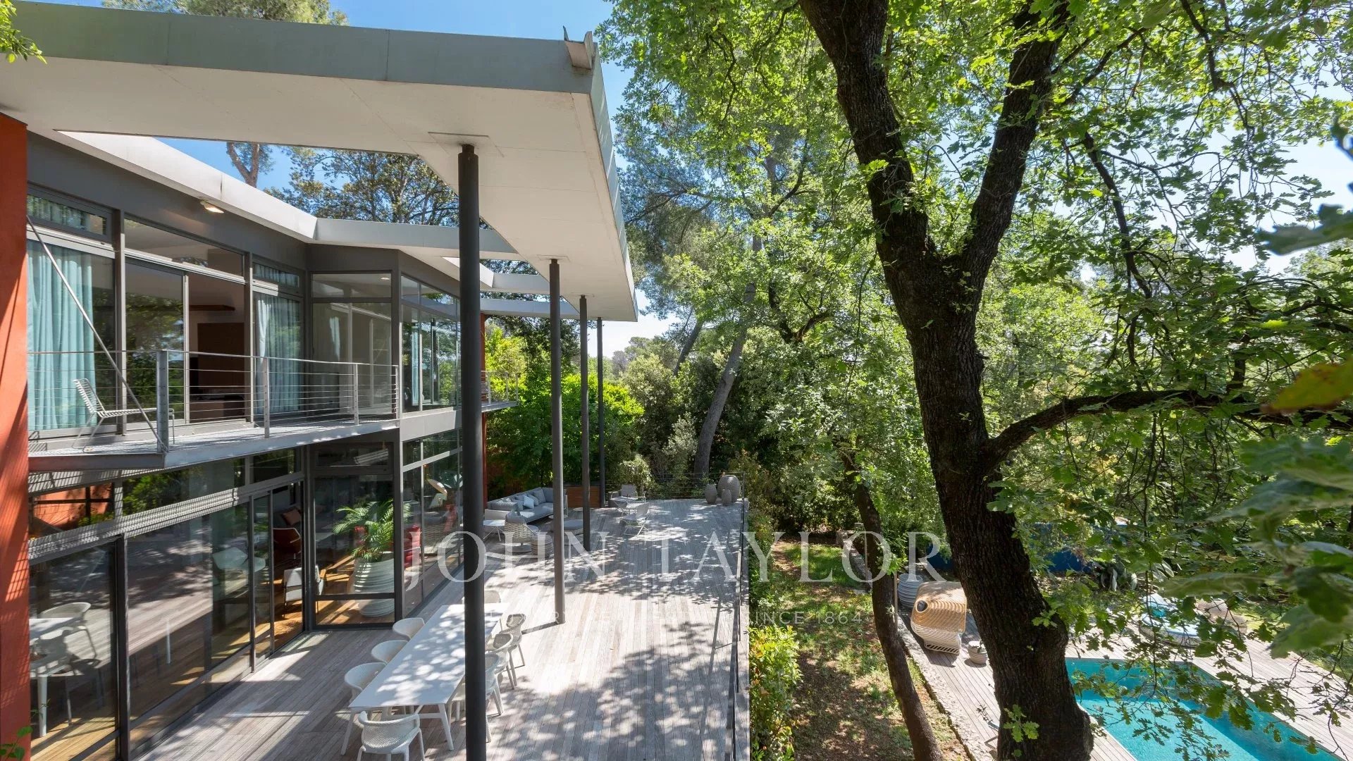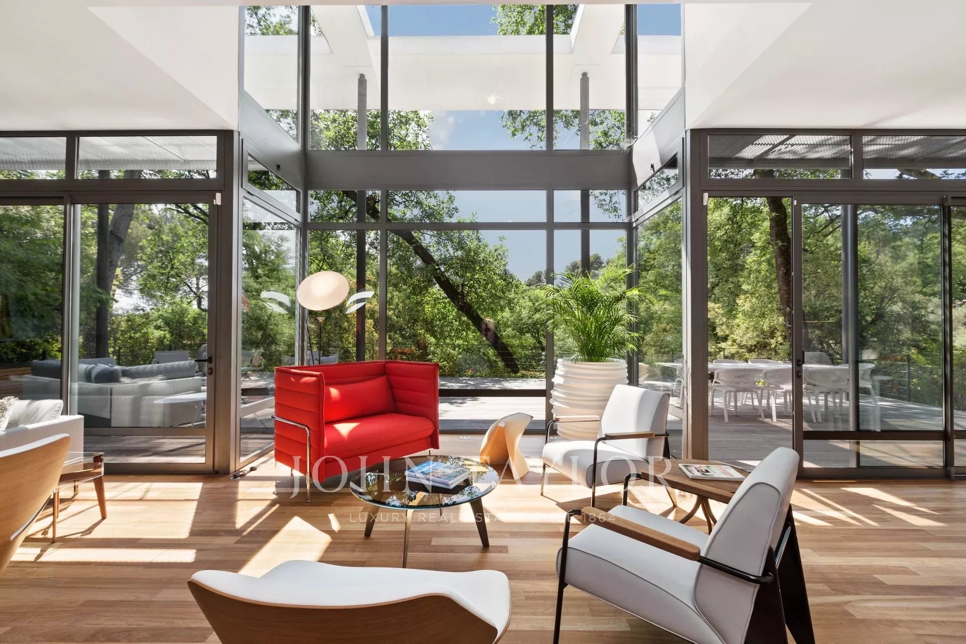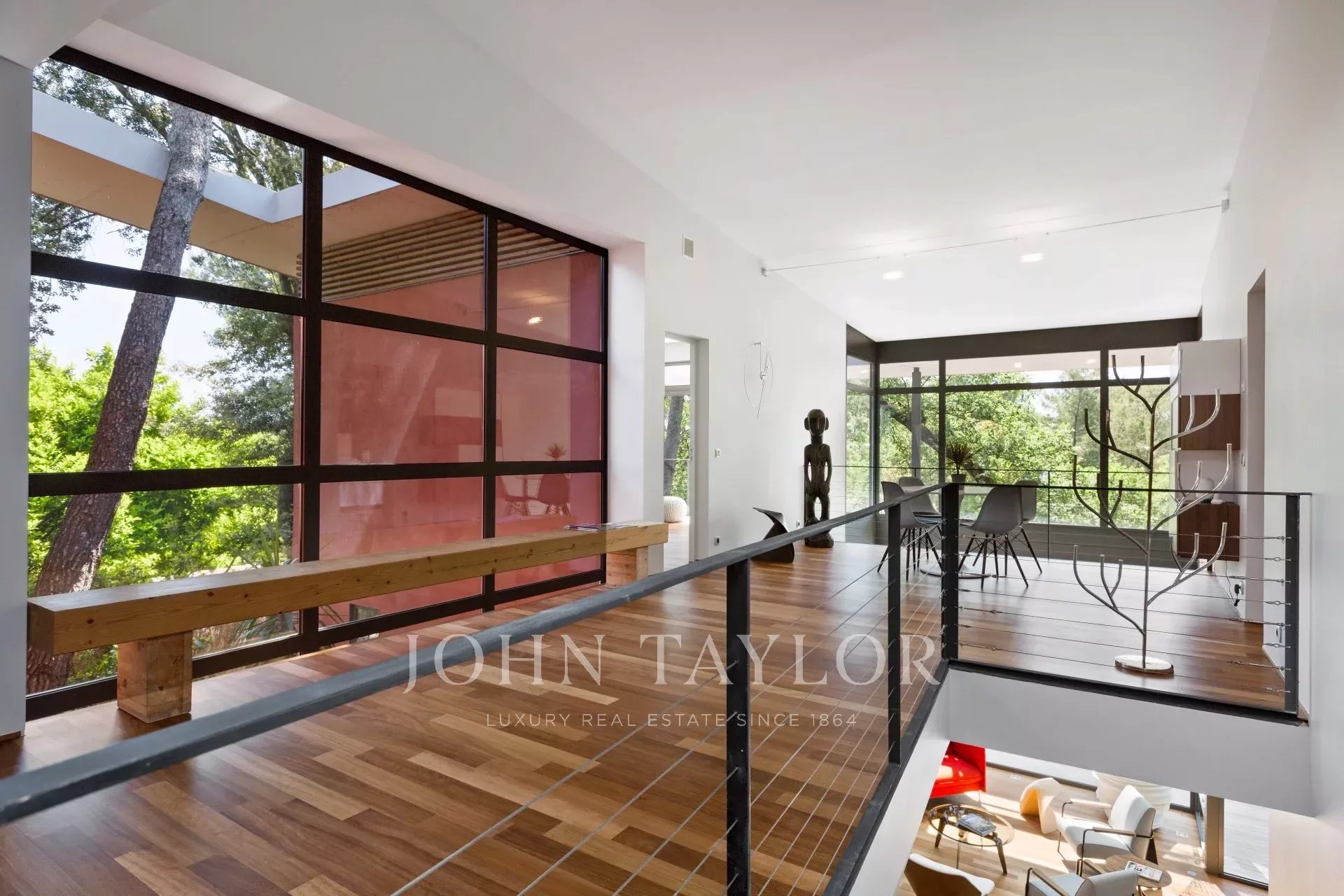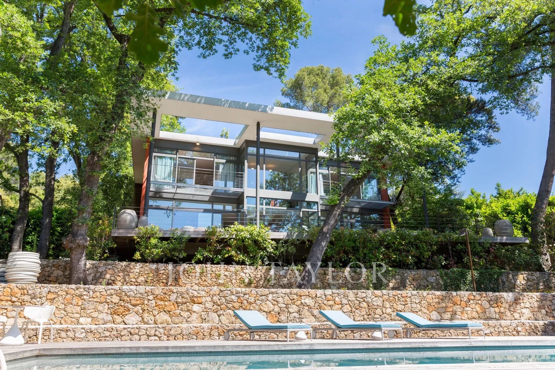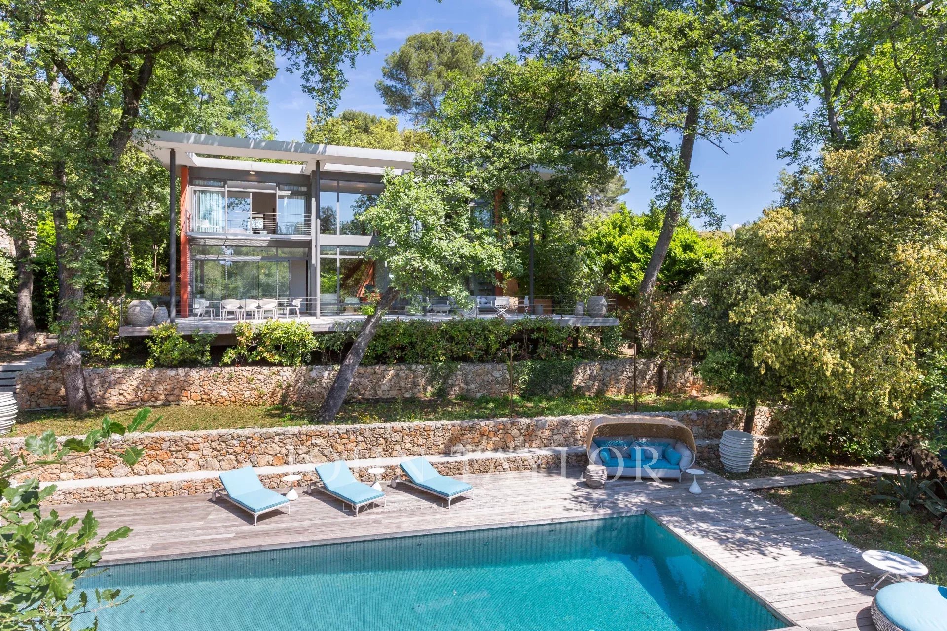 Esta moderna propiedad de 350 m² está enclavada en un terreno arbolado con magníficos robles y pinos, a pocos metros de la Fundación Maeght. Diseñada en 2002 por el arquitecto italiano Antonino Cascio, esta villa es un referente de la arquitectura moderna, sobre todo por sus innovadoras características bioclimáticas.