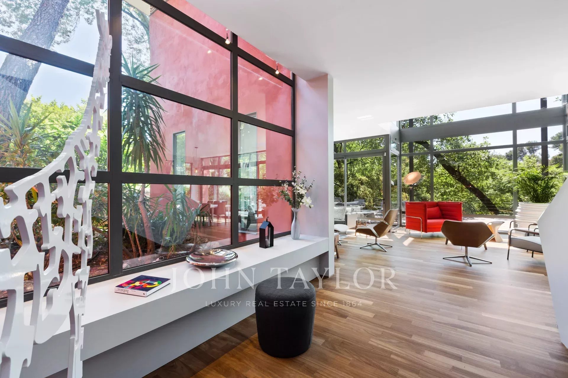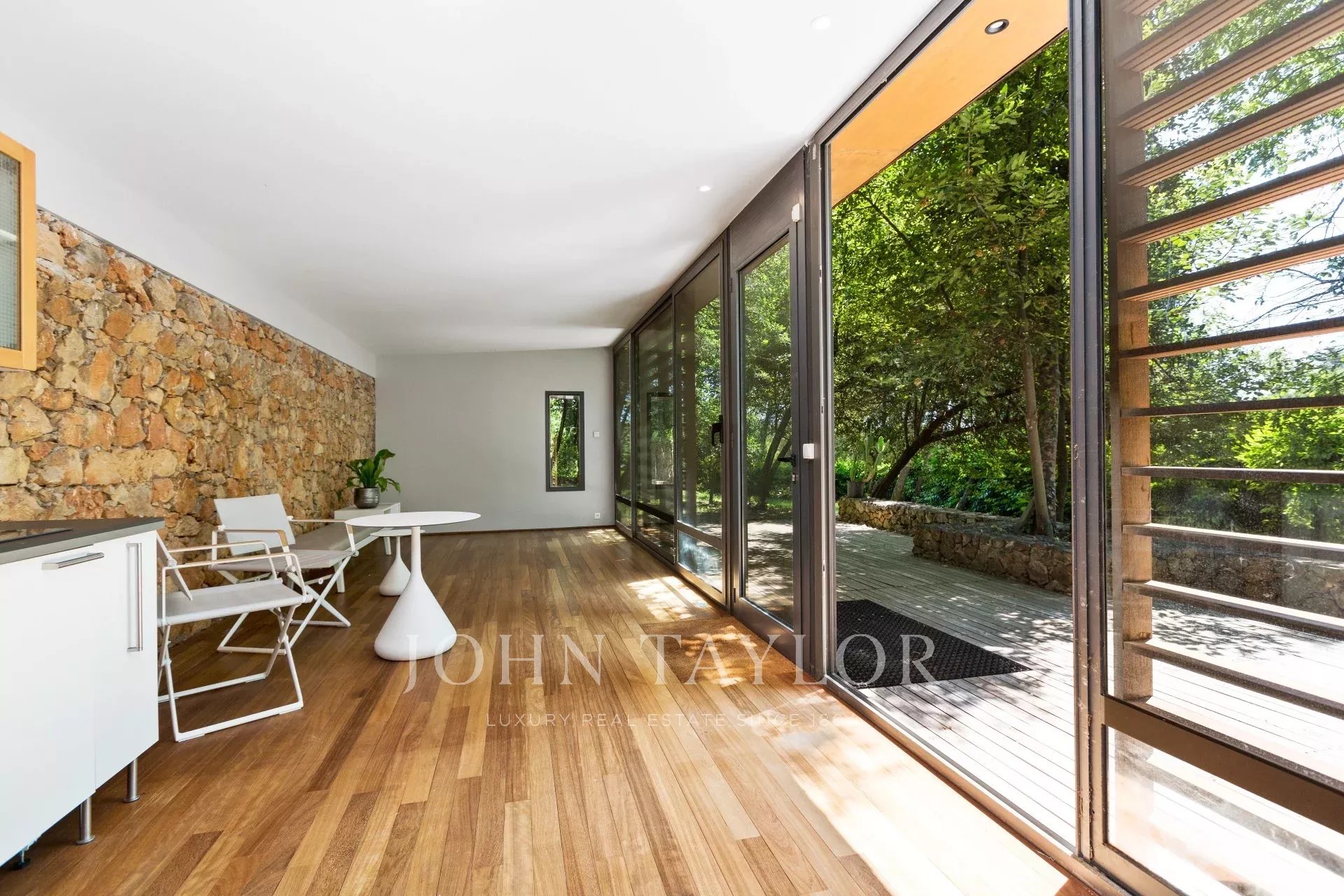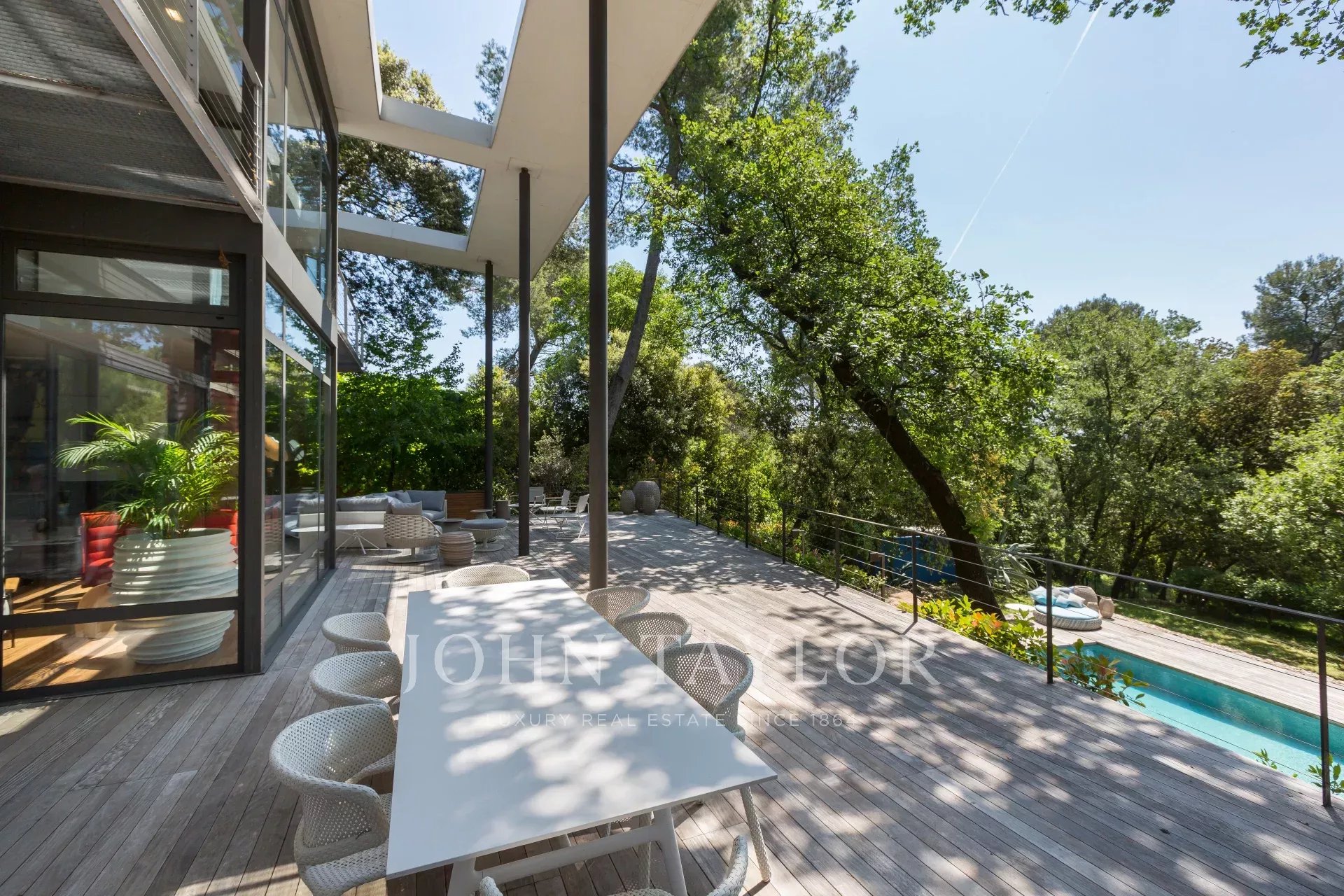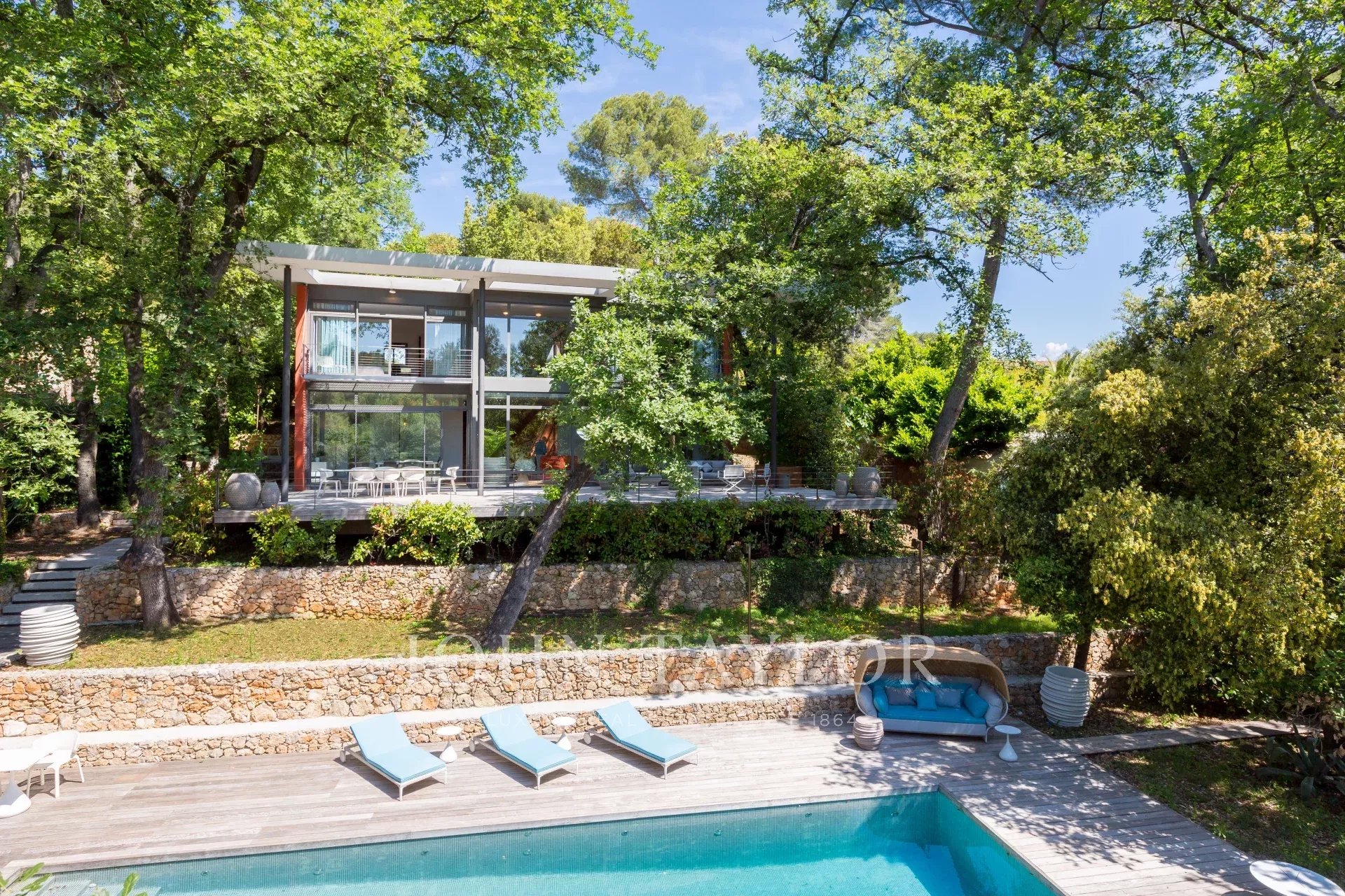 Esta moderna propiedad de 350 m² está enclavada en un terreno arbolado con magníficos robles y pinos, a pocos metros de la Fundación Maeght. Diseñada en 2002 por el arquitecto italiano Antonino Cascio, esta villa es un referente de la arquitectura moderna, sobre todo por sus innovadoras características bioclimáticas.