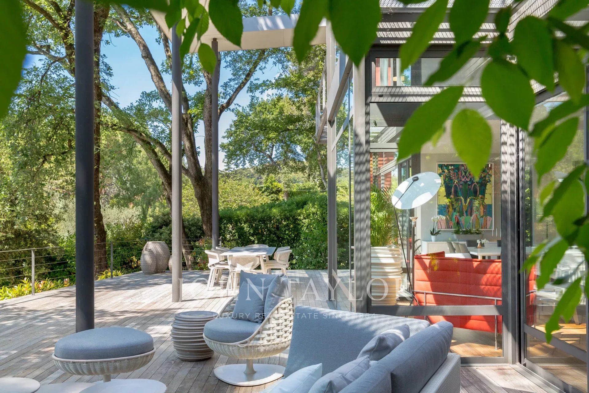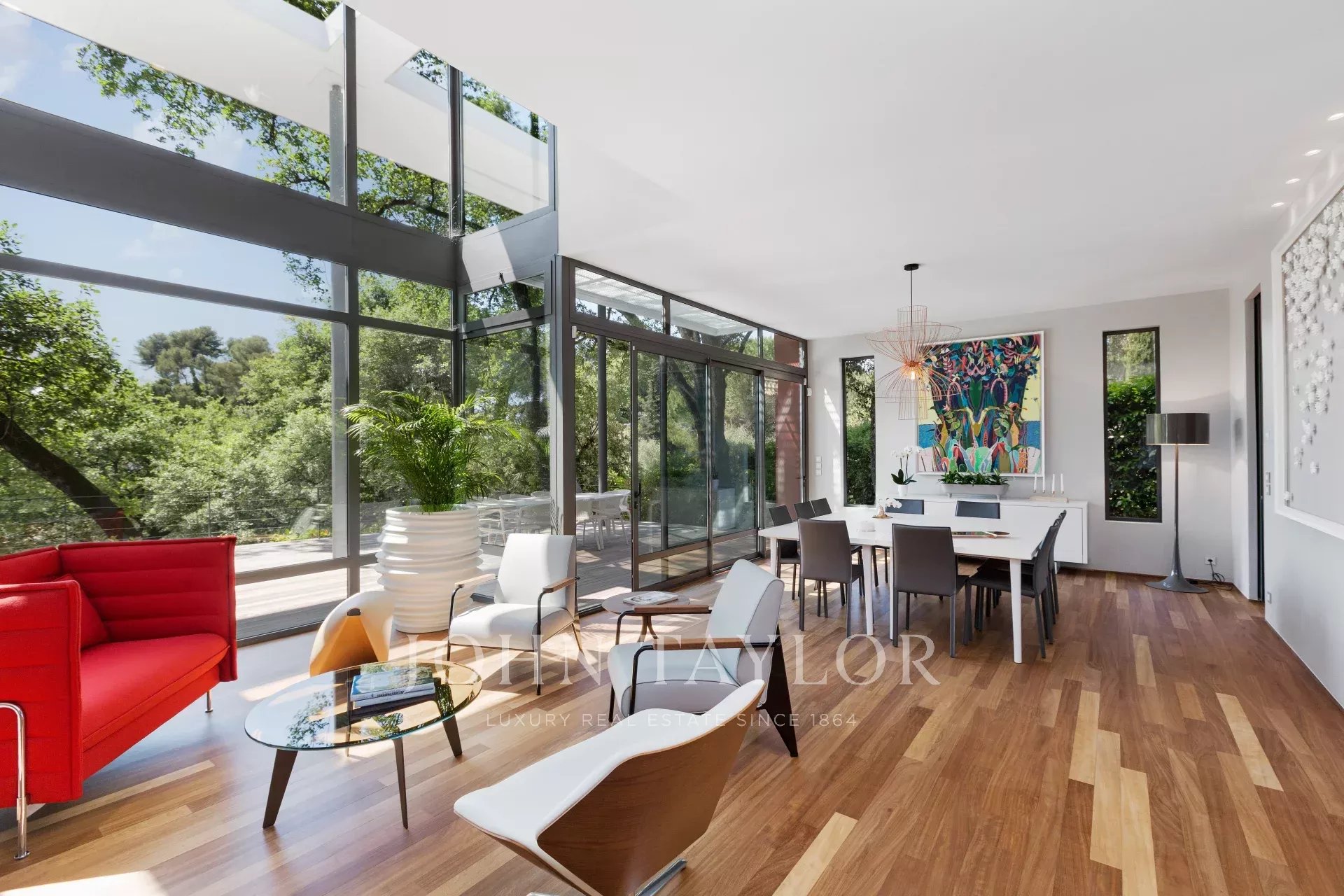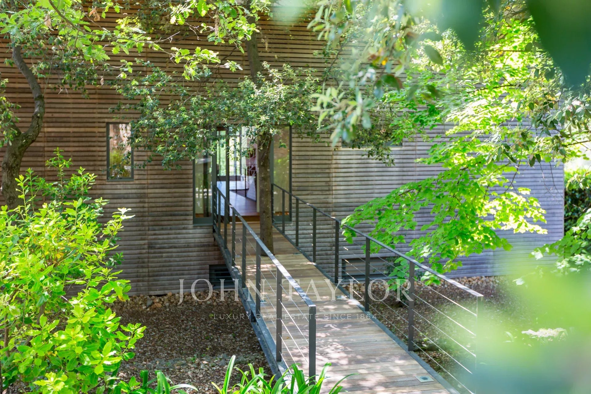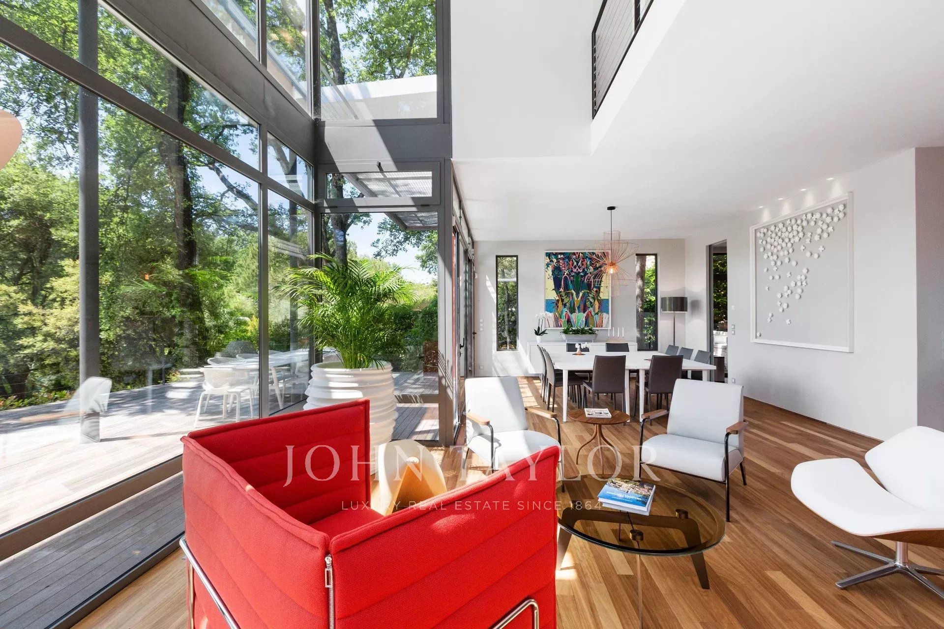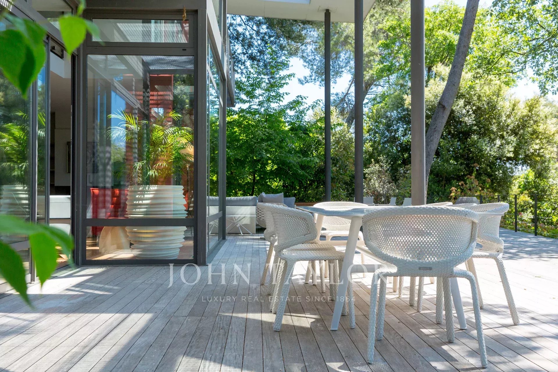Esta moderna propiedad de 350 m² está enclavada en un terreno arbolado con magníficos robles y pinos, a pocos metros de la Fundación Maeght. Diseñada en 2002 por el arquitecto italiano Antonino Cascio, esta villa es un referente de la arquitectura moderna, sobre todo por sus innovadoras características bioclimáticas.