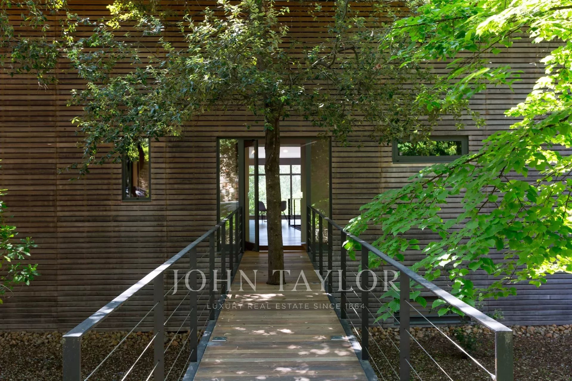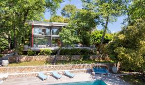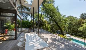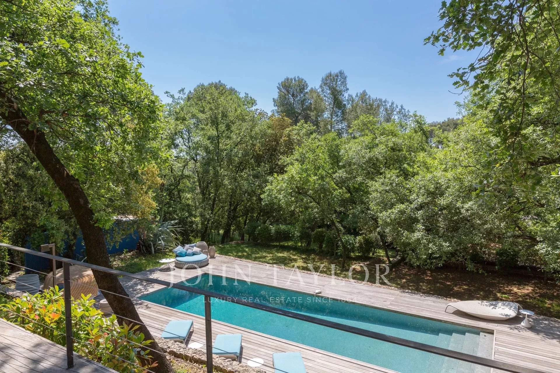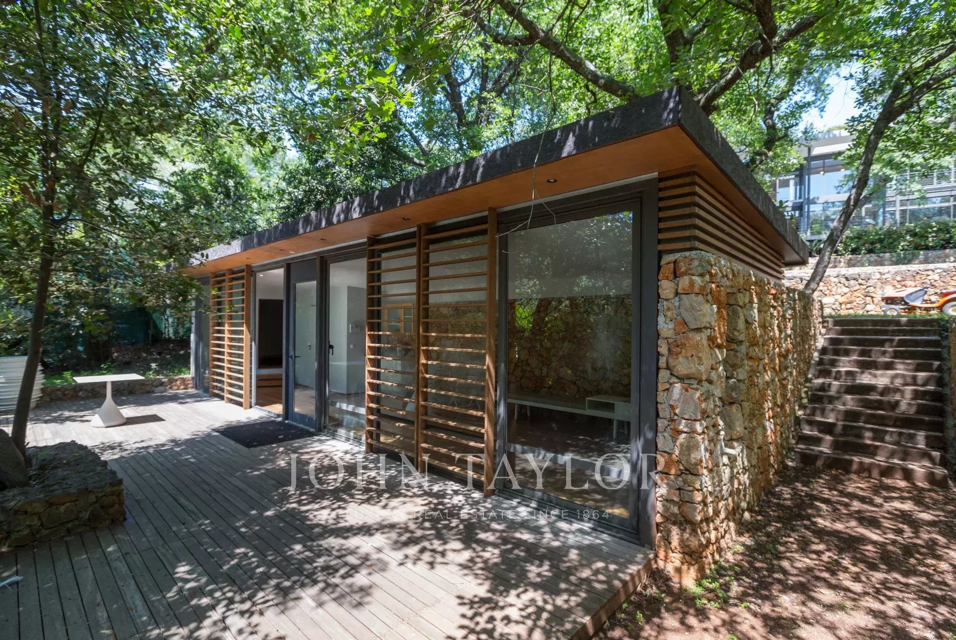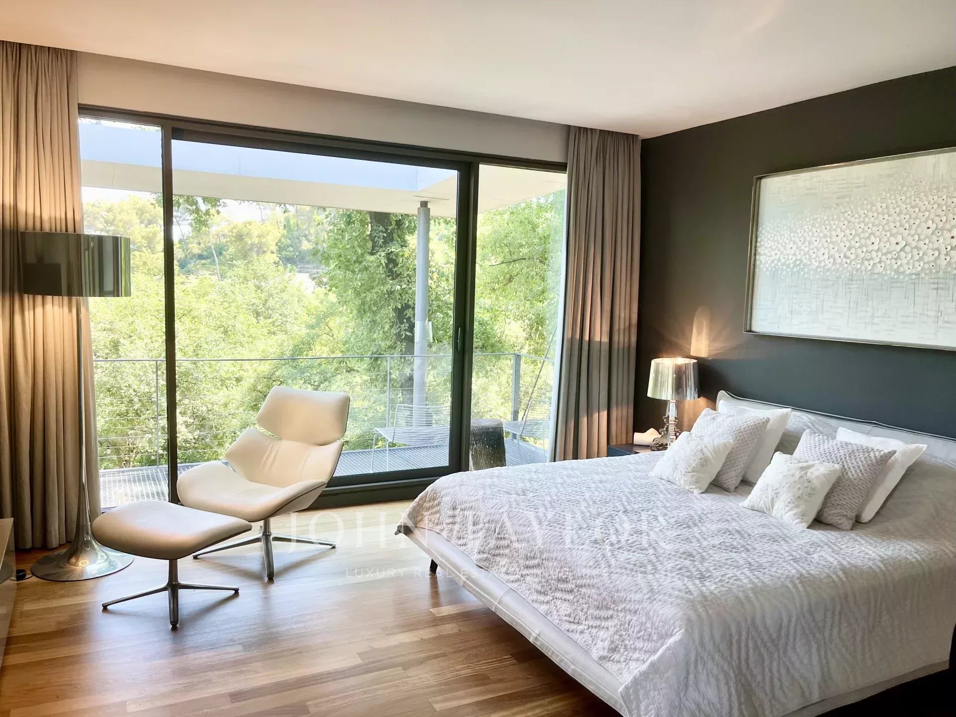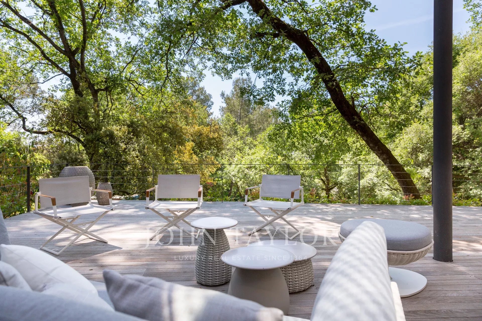Esta moderna propiedad de 350 m² está enclavada en un terreno arbolado con magníficos robles y pinos, a pocos metros de la Fundación Maeght. Diseñada en 2002 por el arquitecto italiano Antonino Cascio, esta villa es un referente de la arquitectura moderna, sobre todo por sus innovadoras características bioclimáticas.