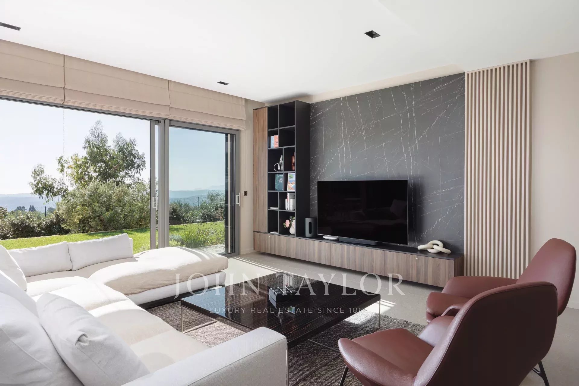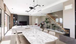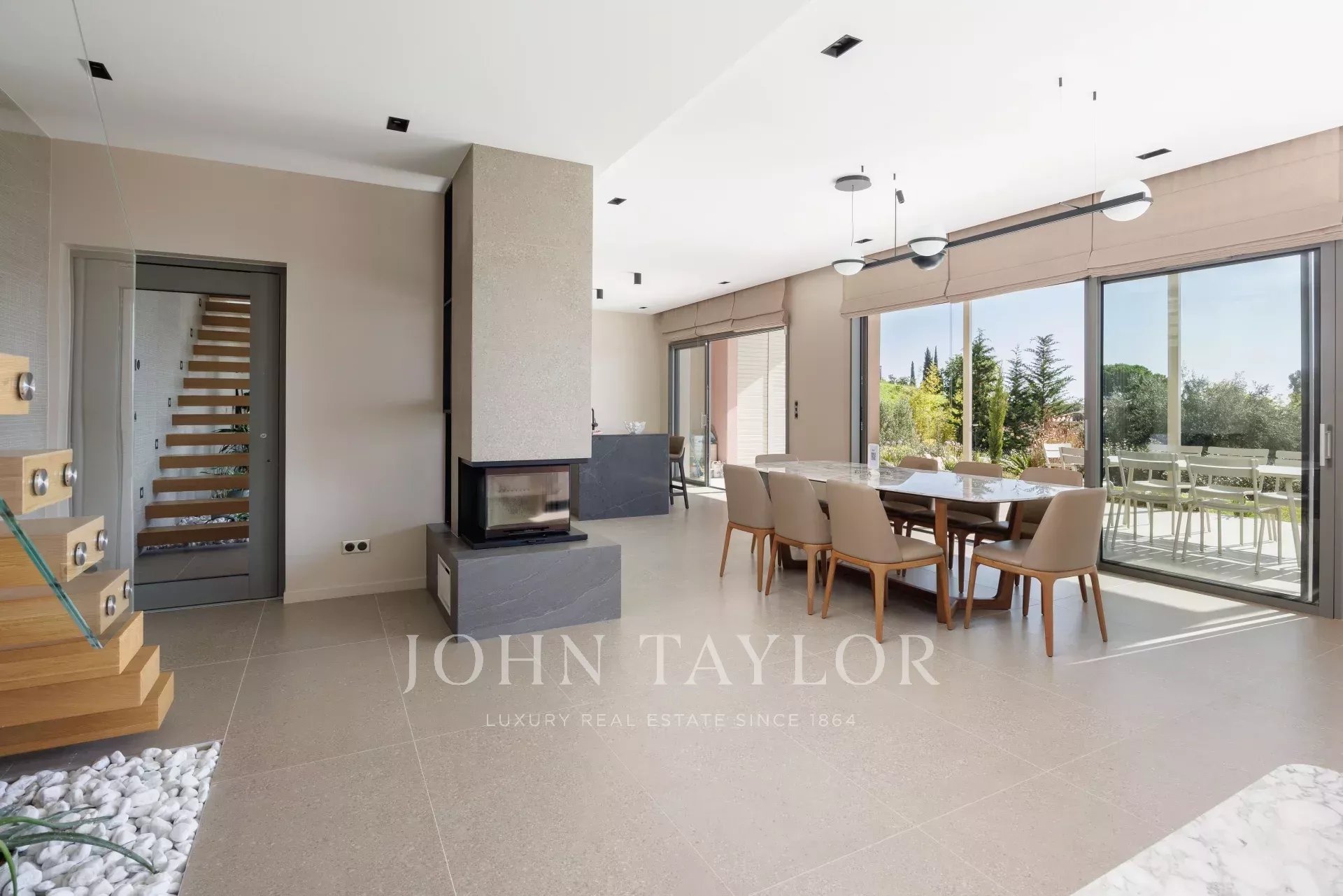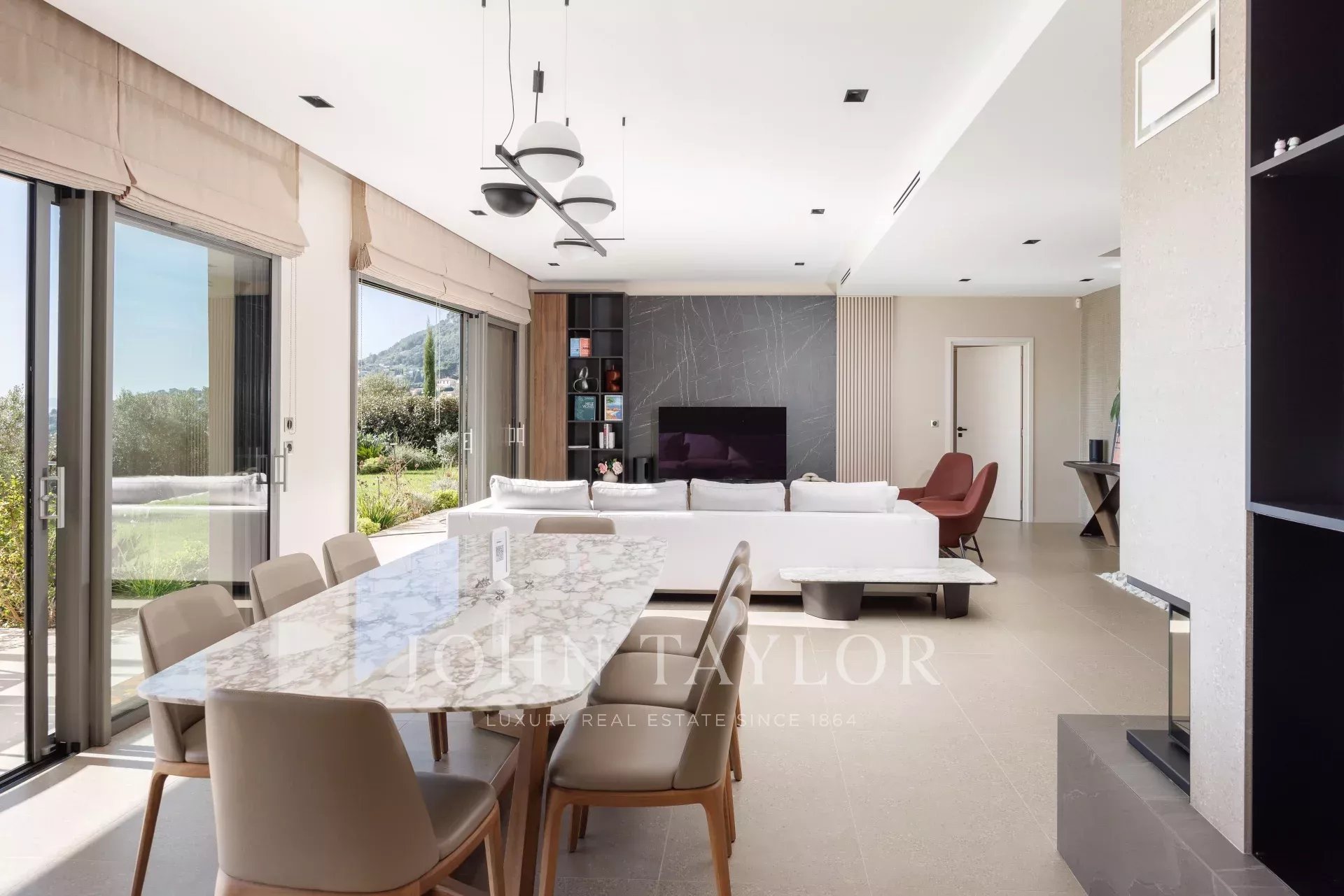En el exterior, un jardín paisajista y varias terrazas con pérgolas invitan a disfrutar de las impresionantes vistas y de la piscina, que puede climatizarse bajo petición, perfecta para relajarse en cualquier estación.