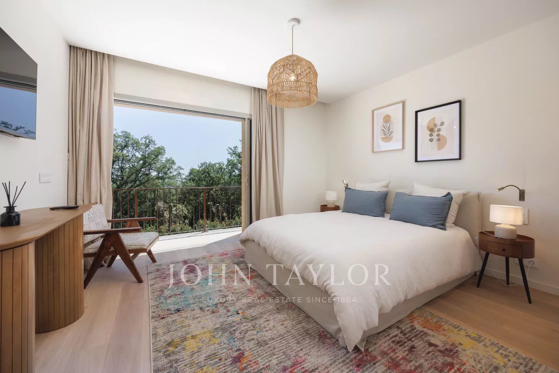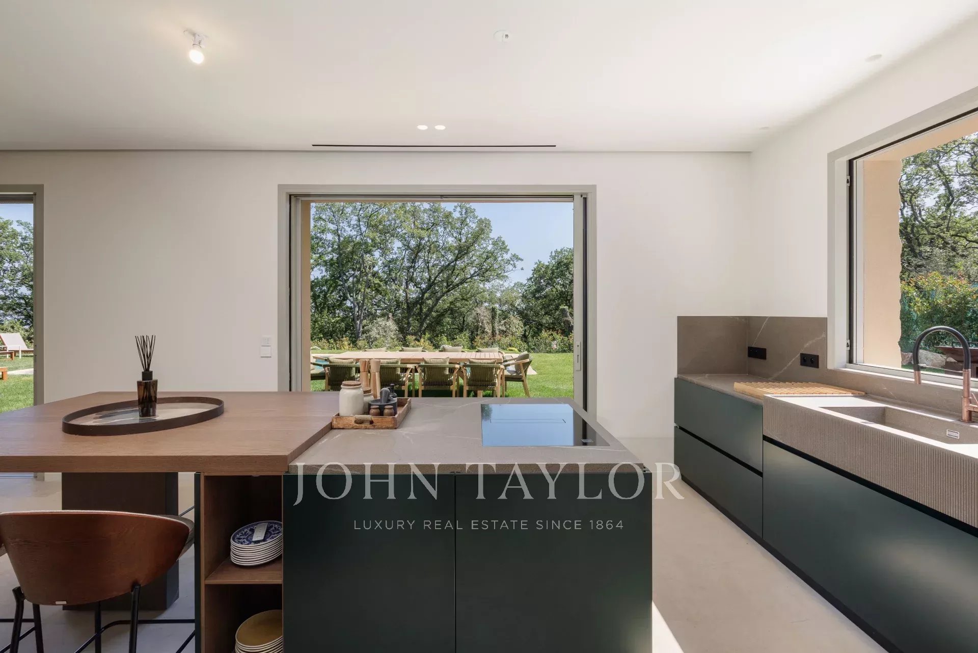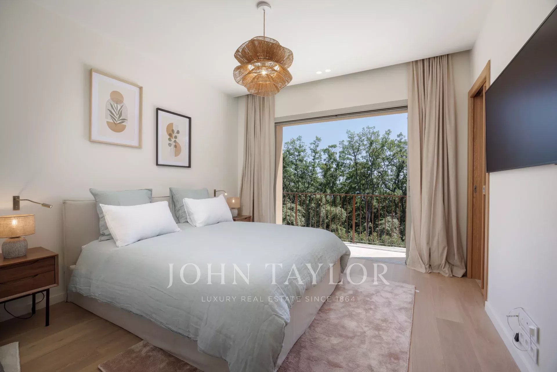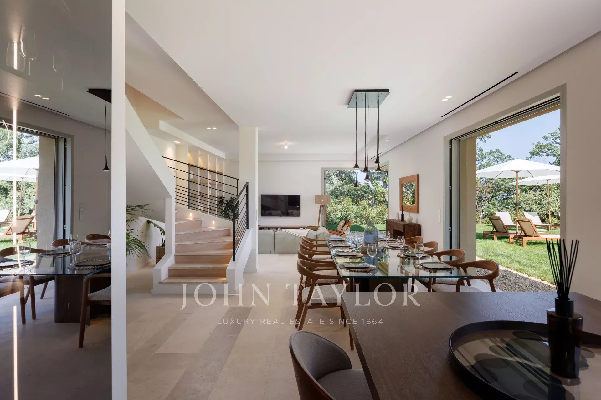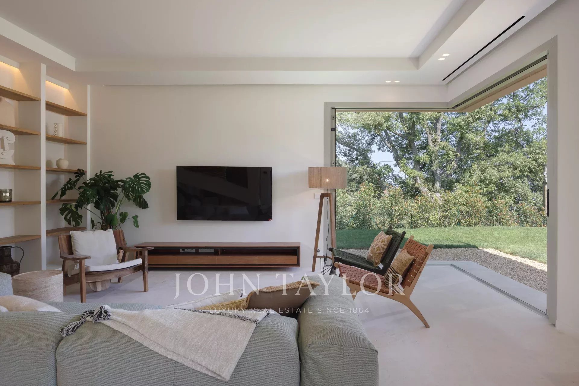 Enclavada en las codiciadas alturas de Vence, esta villa contemporánea ha sido completamente renovada para crear un ambiente elegante y luminoso.