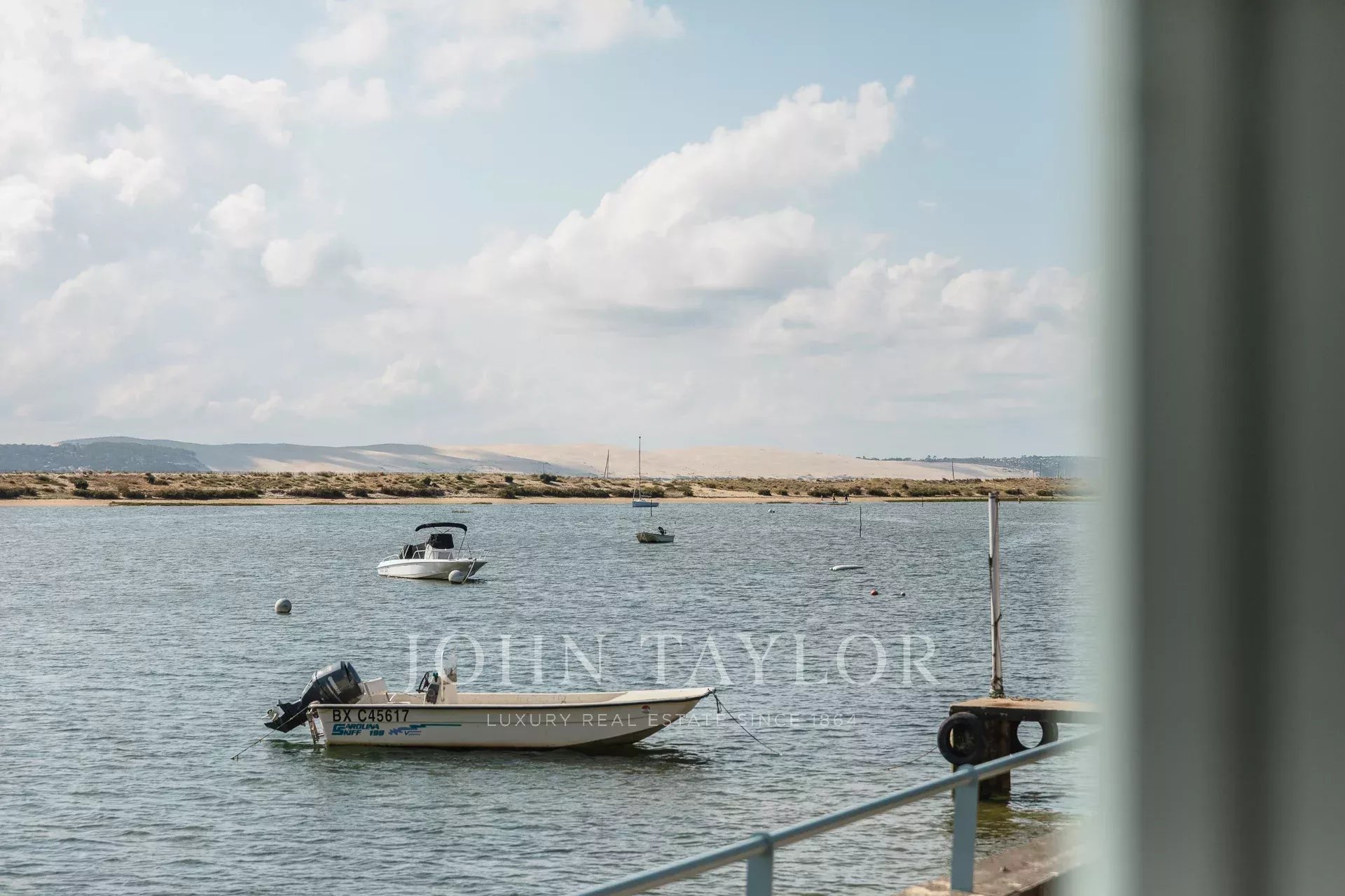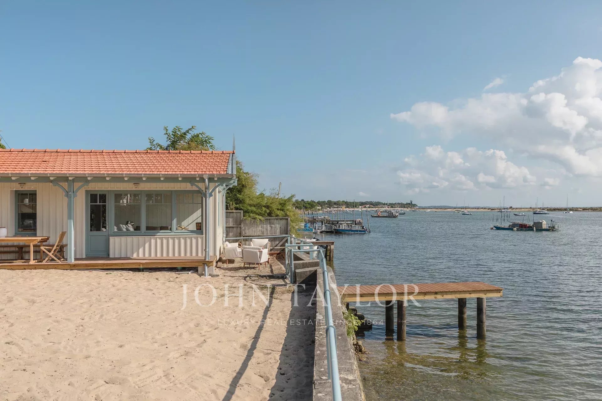 La casa principal cuenta con un luminoso salón abierto al Bassin, una cocina americana totalmente equipada, una estufa de etanol y un discreto videoproyector para pasar veladas acogedoras sin apartar la vista del paisaje.