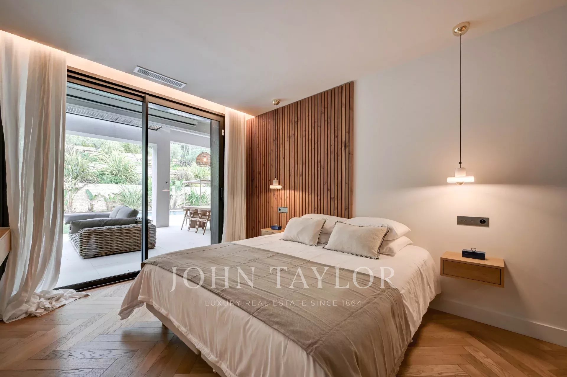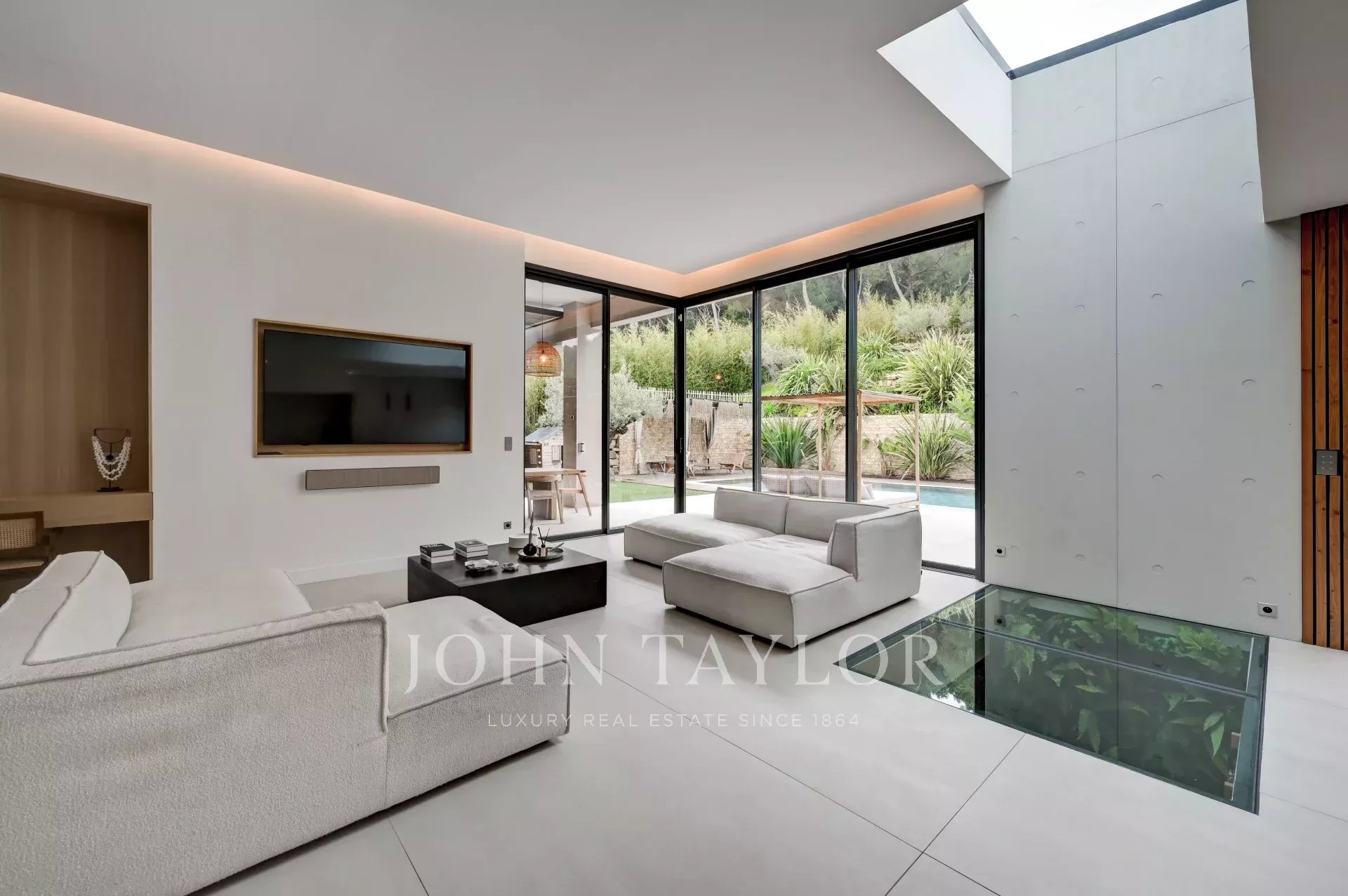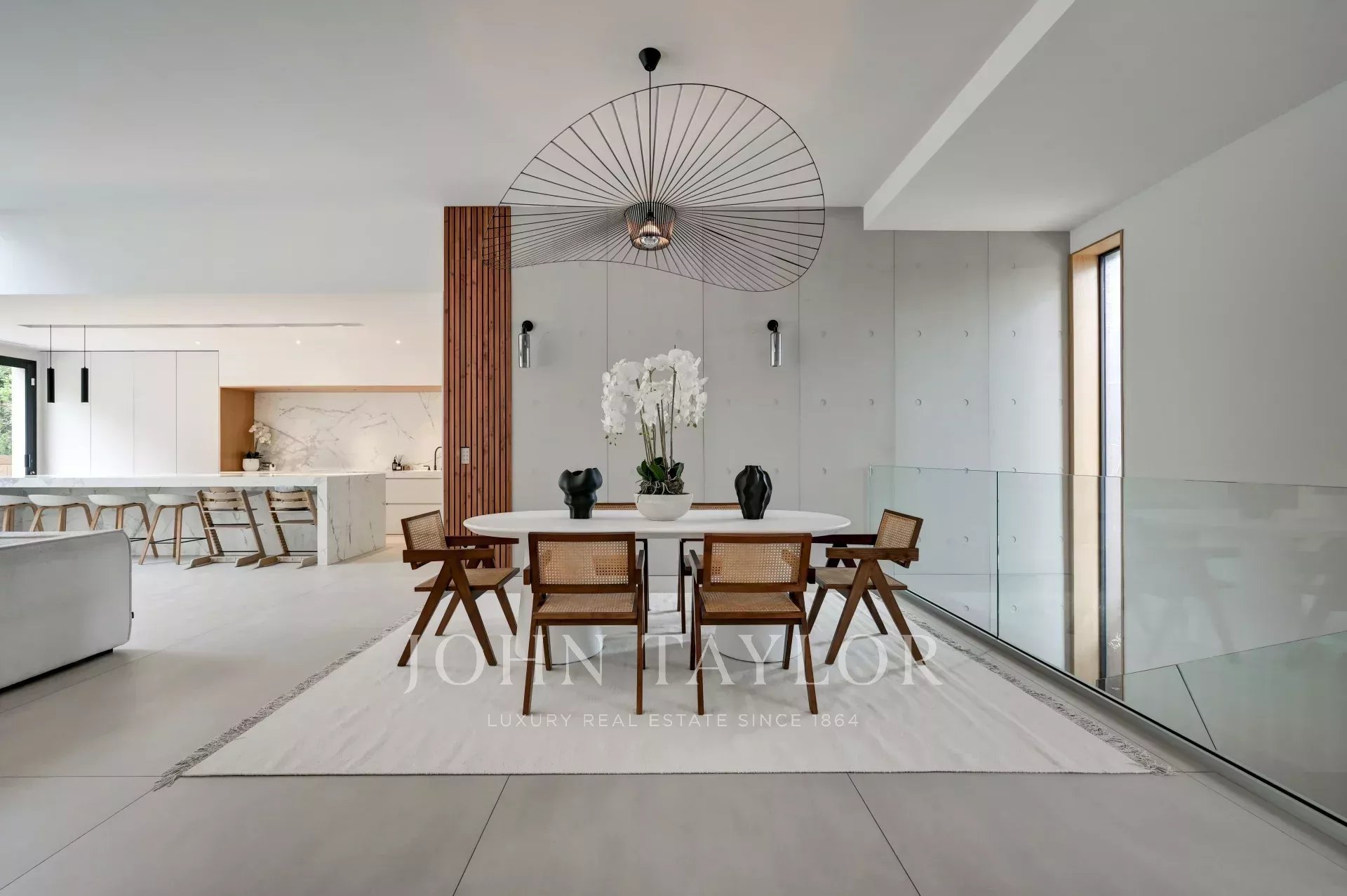 Nada más entrar, un elegante vestíbulo con una bodega acristalada marca la pauta de una propiedad con prestaciones de alta gama. La villa ofrece volúmenes generosos bañados de luz y una fluidez entre las zonas de estar.