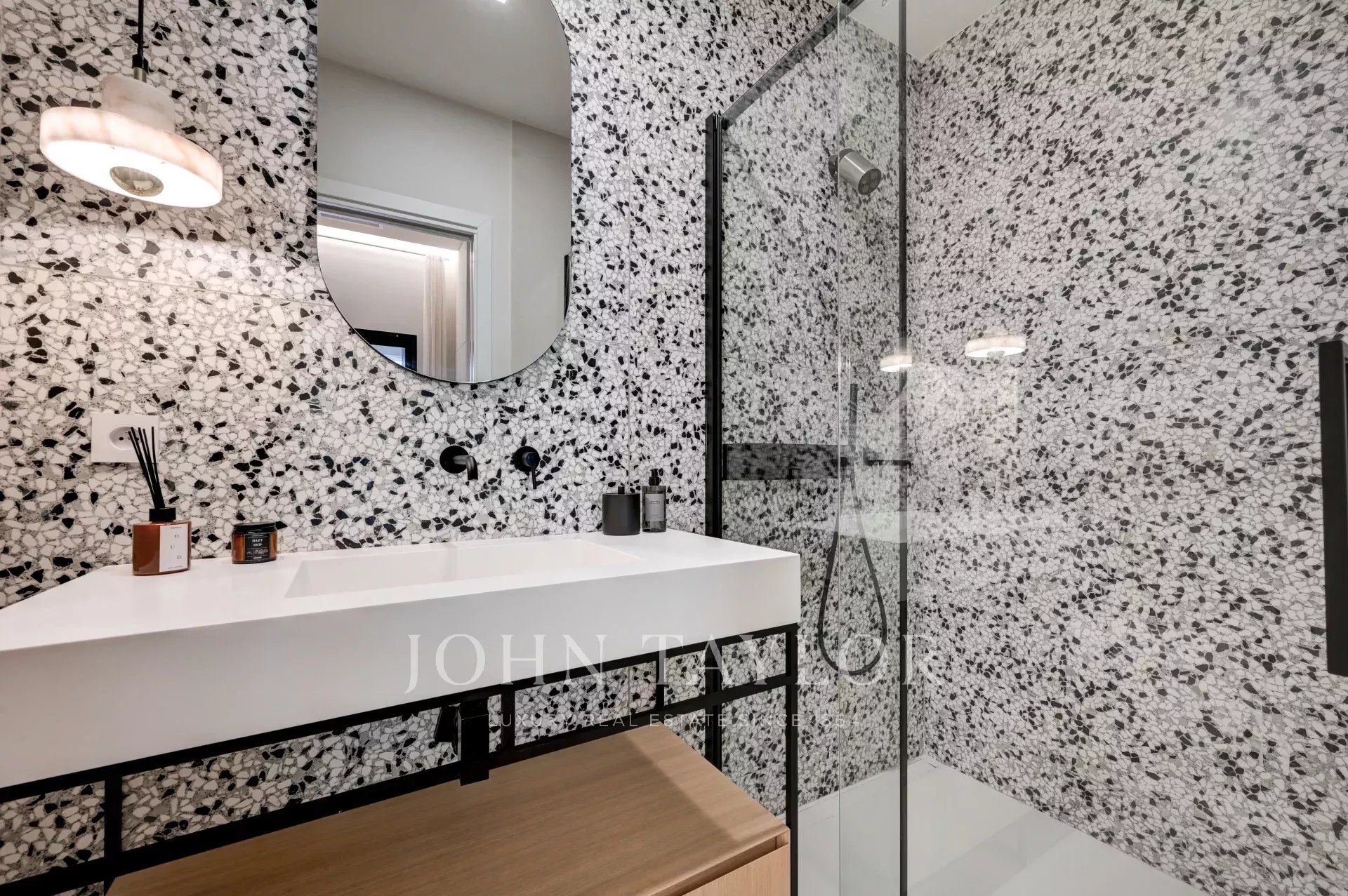 La planta baja cuenta con tres amplios dormitorios con cuartos de baño en suite, que ofrecen comodidad e independencia. En la planta superior, un amplio y luminoso salón se abre a una cocina americana contemporánea totalmente equipada, ideal para el entretenimiento. Este nivel también incluye un dormitorio adicional con cuarto de baño con ducha, así como una refinada suite principal, un verdadero espacio para el bienestar.