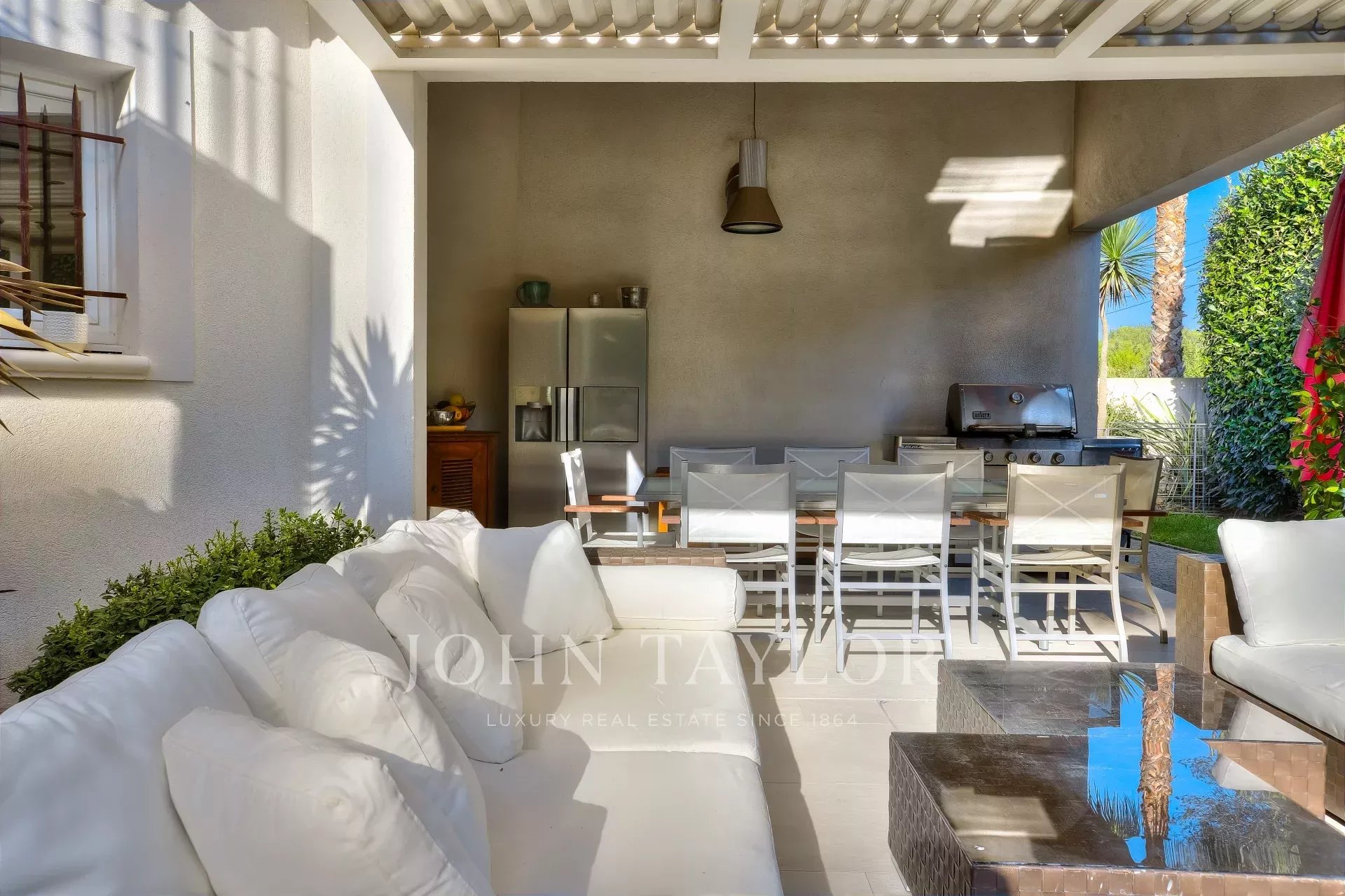 Preciosa terraza cubierta con cocina de verano, barbacoa de gas, zona de estar y comedor exterior - perfecta para comidas con familia y amigos