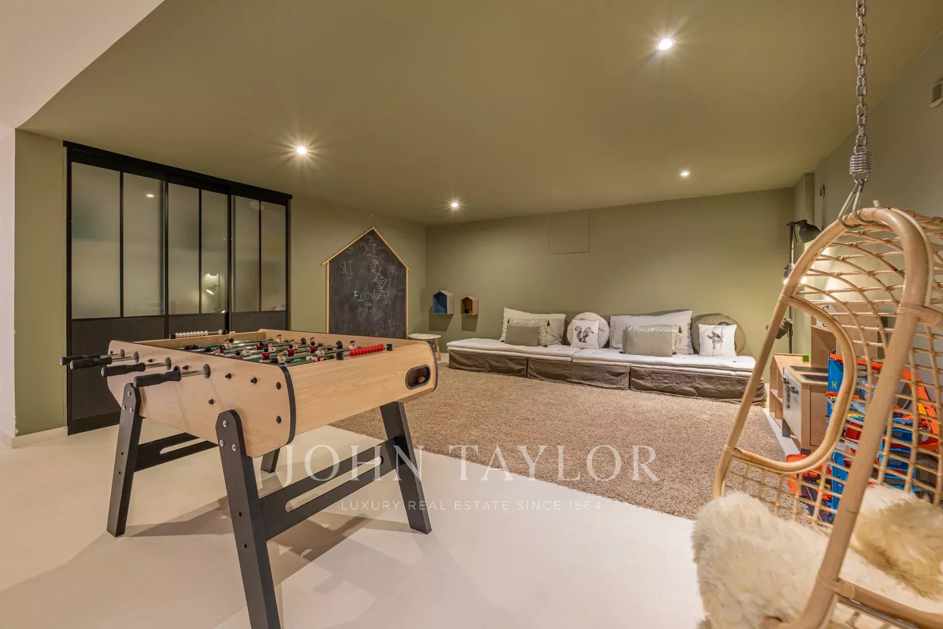 En una urbanización privada y segura, a pocos minutos del casco antiguo de Mougins, descubra esta magnífica villa de unos 415 m² de superficie habitable, enclavada en el corazón de un jardín llano y paisajístico con piscina climatizada y zona de petanca.