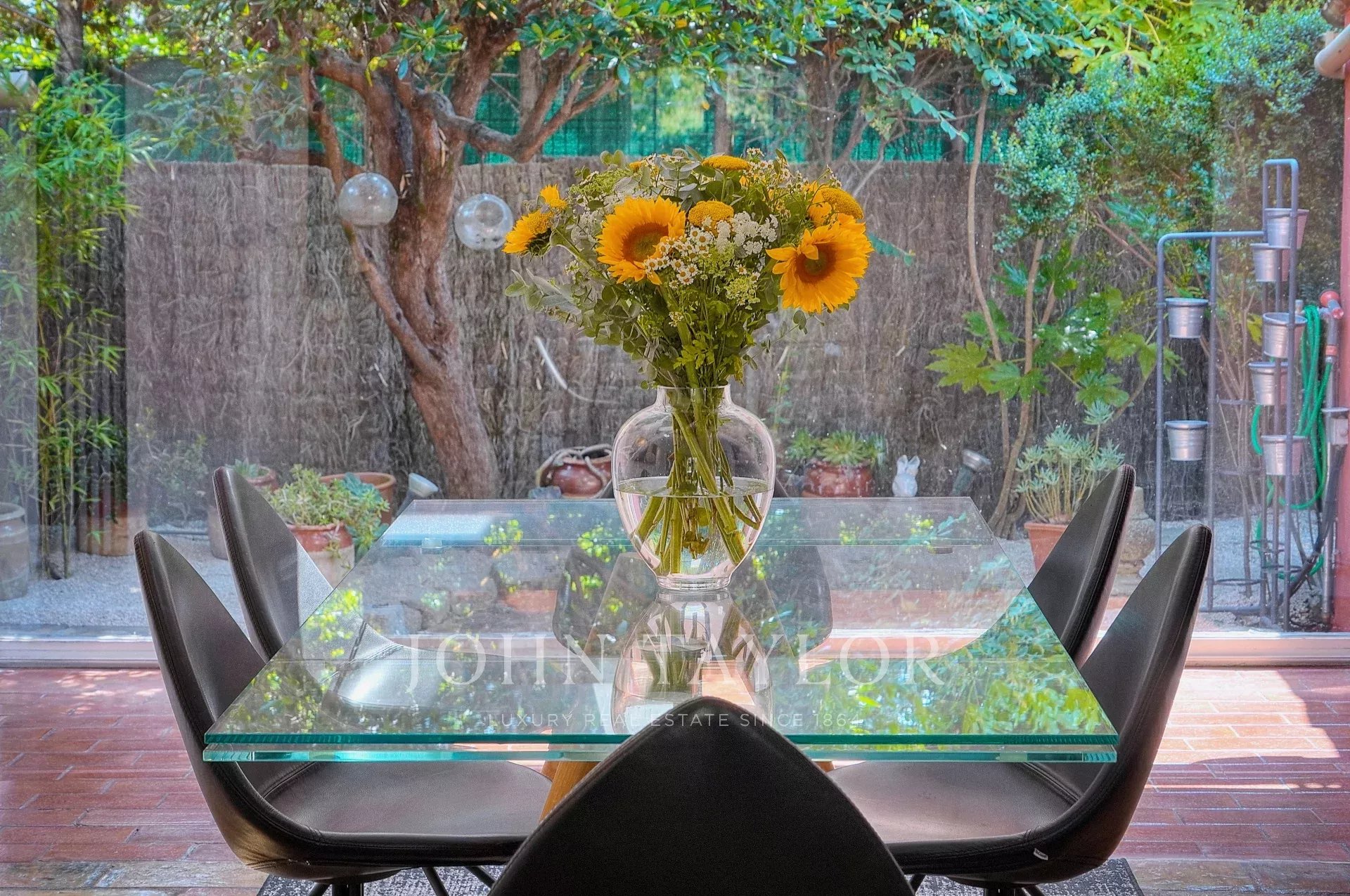 Comedor con capacidad para 12 comensales, abierto a un patio a través de un gran ventanal