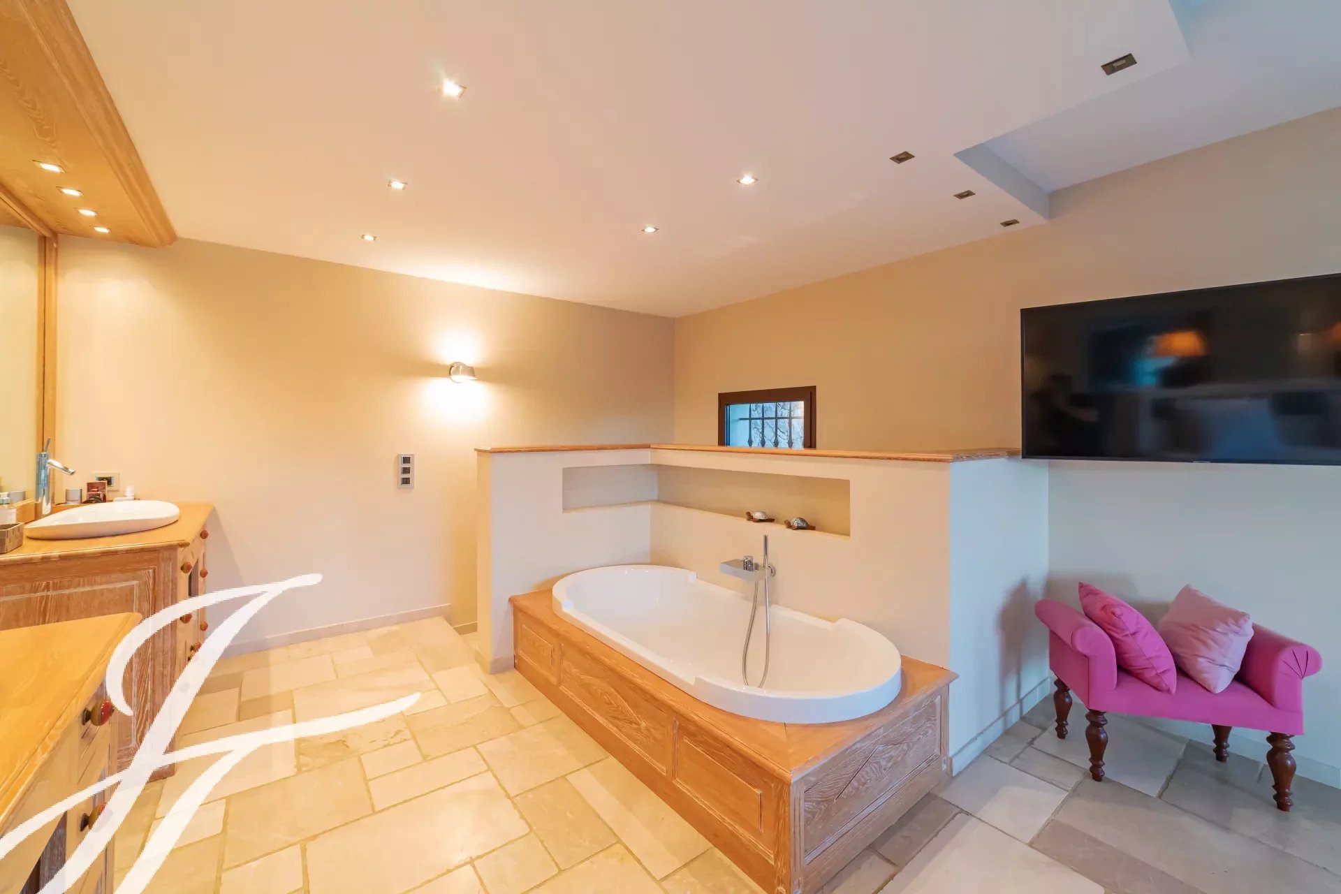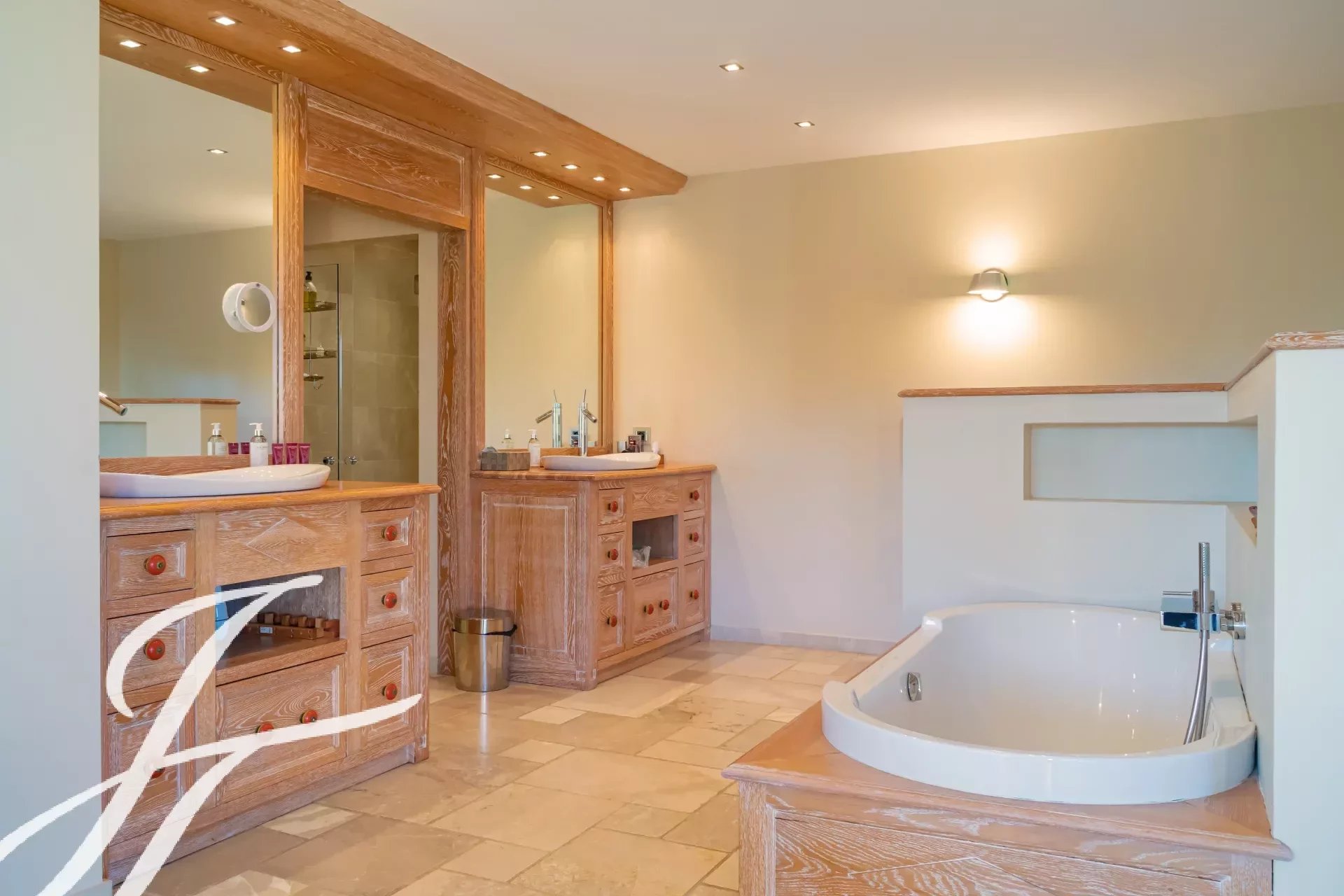 Amplia suite principal con baño en suite con bañera, lavabo doble, dos duchas y WC separado