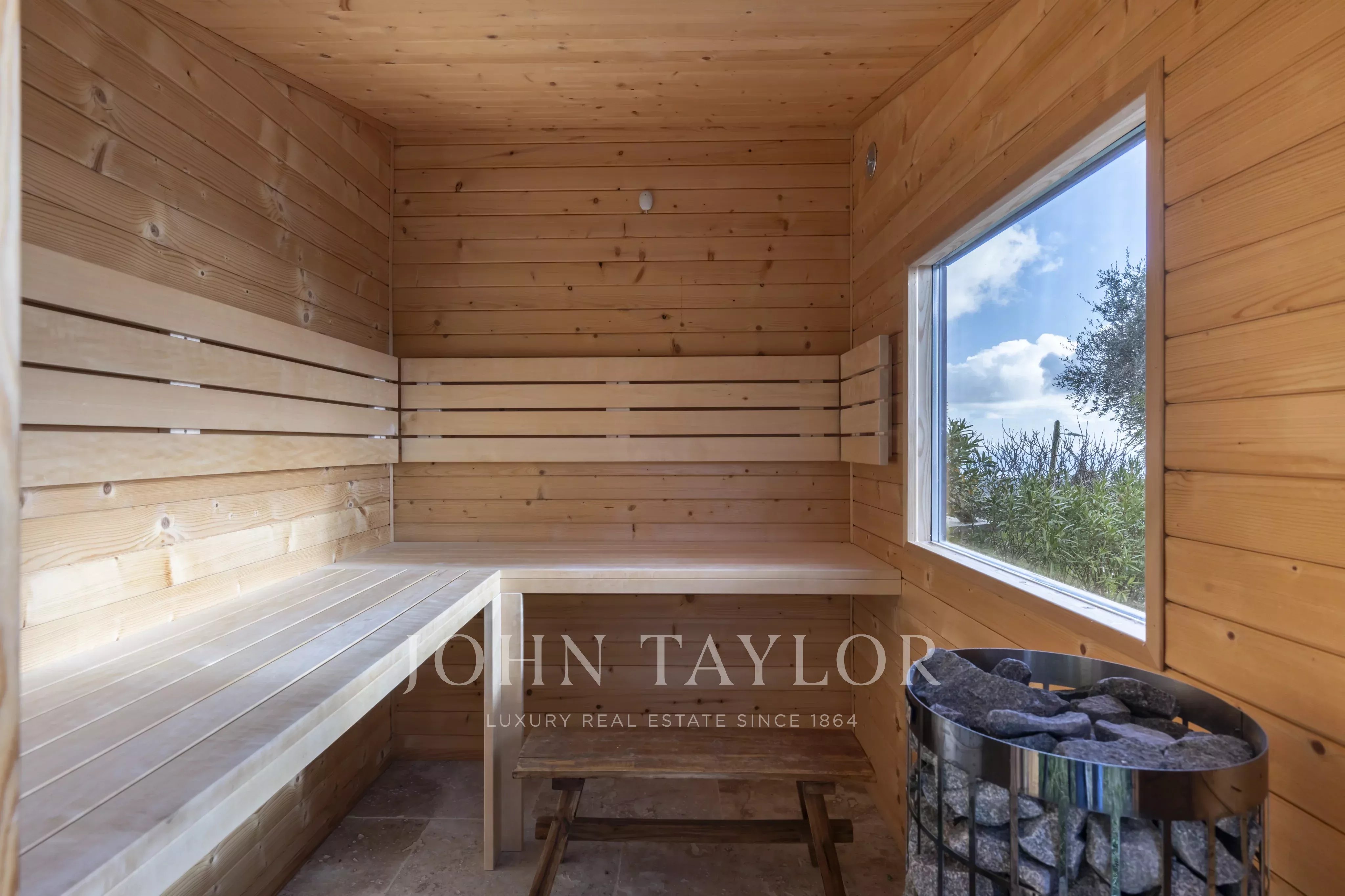 Los espacios exteriores invitan a la relajación con una piscina, un jardín ajardinado y un sauna exterior, perfecto para momentos de bienestar.