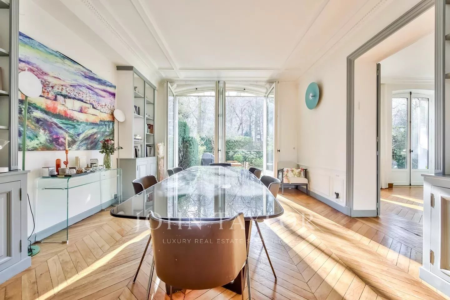 En las inmediaciones de los jardines de Ranelagh, en un edificio de piedra franca seguro con conserje. Le ofrecemos un piso de recepción y familiar en el nivel del jardín, orientado al sur, con una superficie de 226,88 m² (ley Carrez).