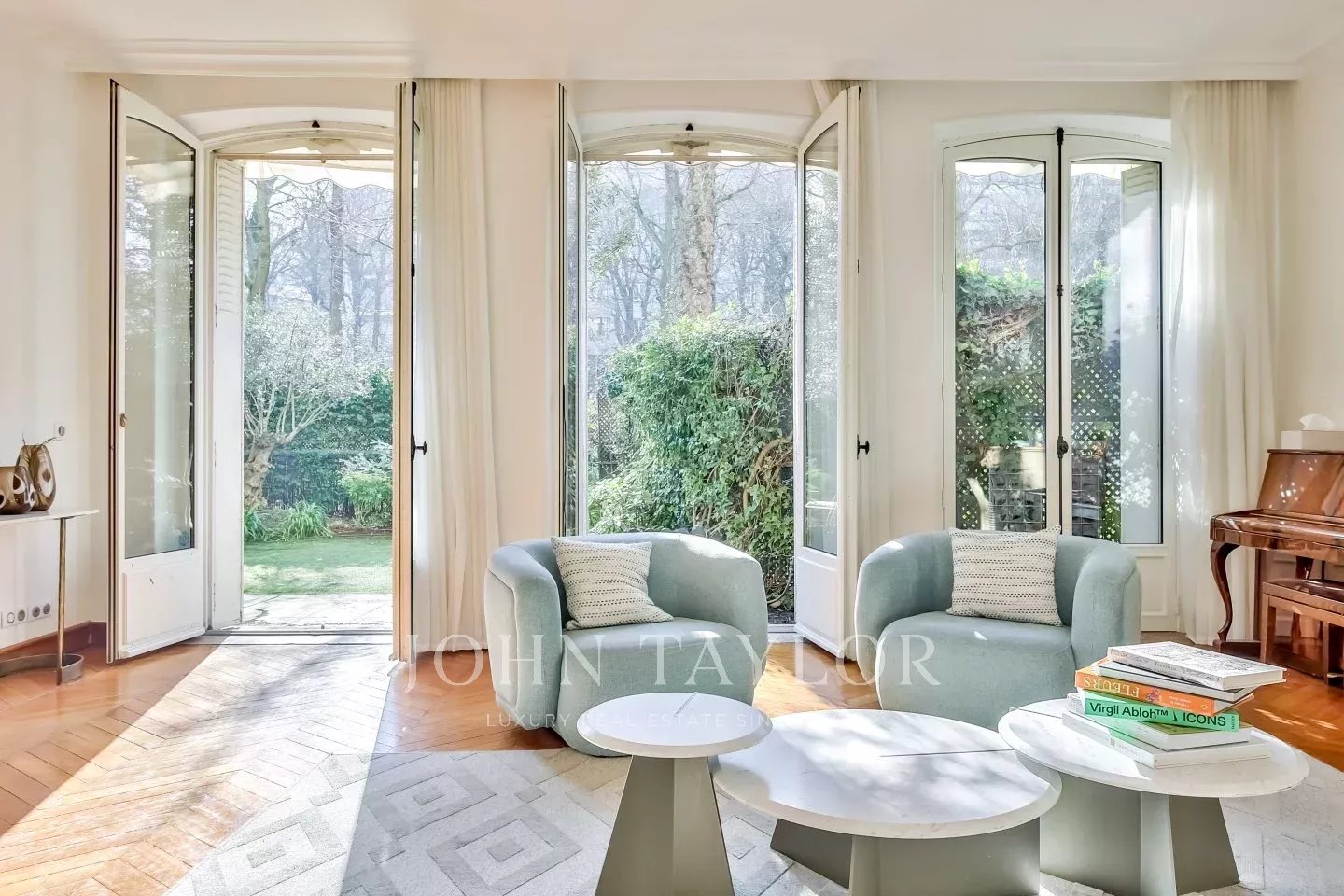- Un salón triple que da al jardín de 120 m² con árboles