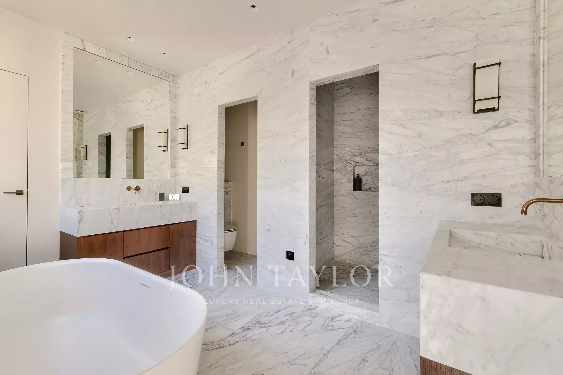 Situado en la última planta, el apartamento se articula en torno a amplios balcones inclinados y goza de una notable luminosidad durante todo el día. Sus volúmenes elegantes y sus acabados de alta gama ofrecen un ambiente refinado, a la vez contemporáneo e intemporal.