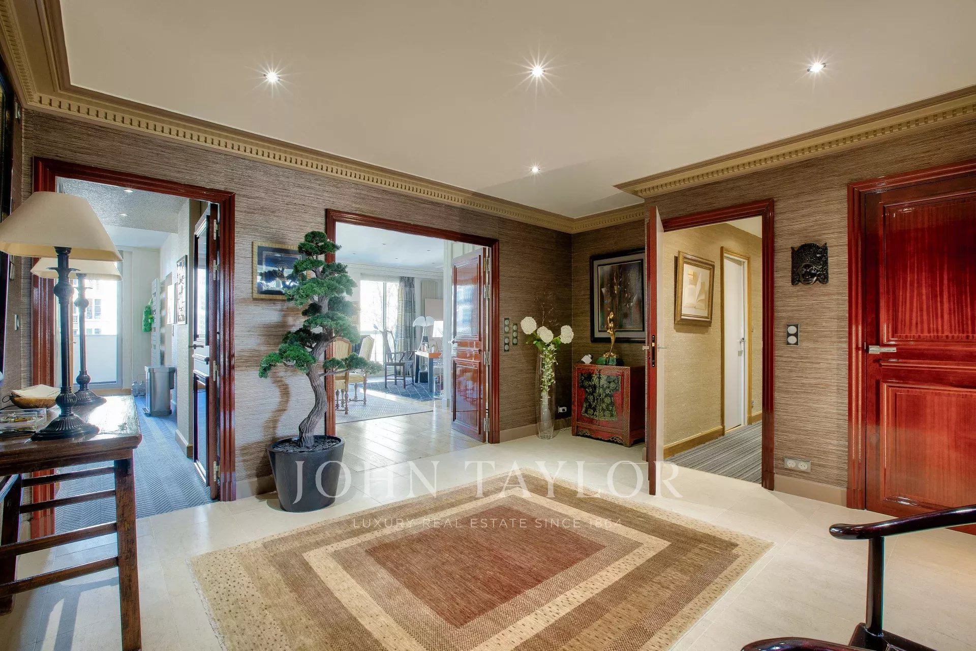 Con vistas a los jardines de Ranelagh y a la Torre Eiffel sin obstáculos, este piso de 228,47 m² (209,44 m² carrez) ofrece una vista panorámica, con cada habitación abierta a balcones muy grandes a través de ventanales.