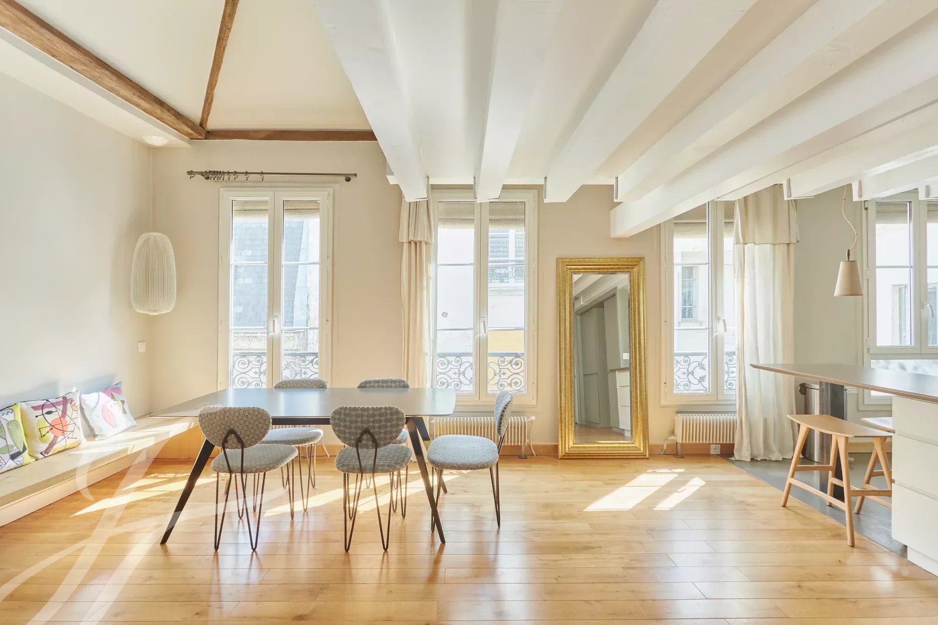 A dos pasos del Museo Carnavalet y de la Place des Vosges, en la 4ª y última planta, este bonito piso dúplex con carácter dispone de 60,15 m² de superficie (49,32 m² carrez).