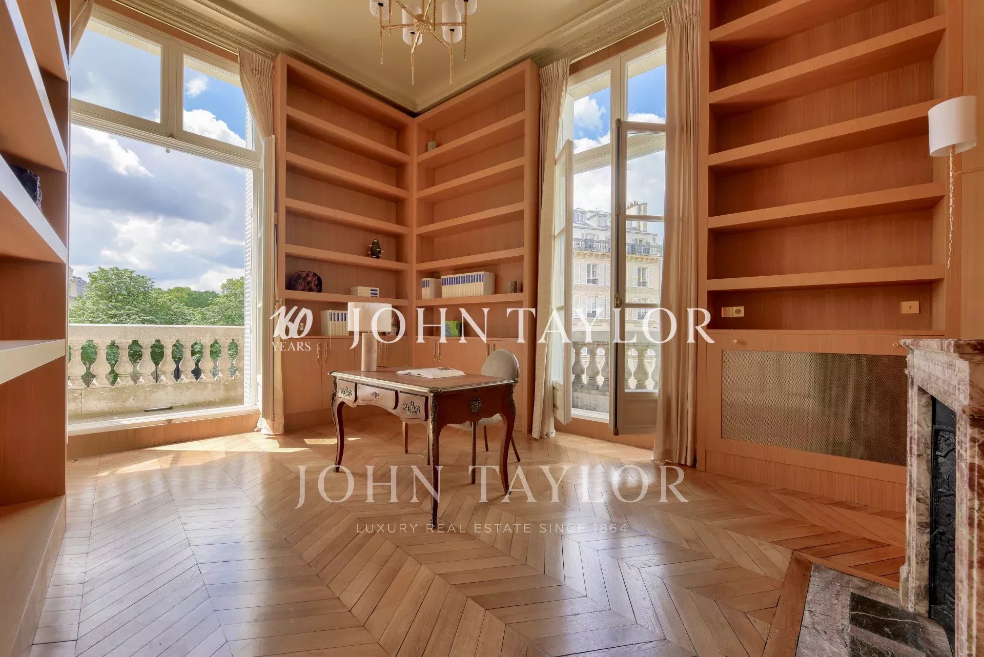 - un estudio esquinero muy elegante, con paneles de madera y vistas al Palacio del Elíseo