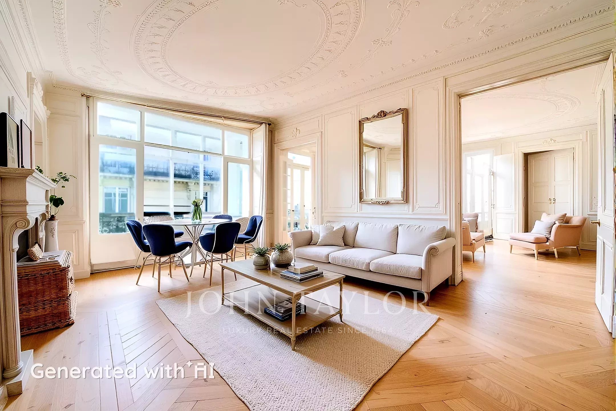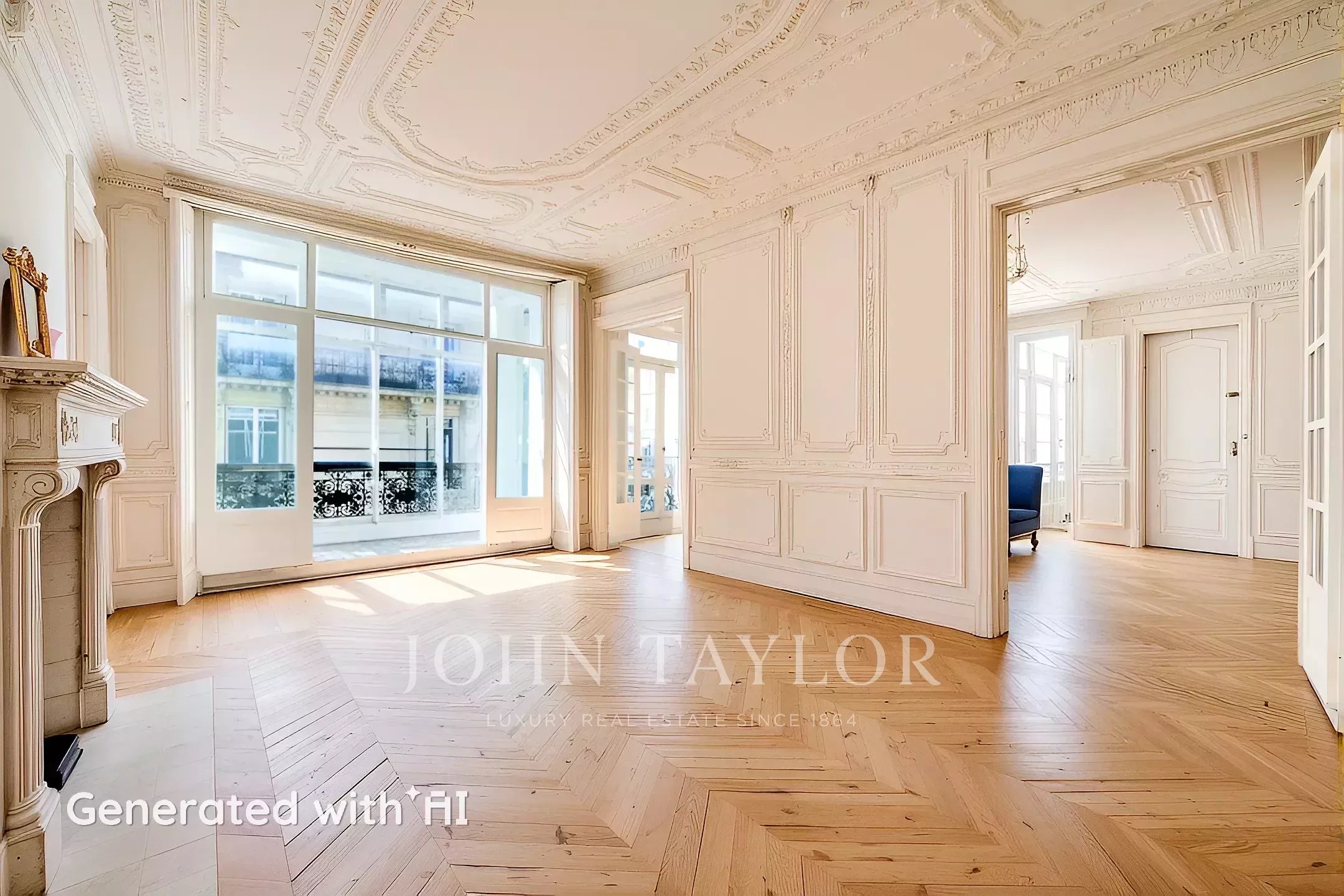 En el corazón del Triángulo de Oro, cerca de la avenida George V, en un edificio de estilo haussmaniano de bella construcción y con seguridad, le ofrecemos un piso de 165m².