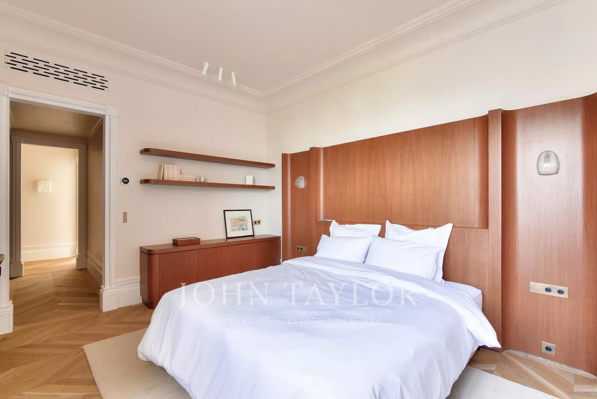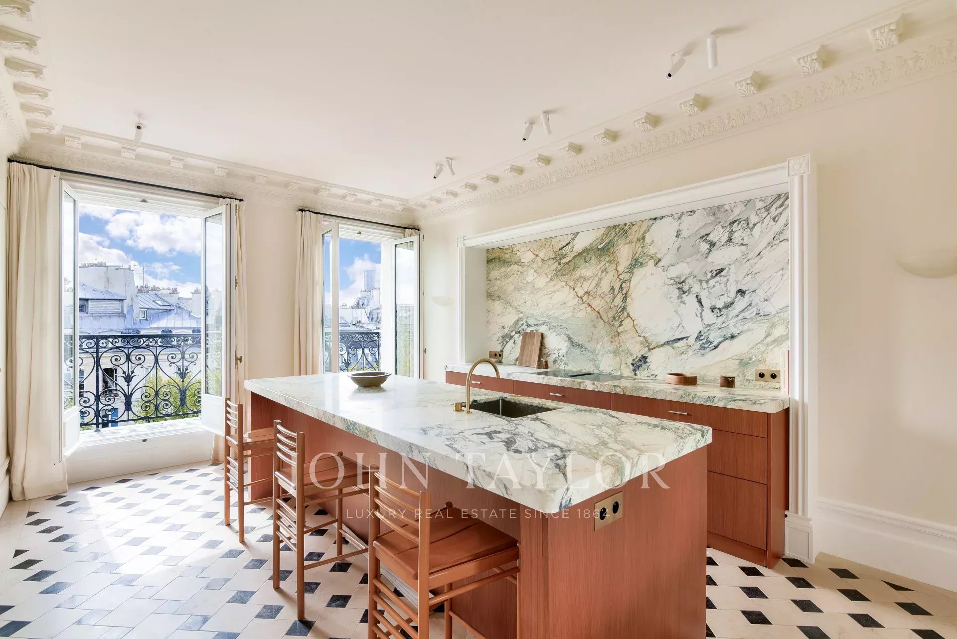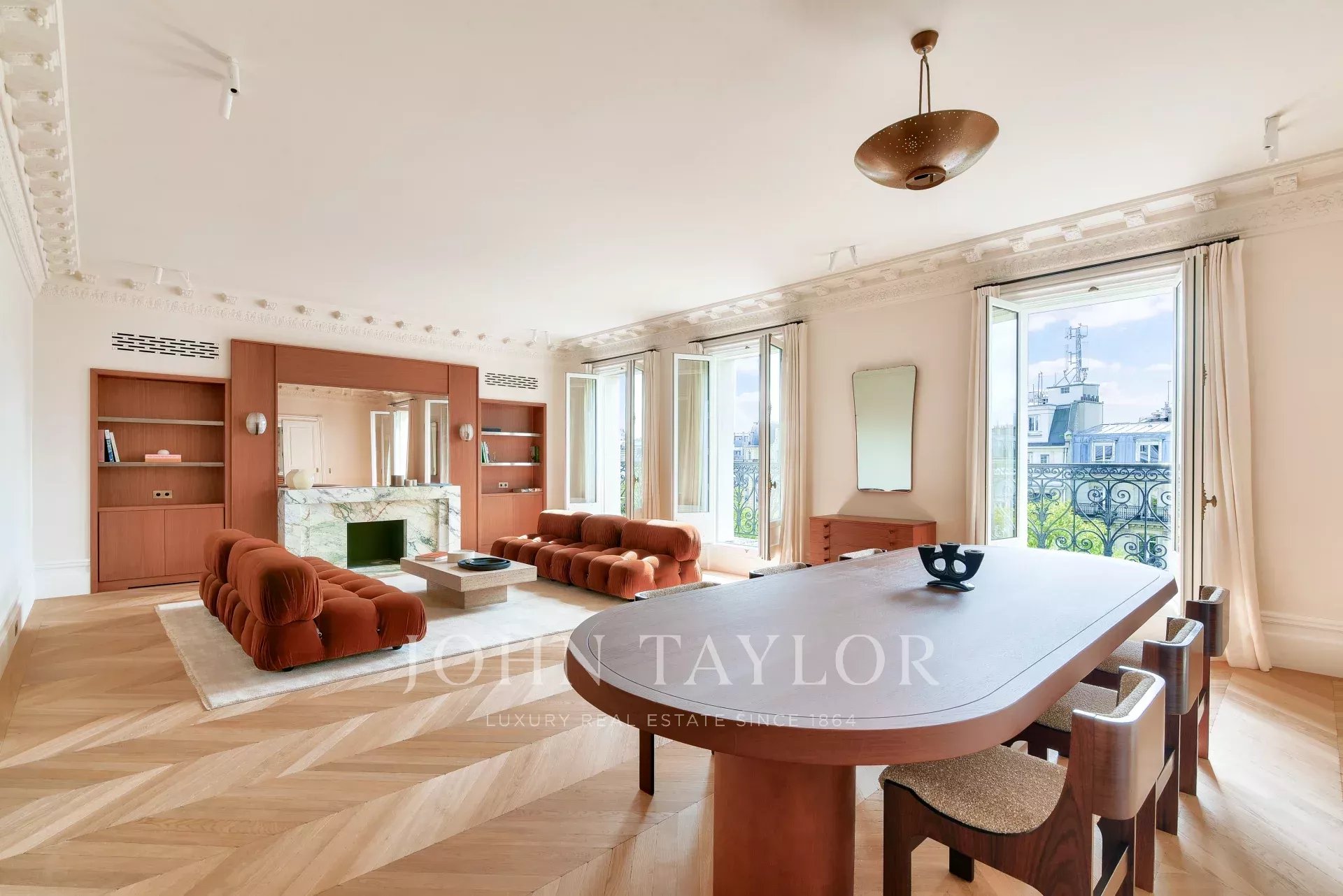 Este piso totalmente climatizado combina el encanto del pasado con la modernidad: suelos de parqué y mármol, molduras y una chimenea, todo ello parte de una renovación de alta gama.