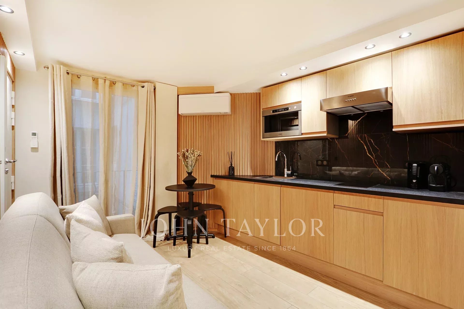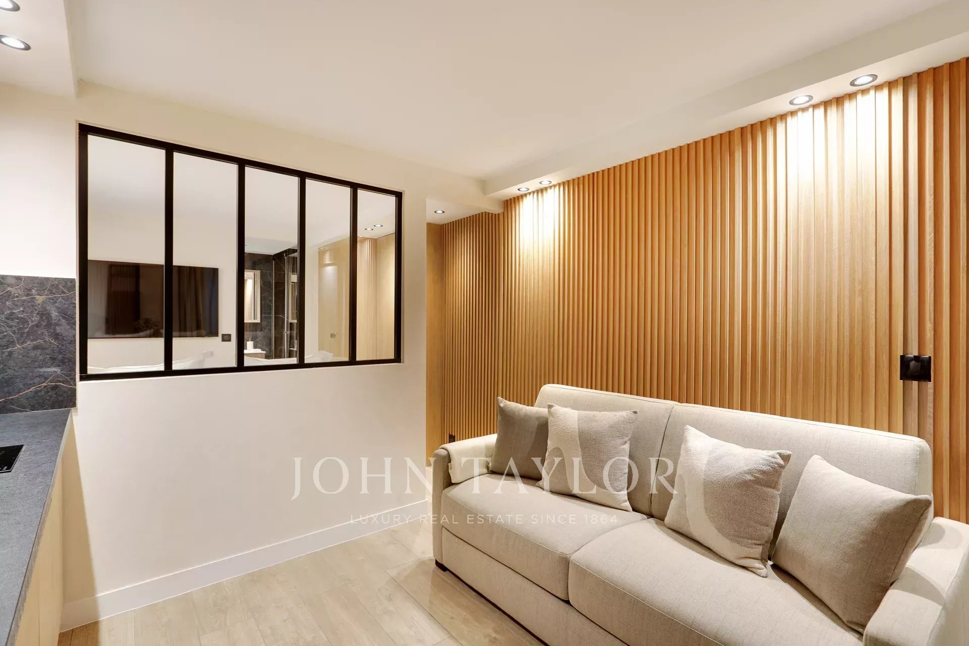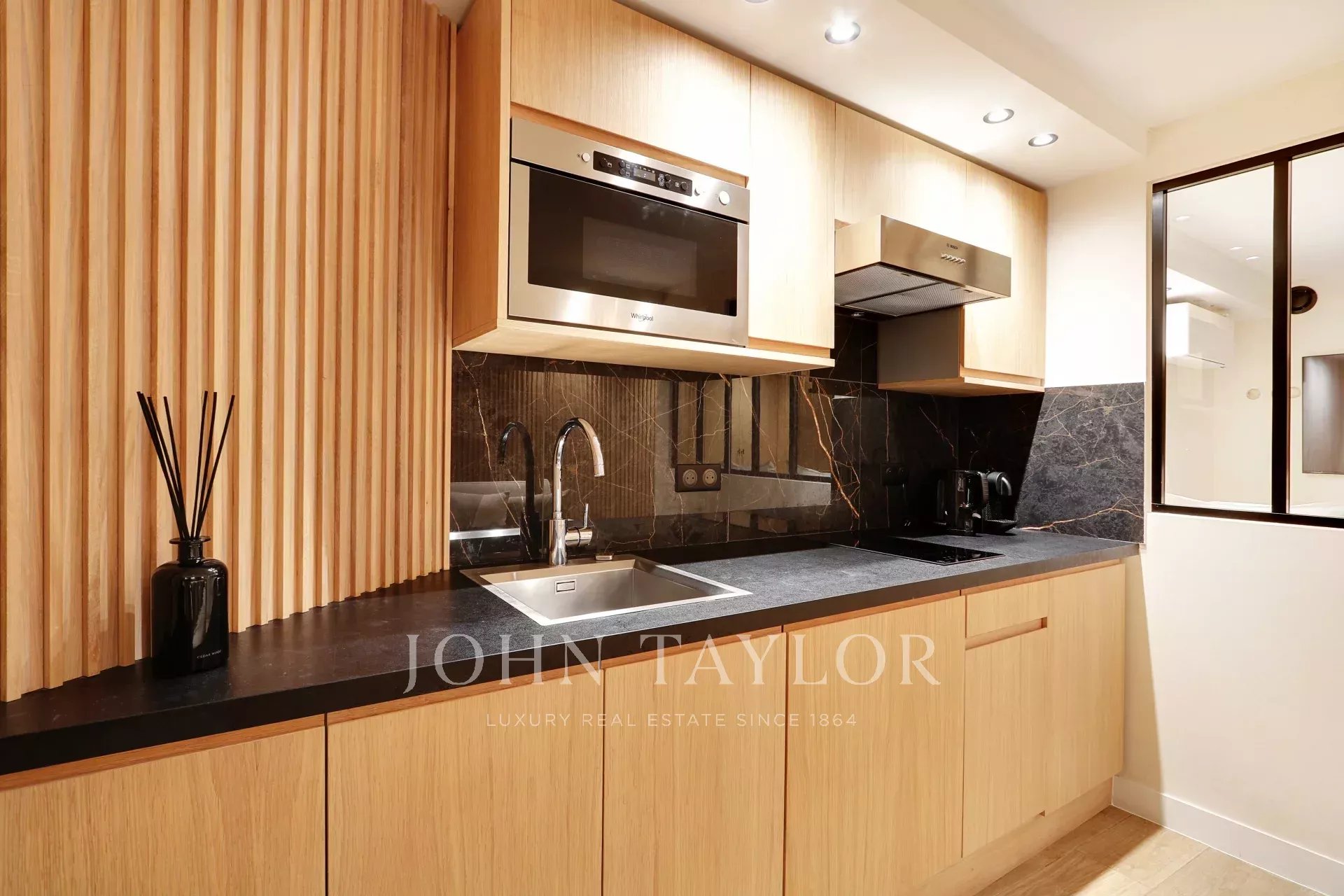 En el corazón de la ciudad, rue Saint André des Arts, en un edificio de principios del siglo X, este magnífico apartamento de dos habitaciones de 22m2 ha sido completamente reformado por un arquitecto utilizando materiales de calidad.