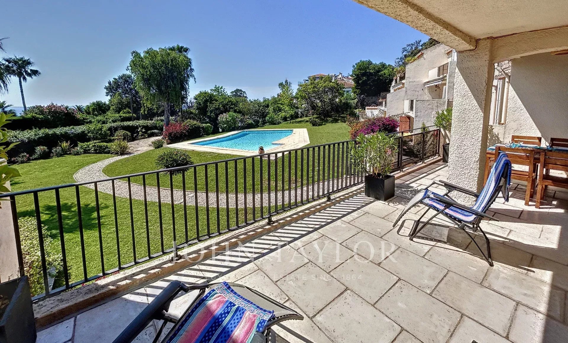 La copropiedad incluye un gran jardín, una pista de petanca, una piscina y garajes.