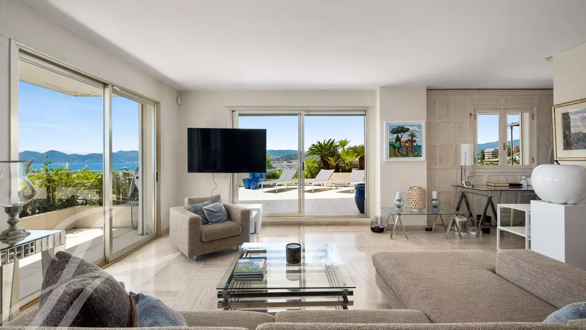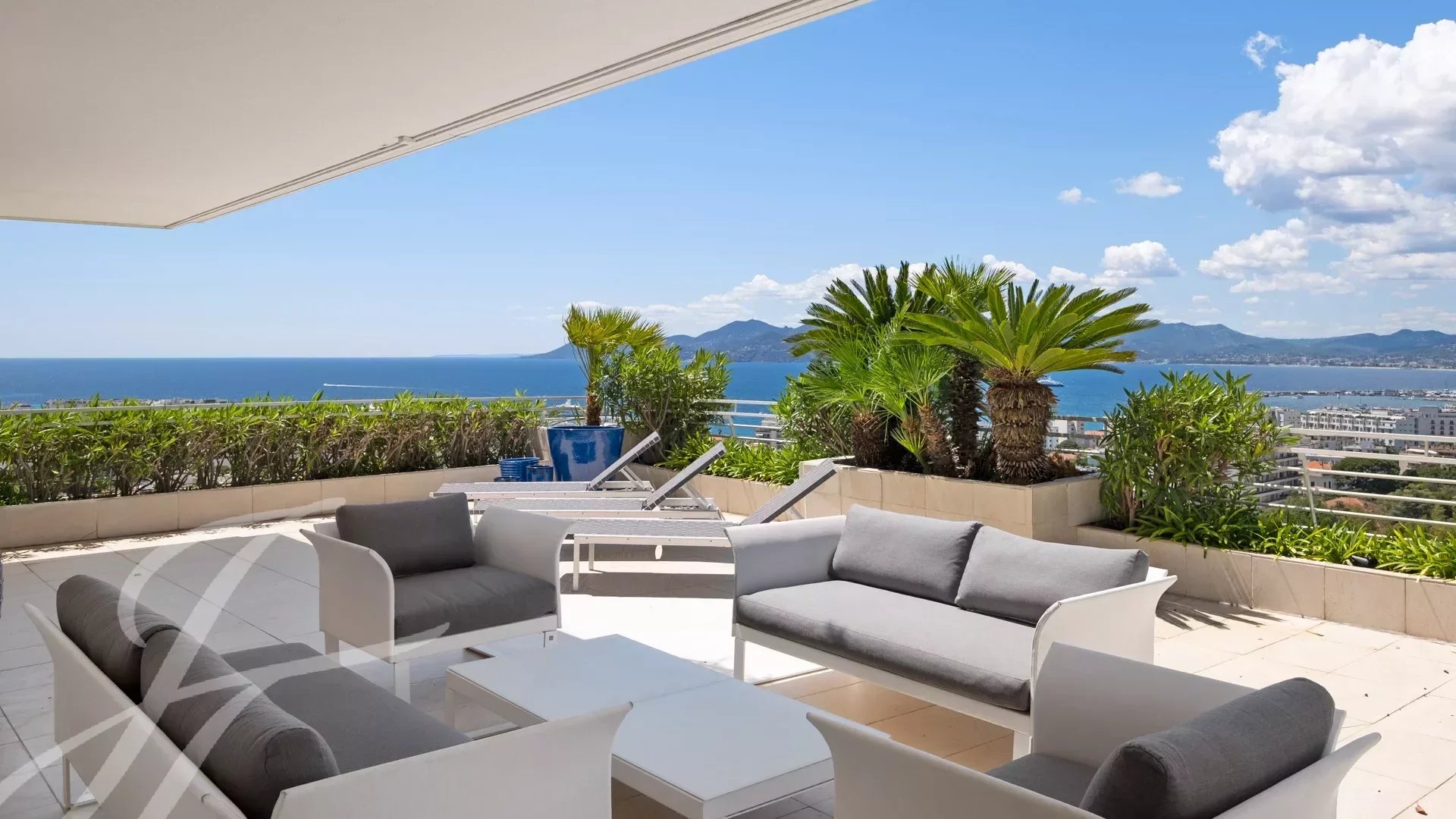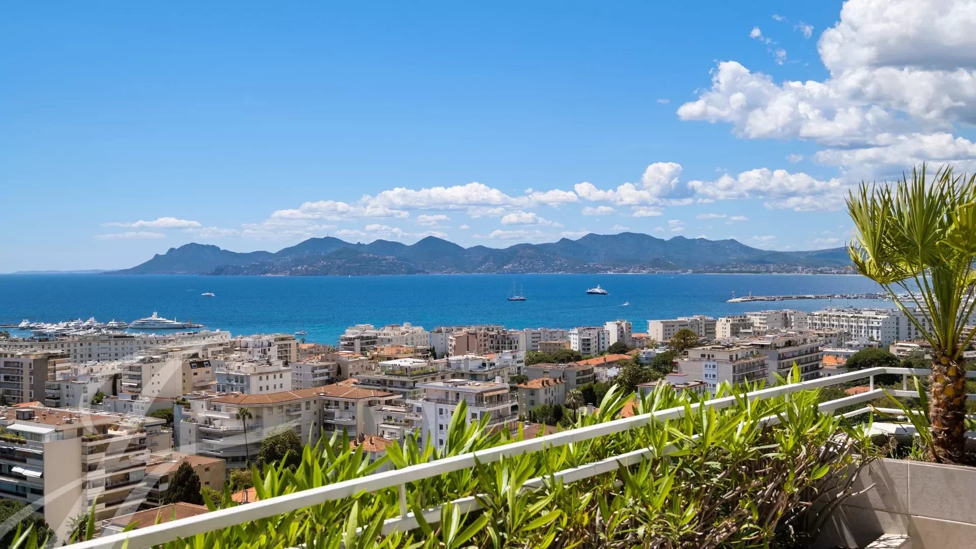 En una residencia de lujo de Basse Californie, este magnífico piso esquinero dispone de una gran terraza con vistas ininterrumpidas al mar, a las islas Lérins, a la bahía de Cannes y a los montes Esterel.