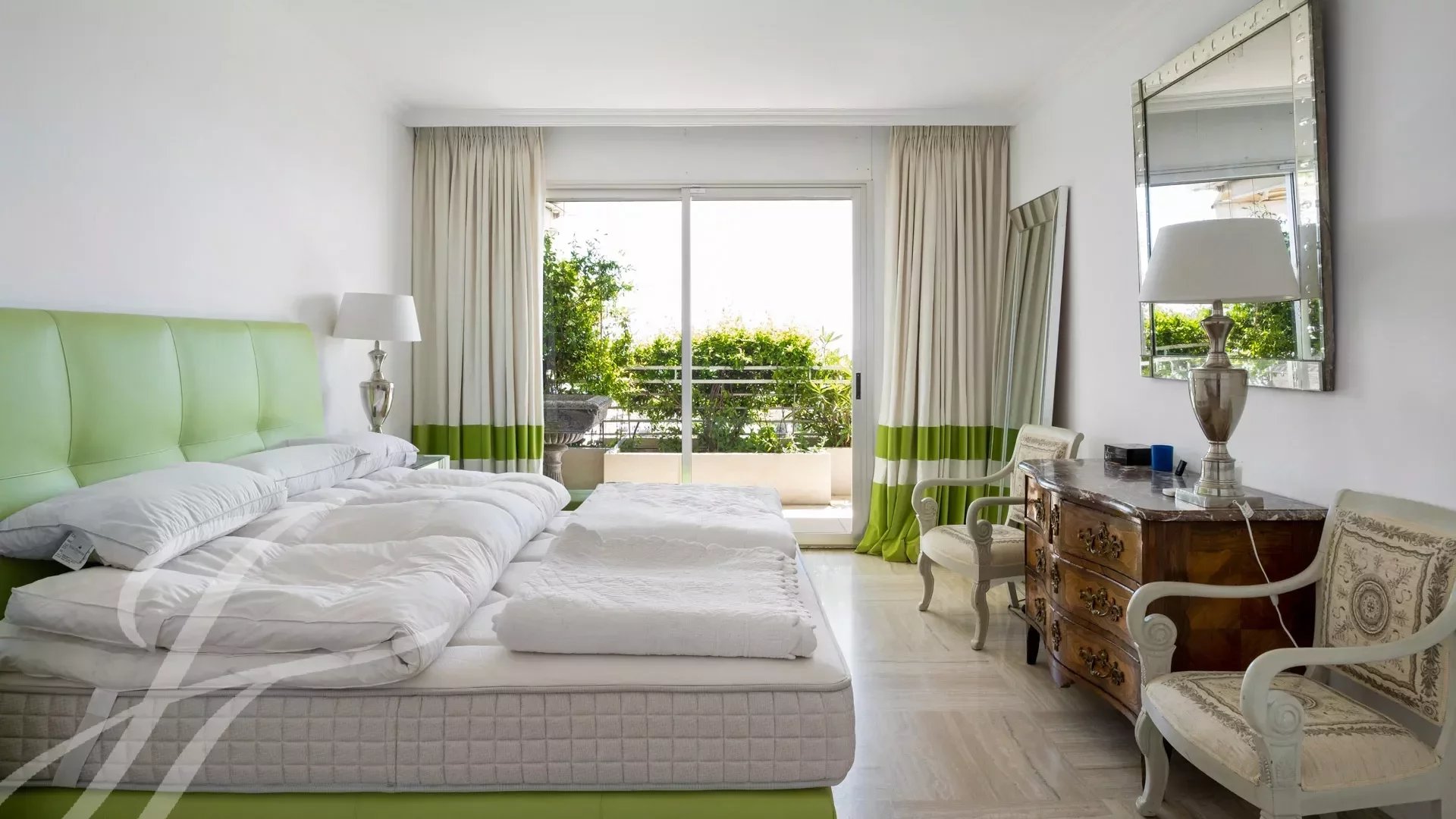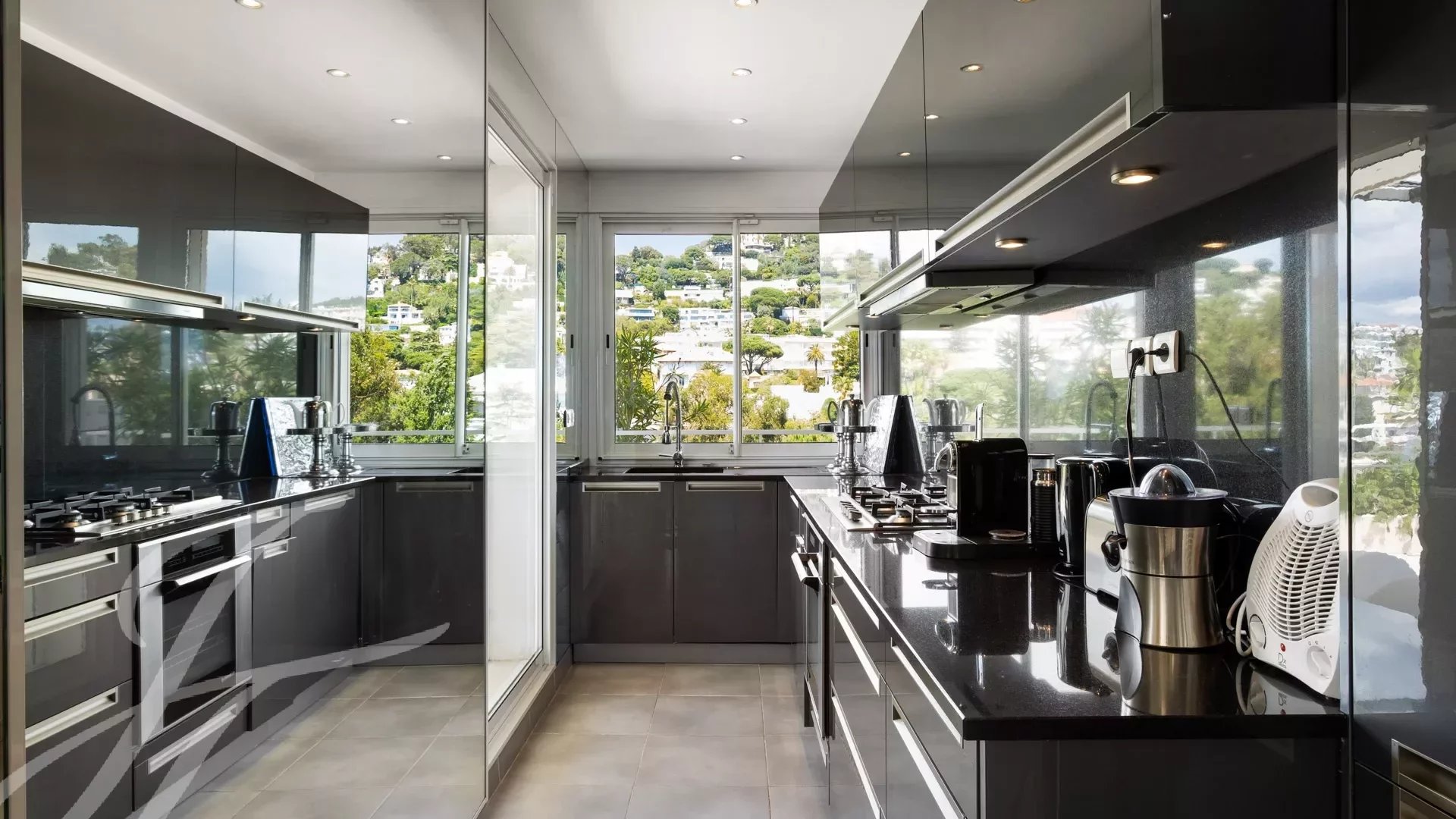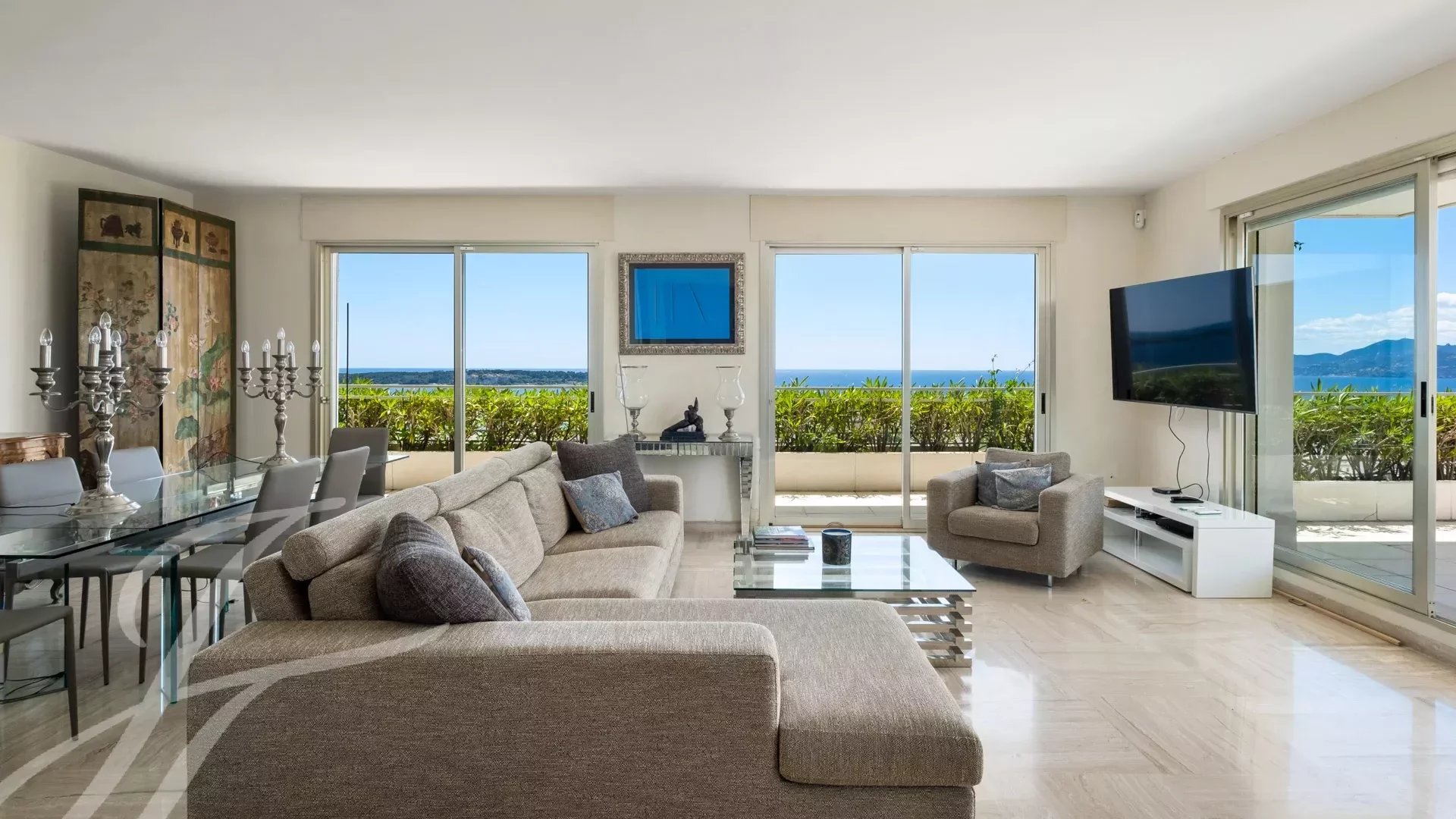 En una residencia de lujo de Basse Californie, este magnífico piso esquinero dispone de una gran terraza con vistas ininterrumpidas al mar, a las islas Lérins, a la bahía de Cannes y a los montes Esterel.