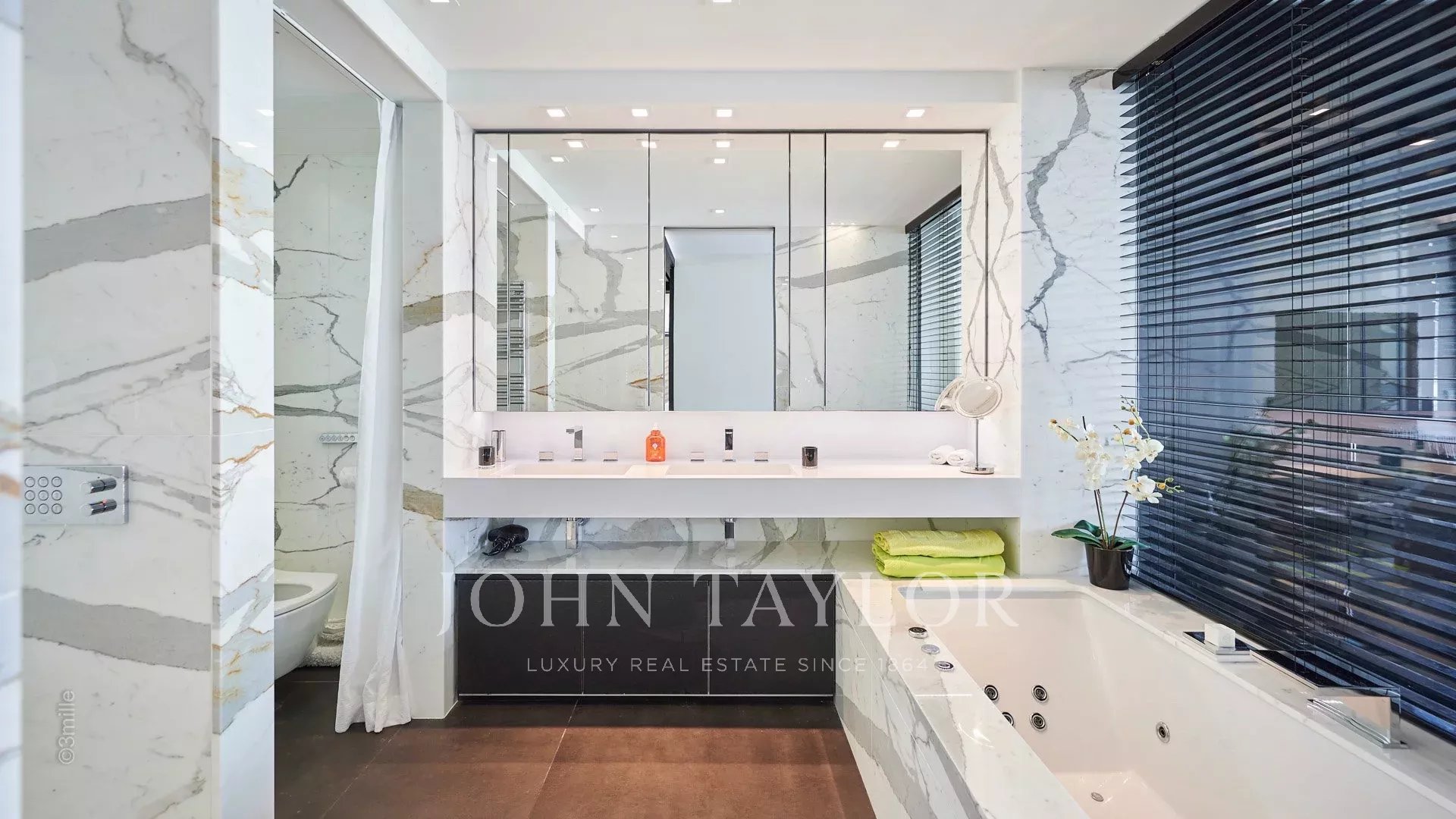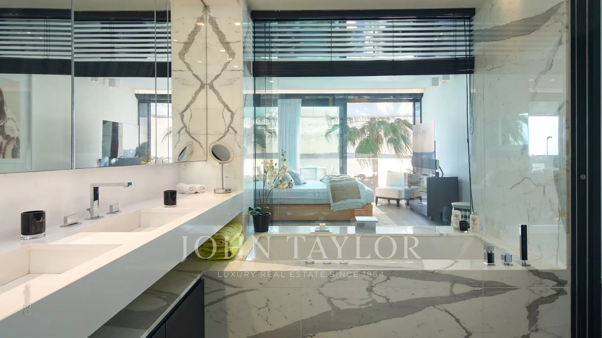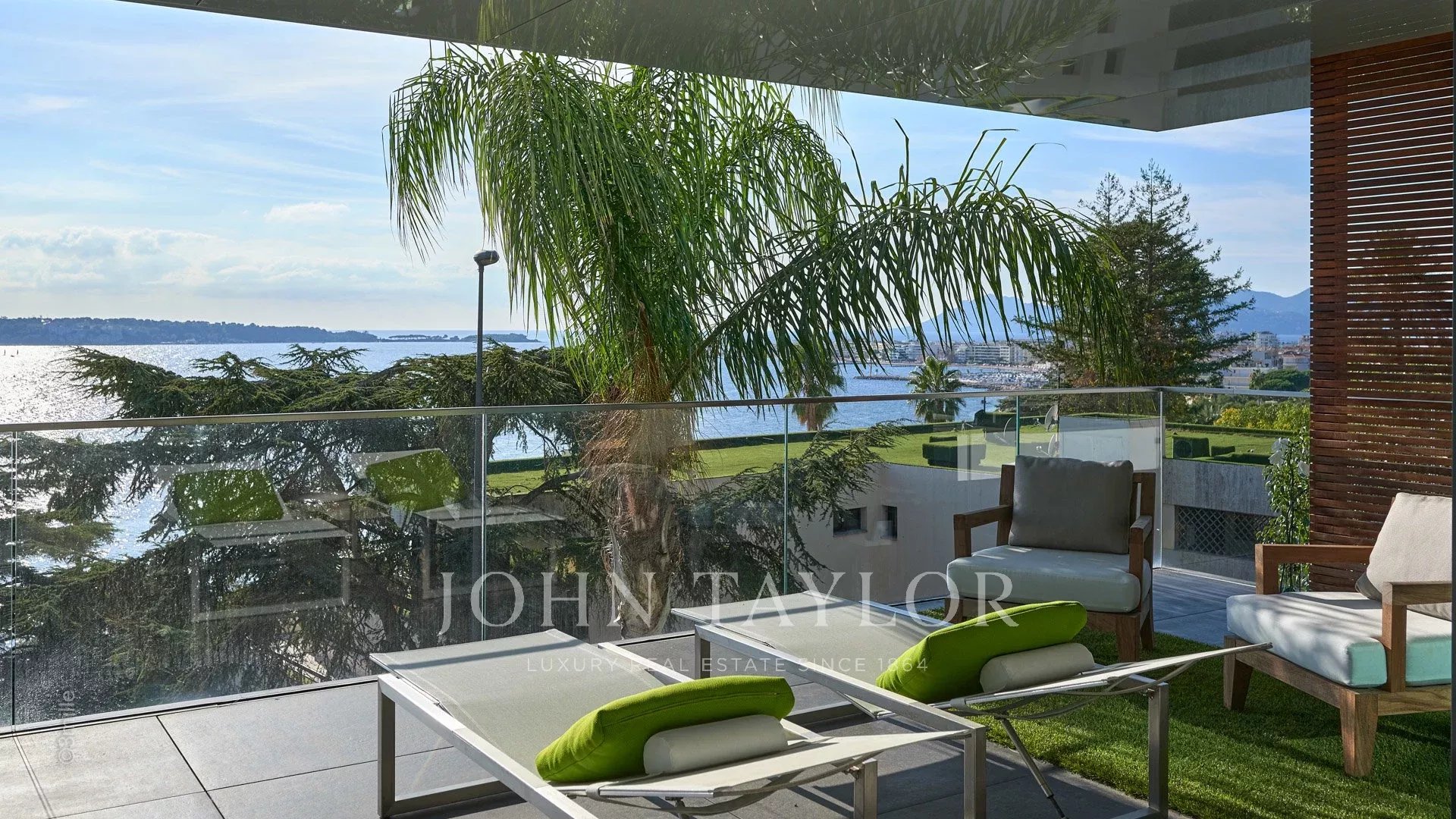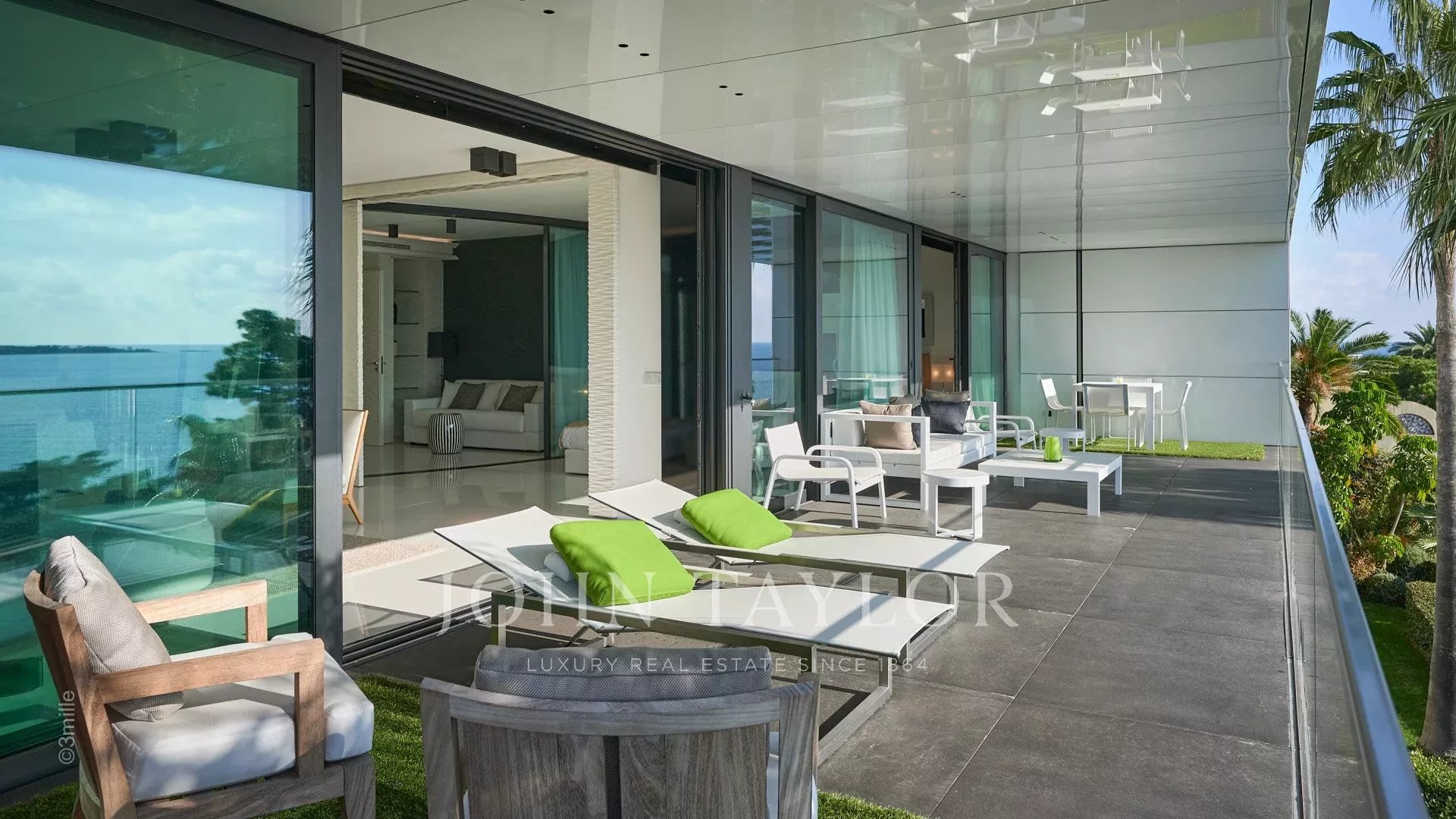 En una nueva residencia de lujo, este magnífico piso de 144 m² se beneficia de una amplia y profunda terraza de 54 m². Orientada al sur, ofrece vistas panorámicas al mar y a las islas Lérins.
