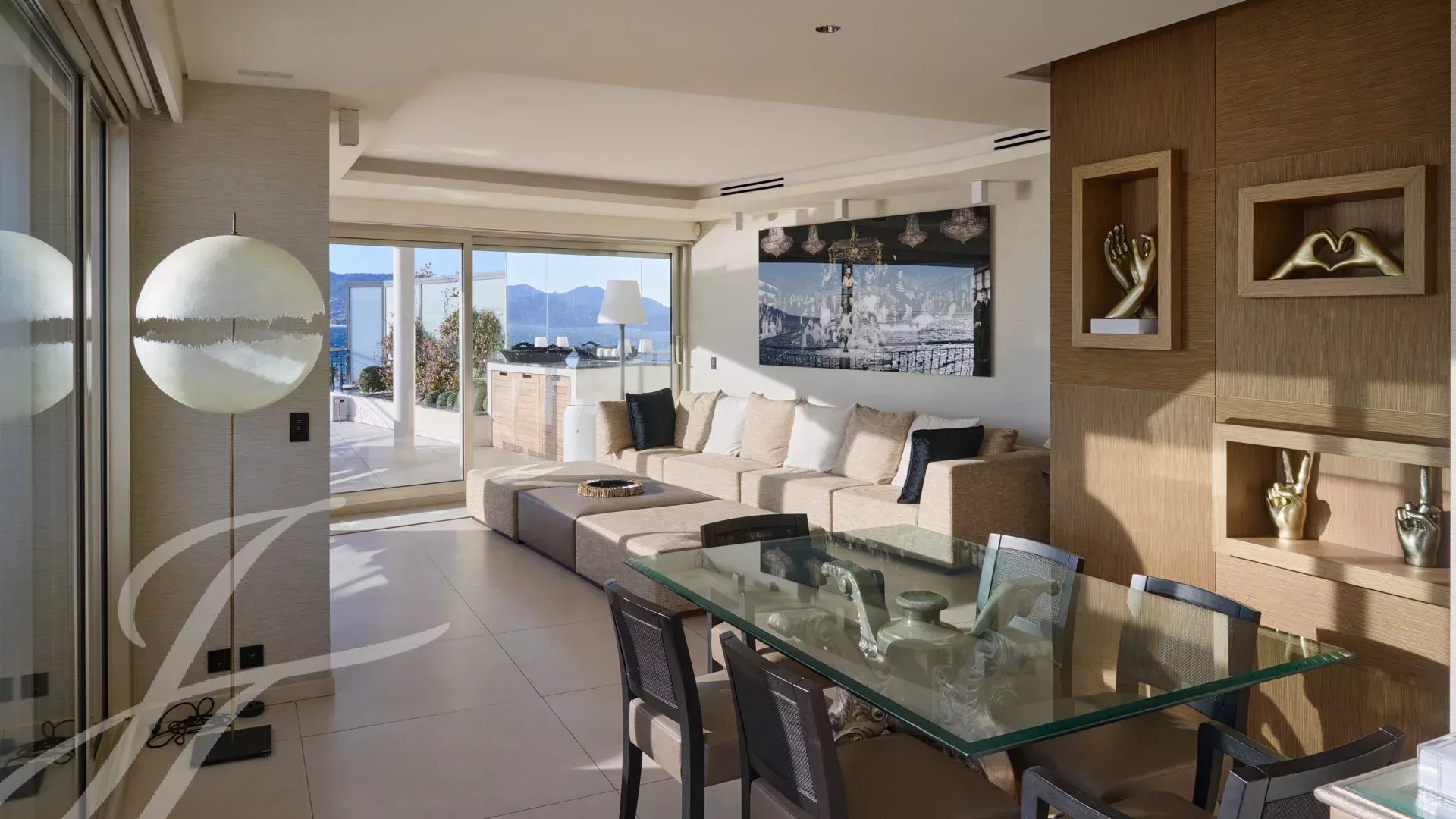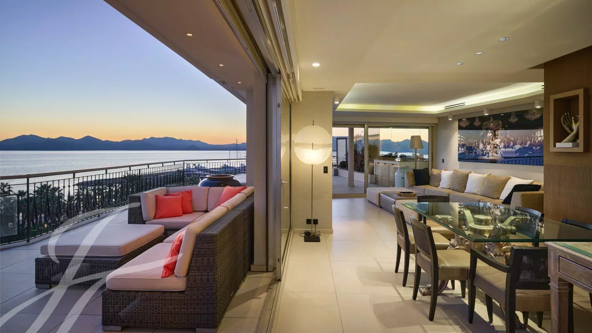 Consta de un amplio salón-comedor con zona de bar y dos bodegas, que se abre a una espectacular terraza de 156 m² con impresionantes vistas sobre Port Canto, Palm Beach, la bahía de Cannes y las islas Lérins. La cocina cerrada, totalmente equipada, tiene acceso a una segunda terraza. El piso tiene cuatro dormitorios, incluyendo un dormitorio principal con baño en suite y ducha, y acceso a la terraza con vistas al mar. Otro dormitorio con cuarto de ducha en suite, y dos dormitorios más que comparten un cuarto de ducha.