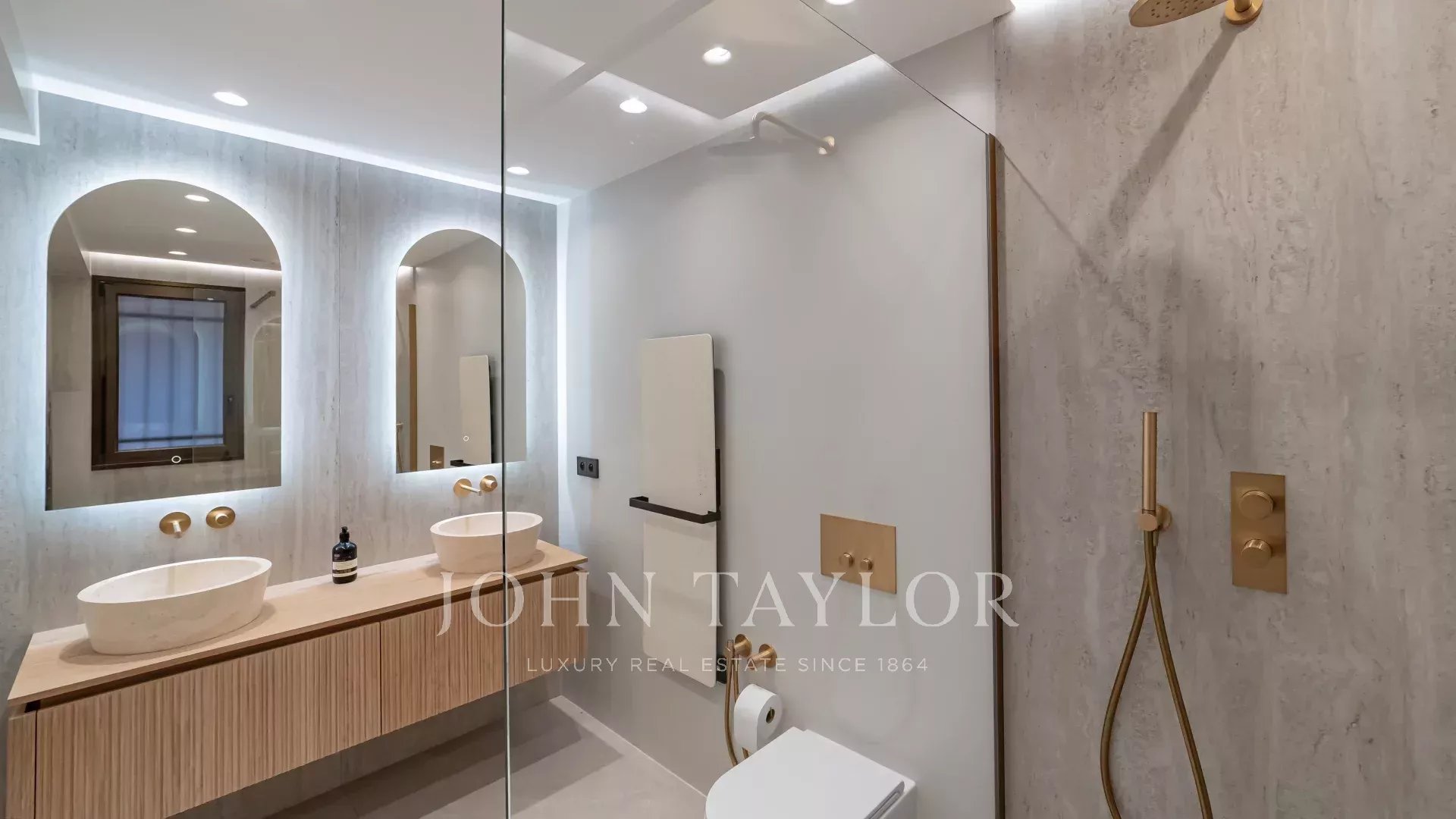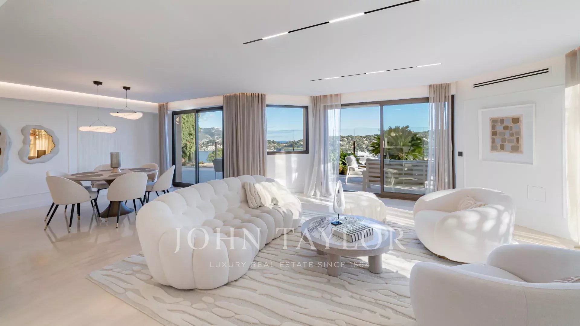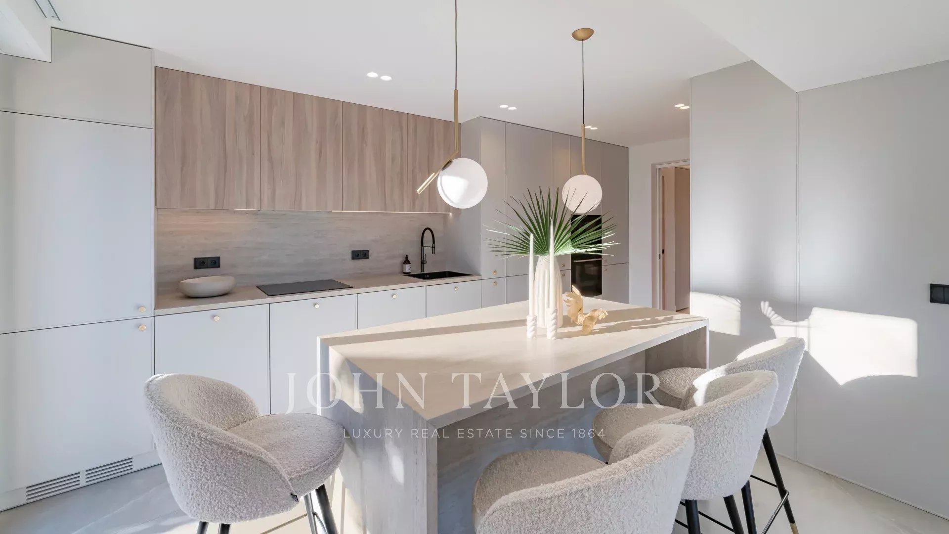 Una de las características más destacadas de este apartamento es su aire acondicionado, esencial para disfrutar del clima cálido de la Riviera Francesa sin renunciar al confort. La sala principal está llena de luz natural gracias a sus grandes ventanales que se abren a un balcón espacioso, perfecto para cenas al aire libre o simplemente relajarse mientras se contempla la belleza del entorno.