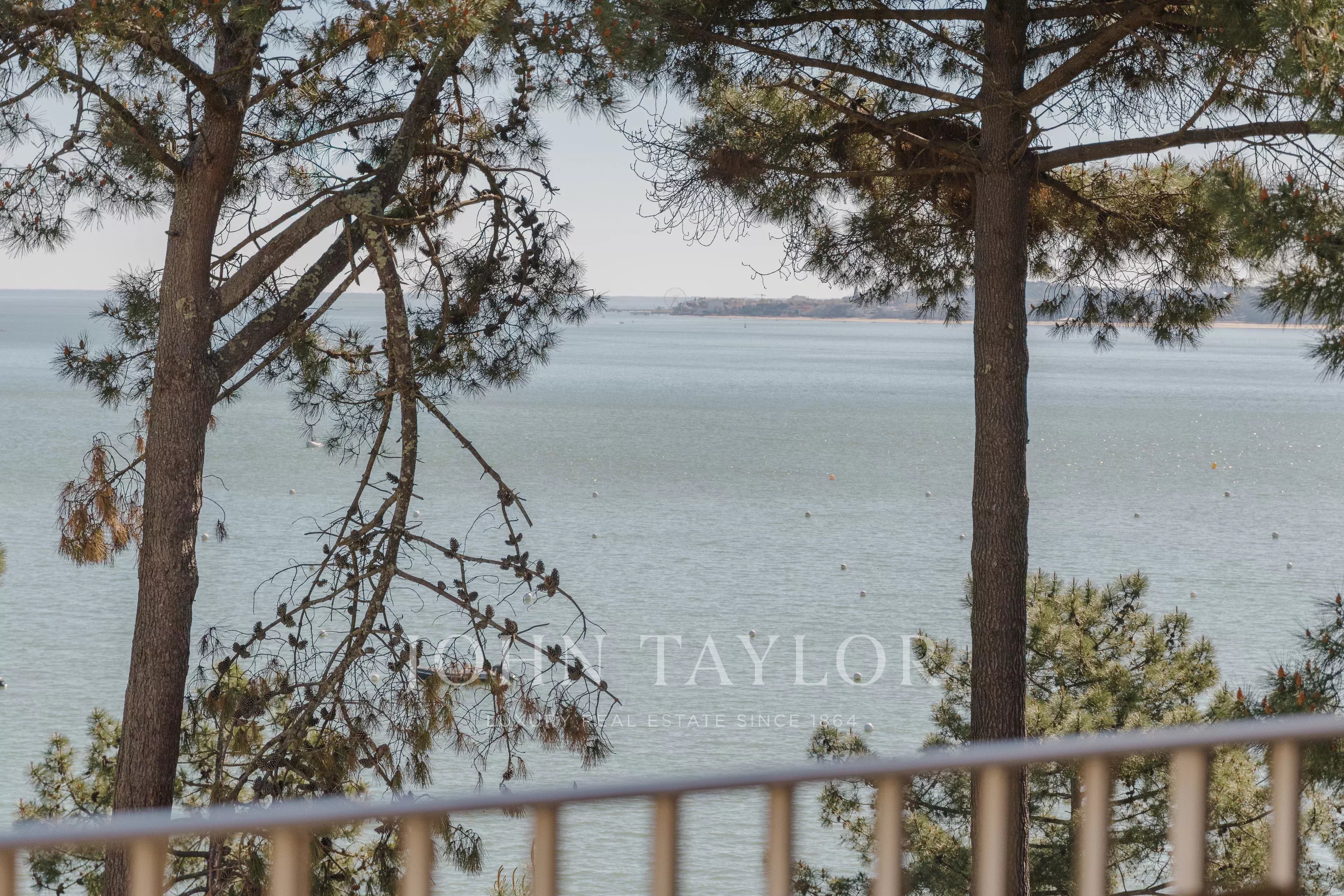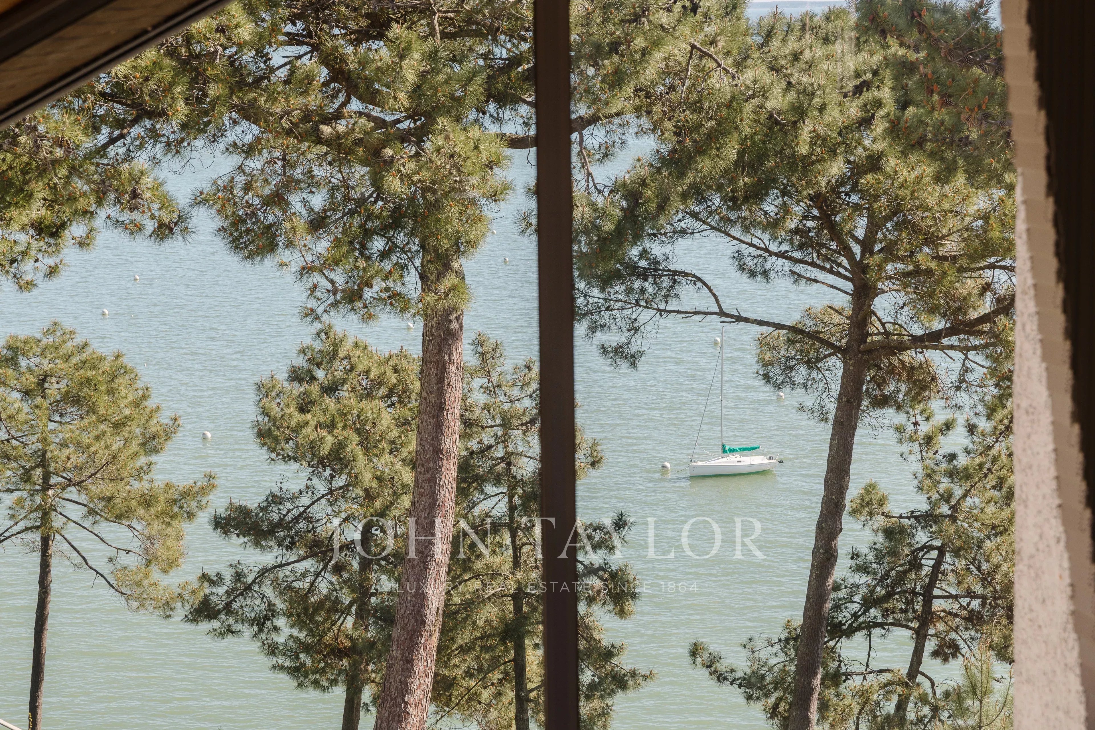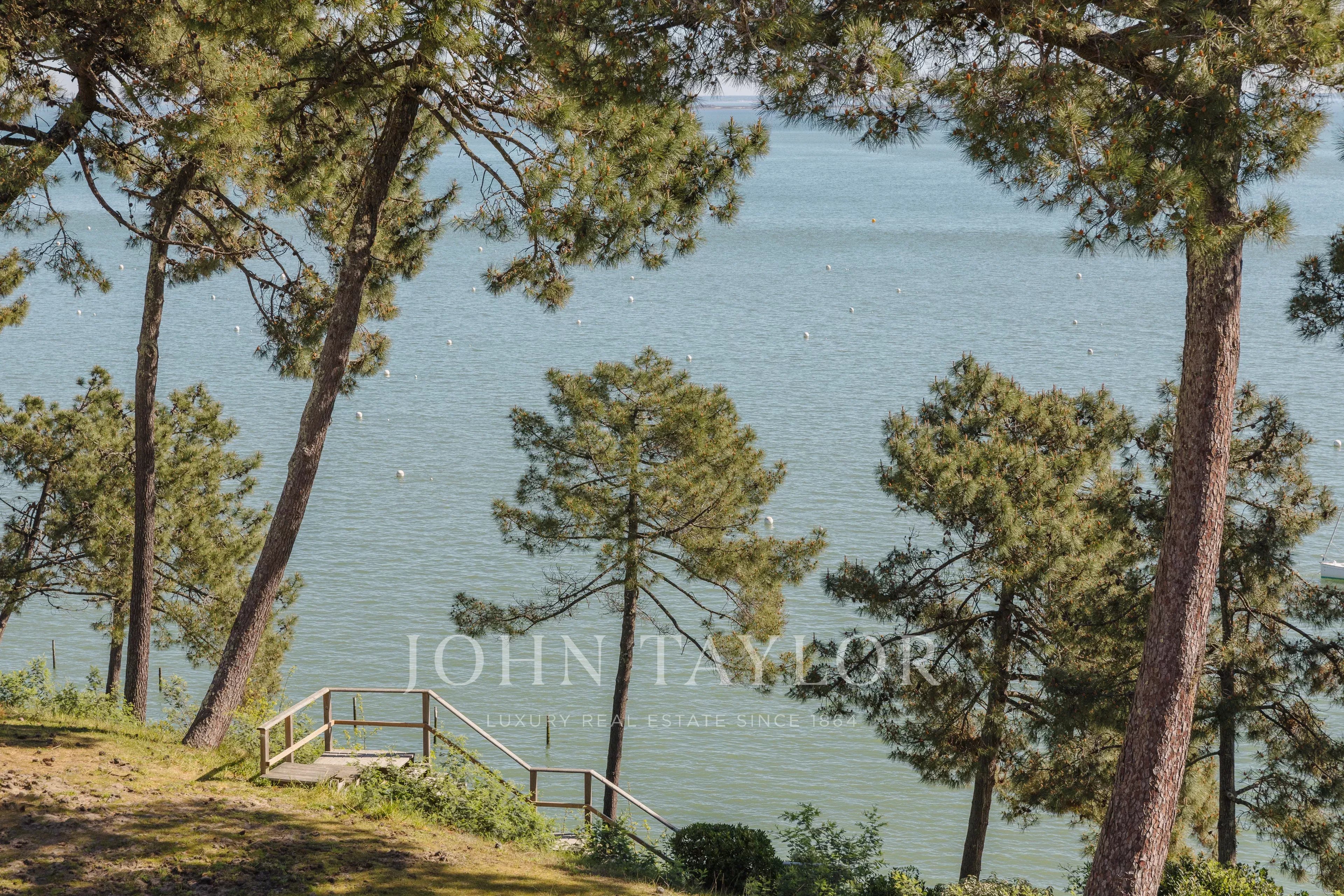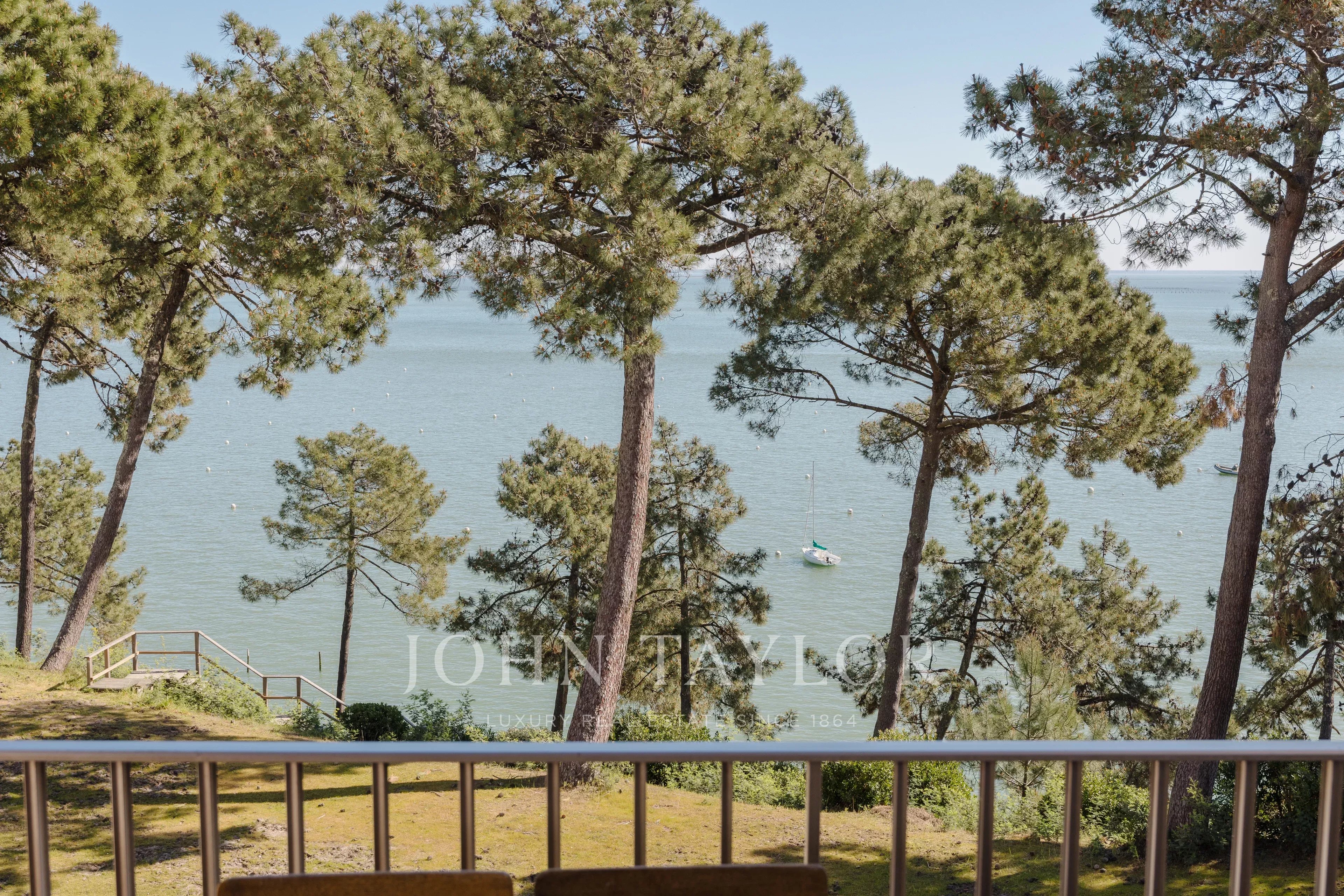 La terraza, punto culminante de la propiedad, ofrece una vista panorámica absolutamente única de las aguas del Estanque, la Isla de los Pájaros y la Duna del Pilat.